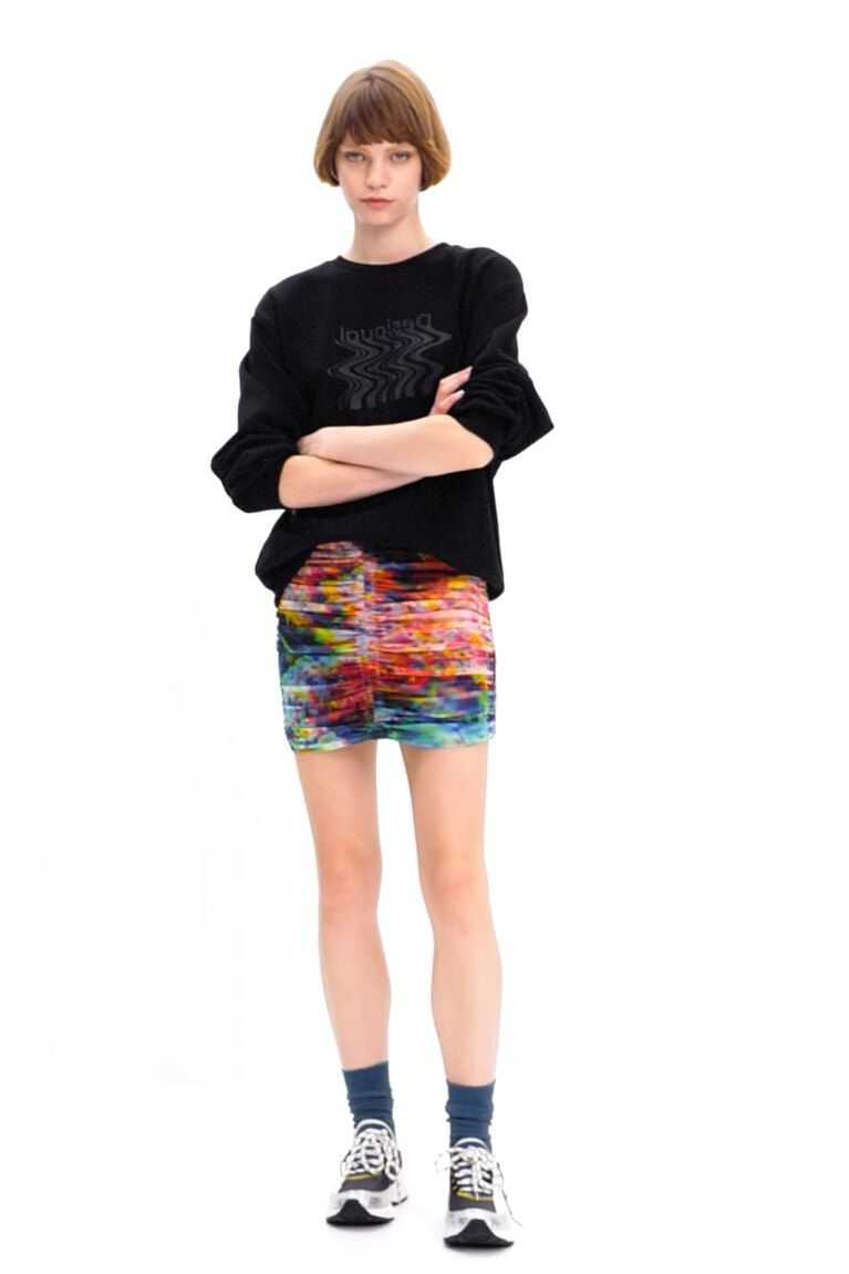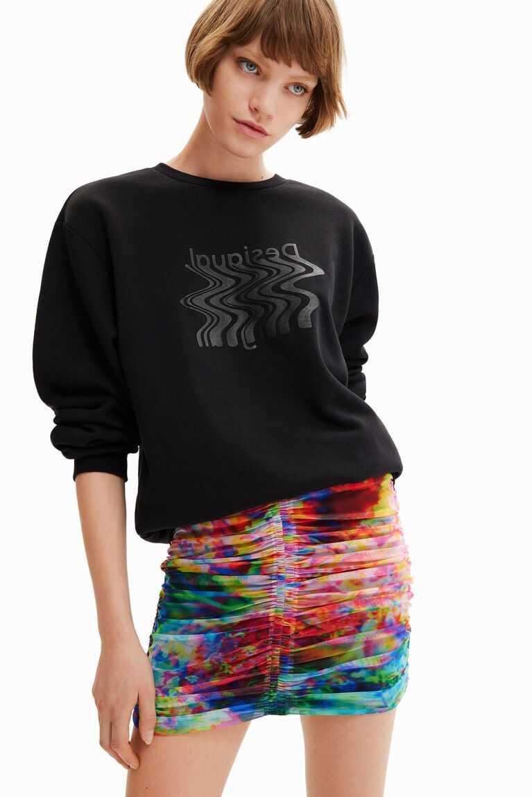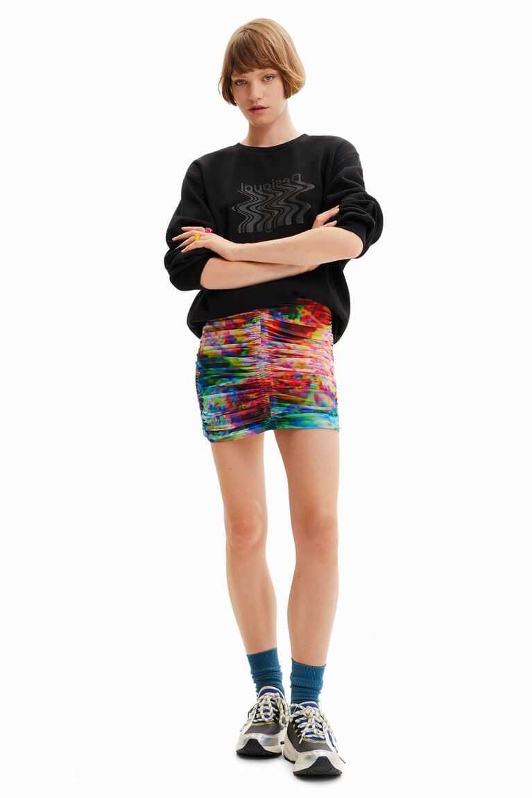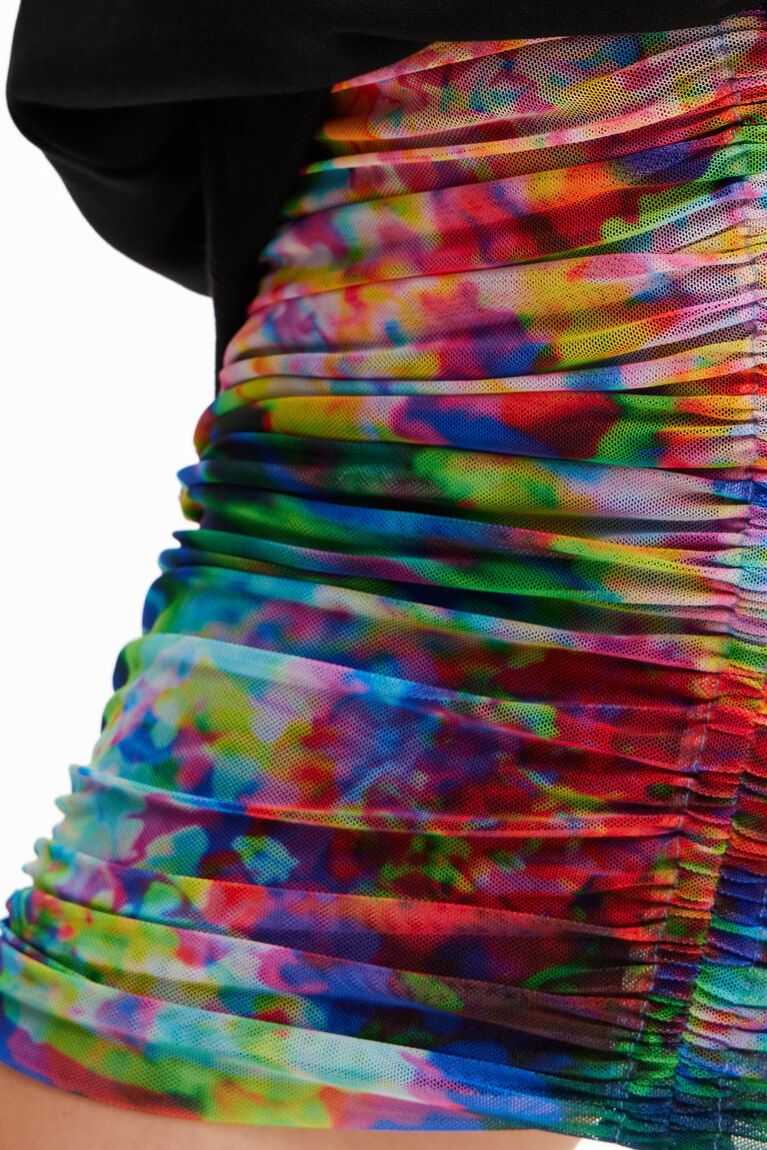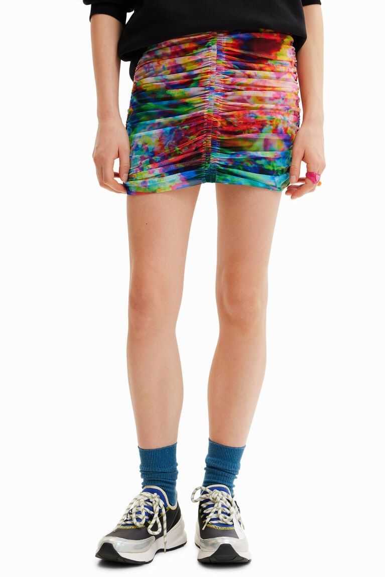 A fitted mini skirt in stretch tulle with draped-effect ruching. Featuring a floral print.