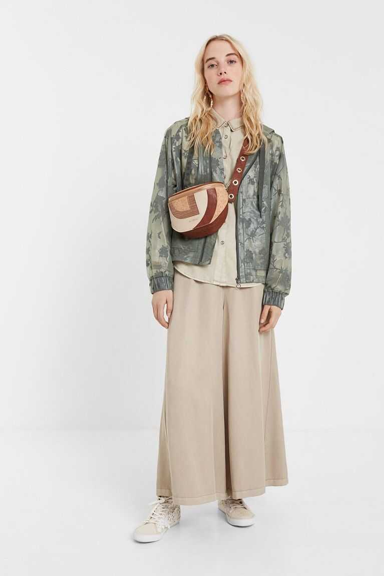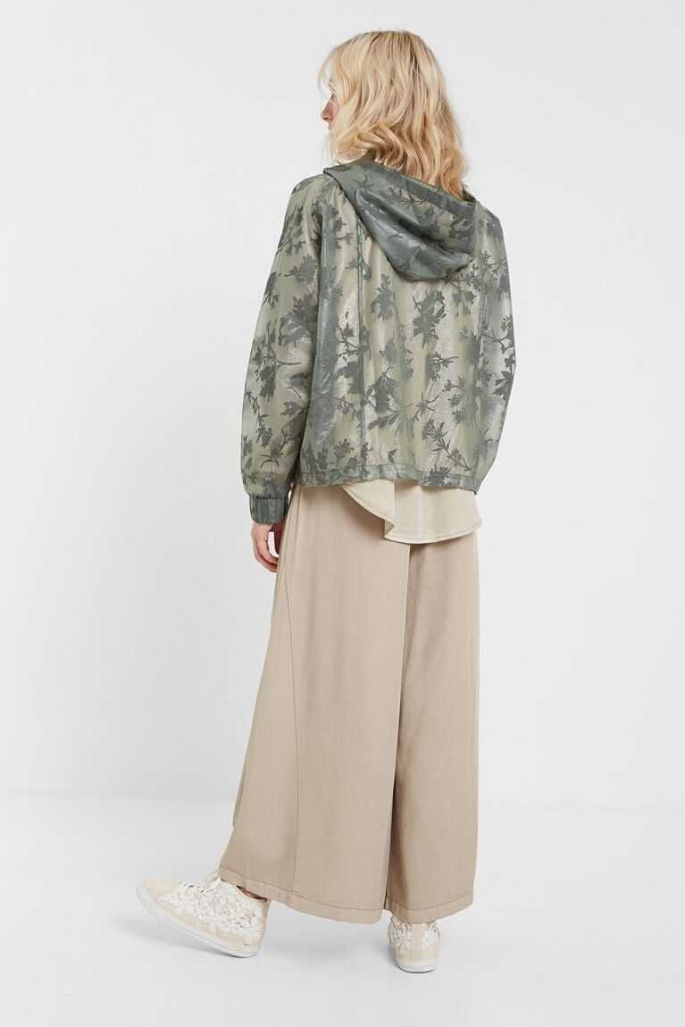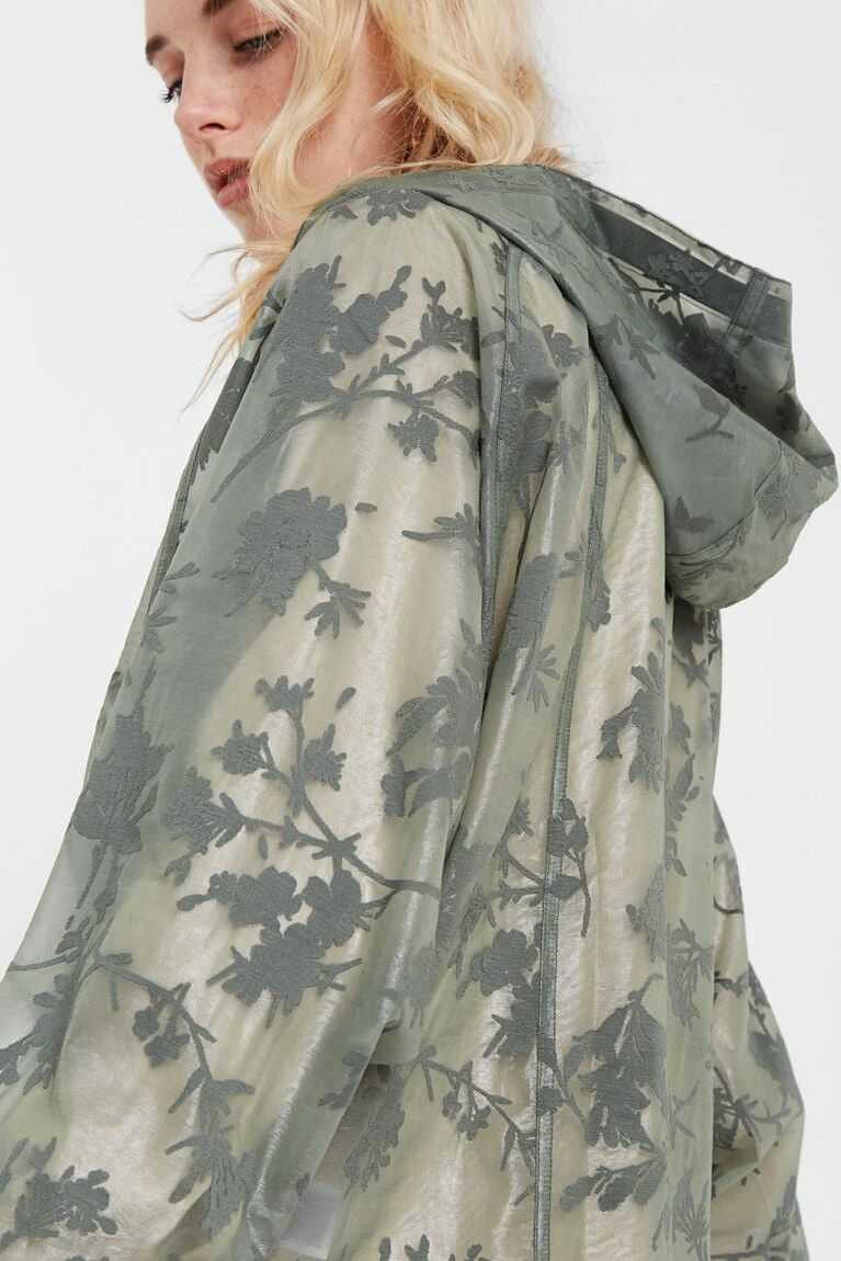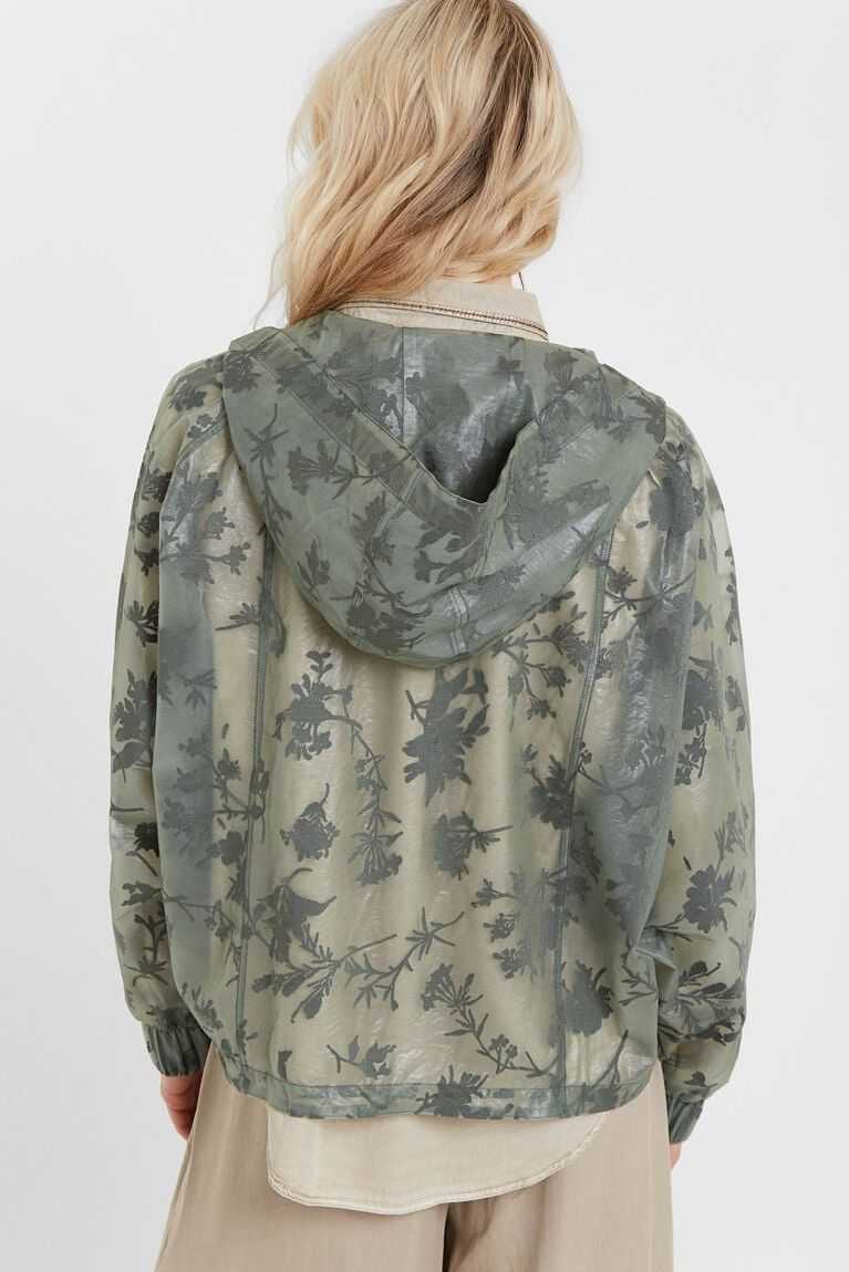 An athletic garment to practice sport or for your everyday life. A transparent sports jacket with dark green floral print on green in devor