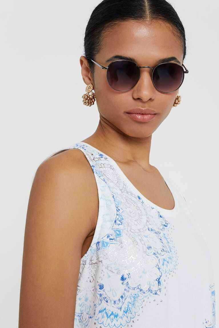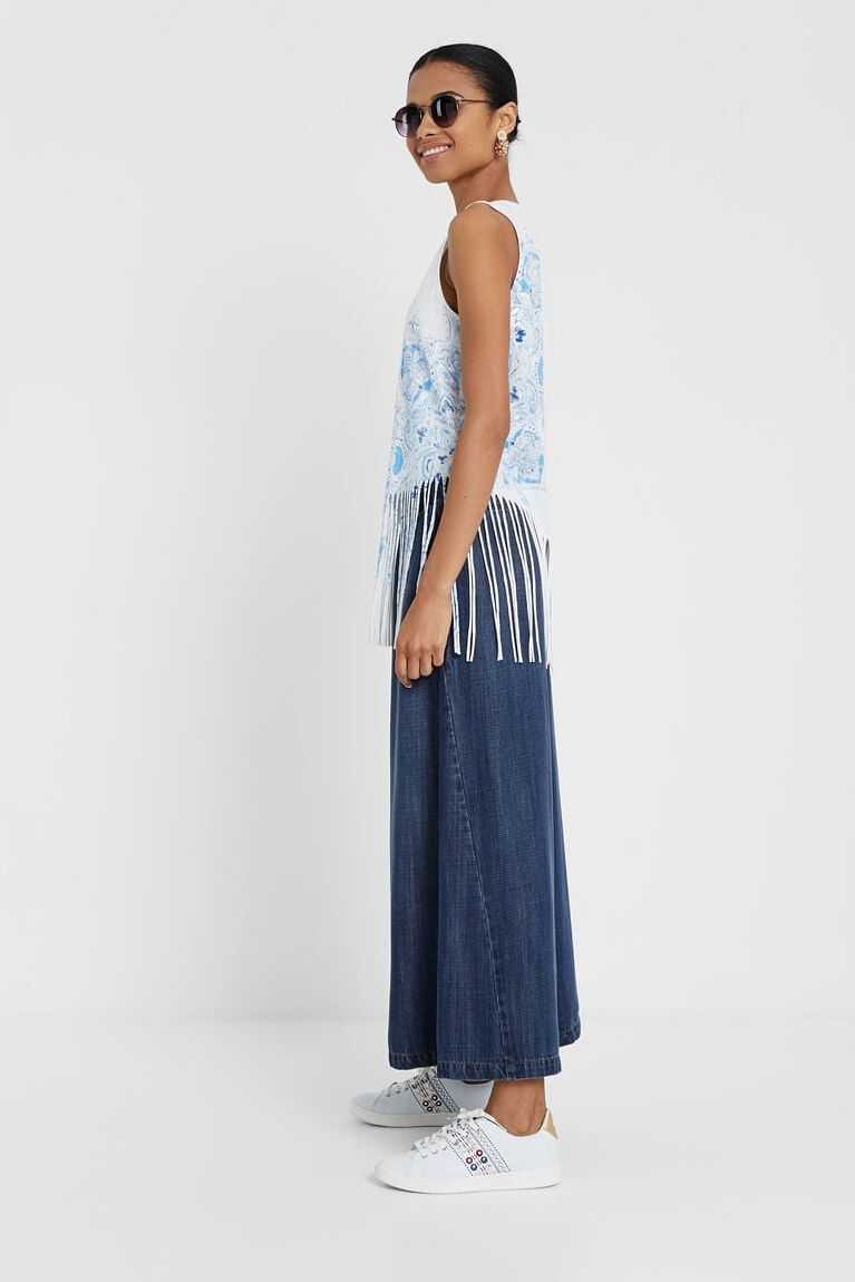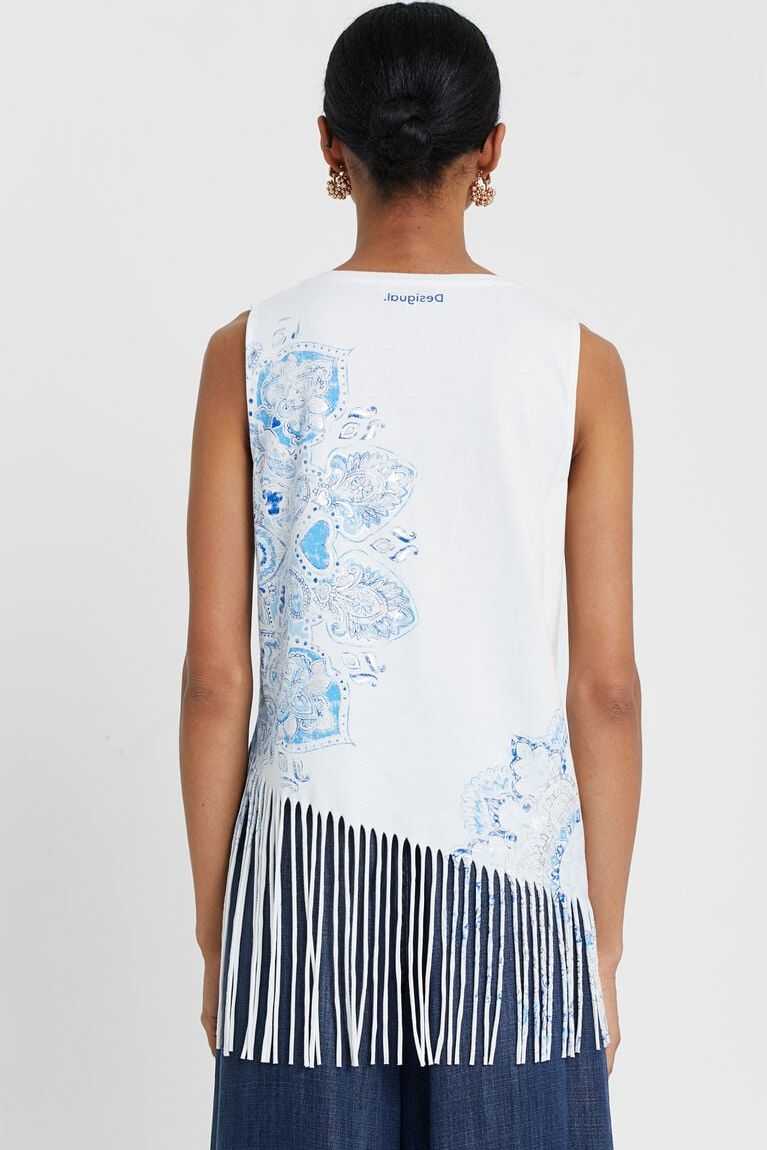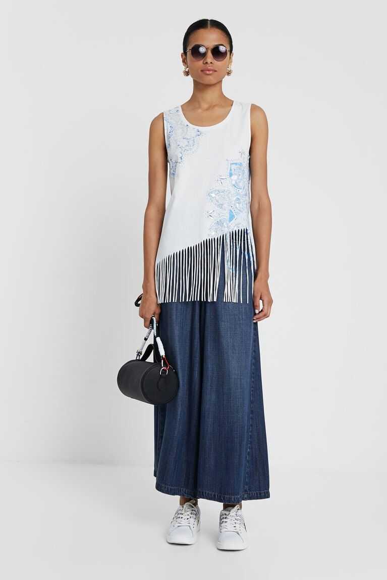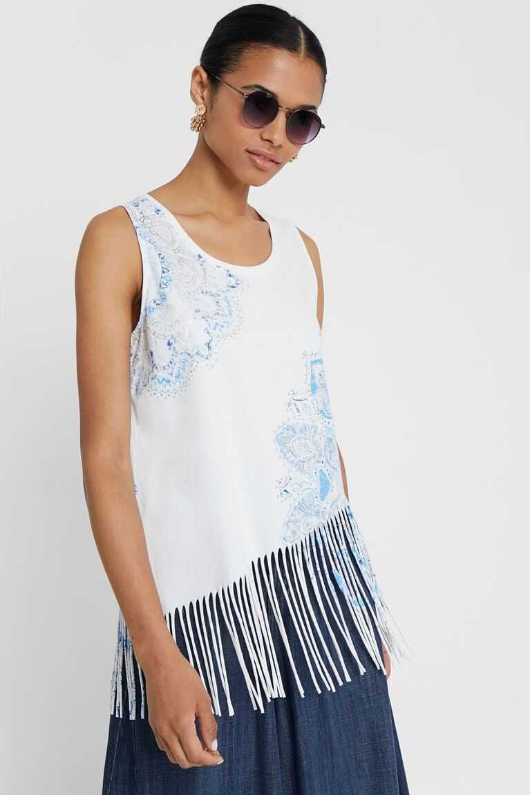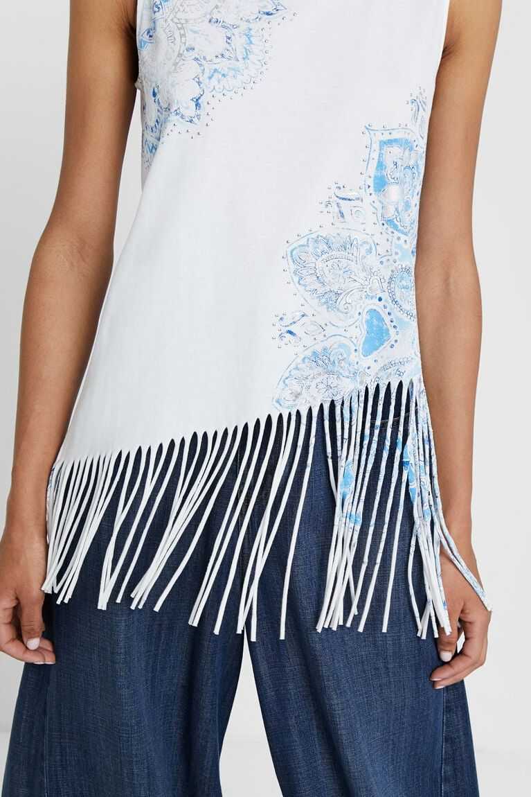 The eighties have come back with this tank-top with diagonally cut fringe that has lots of movement and a fun and original character. Its print of mandalas with matching beads will give that touch of colour that will make this T-shirt one of your favourites.
