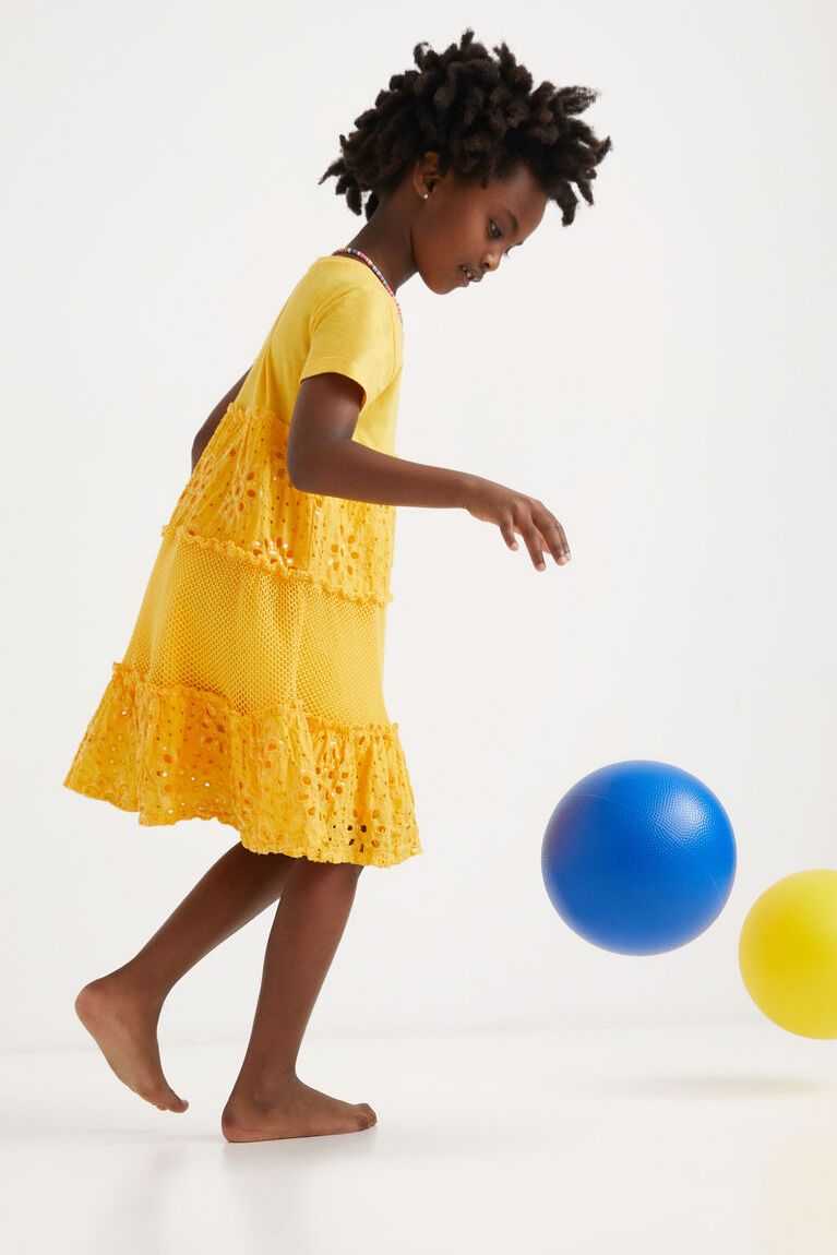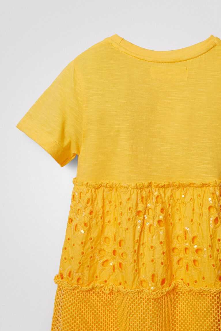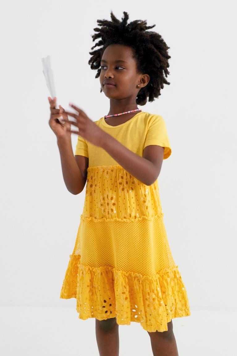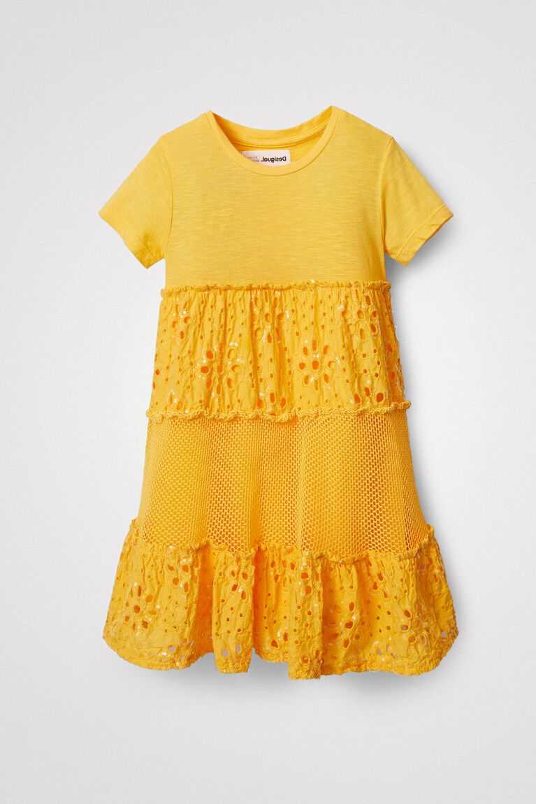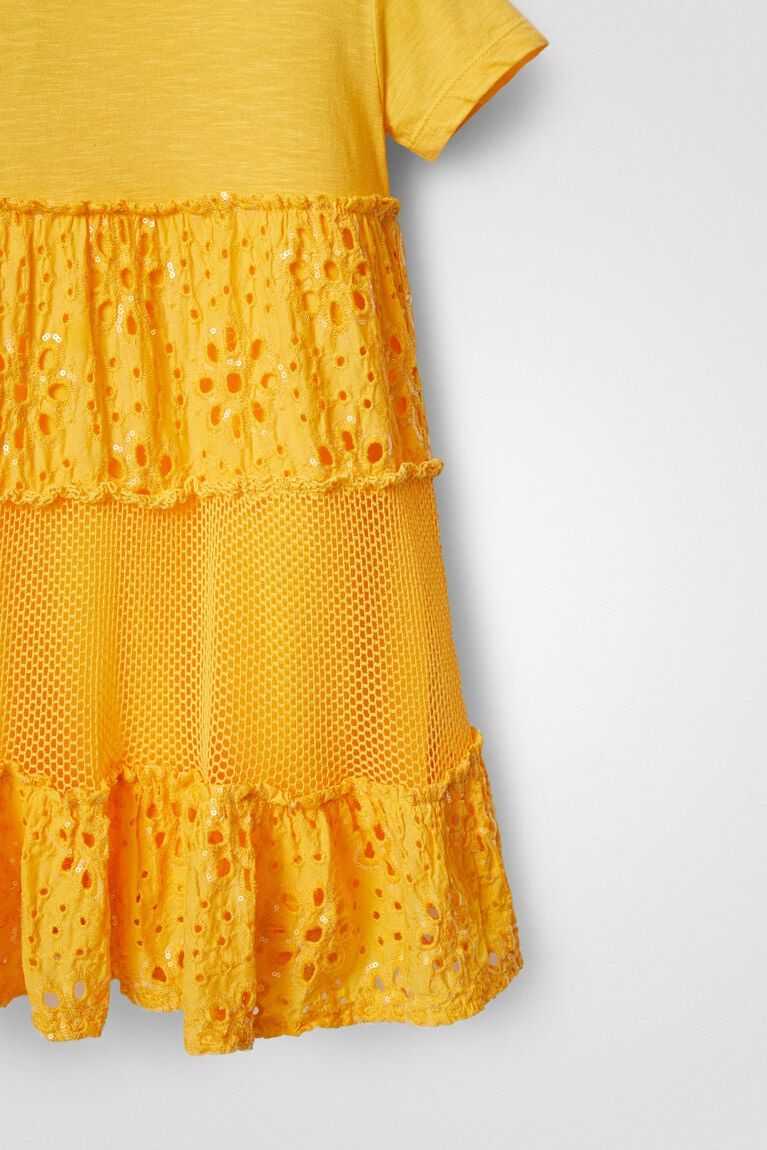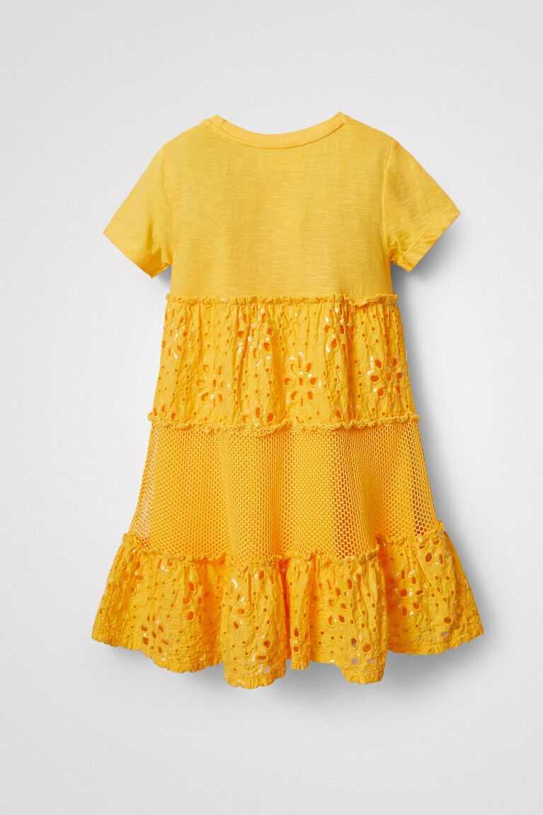 Swiss embroidery, mesh and cotton patchwork on a mustard yellow flounce dress made from organic cotton.