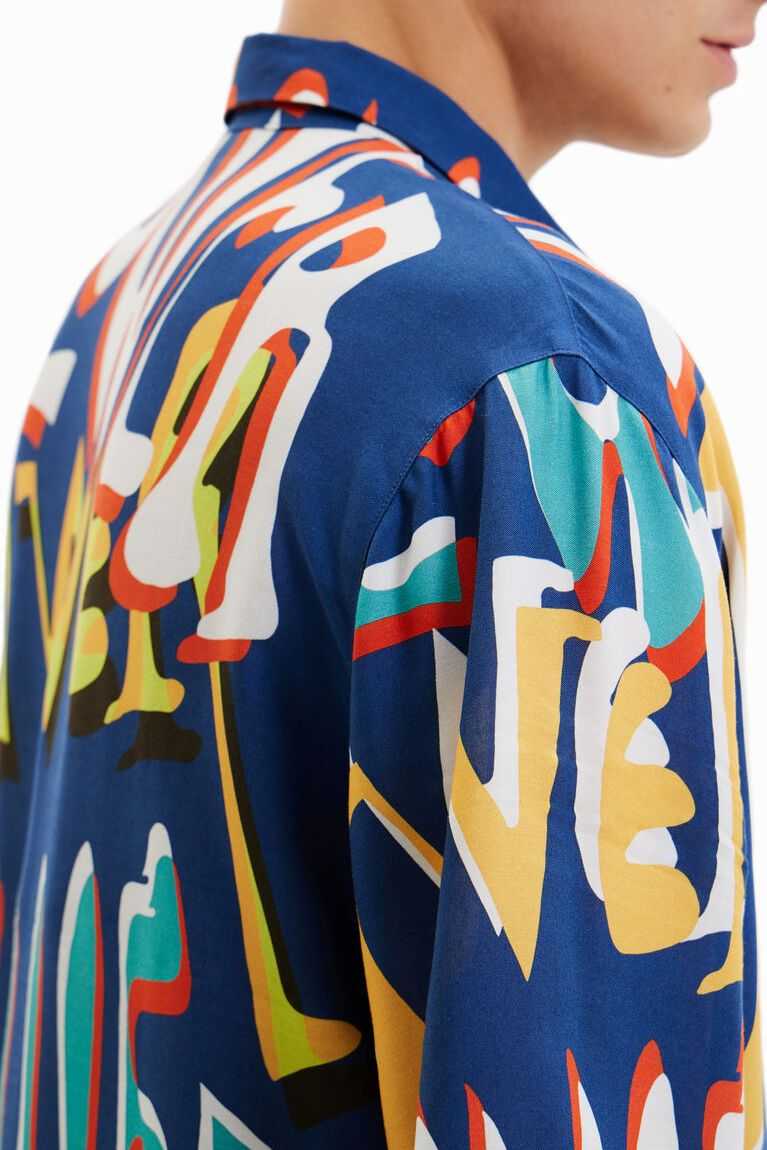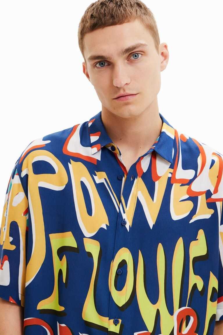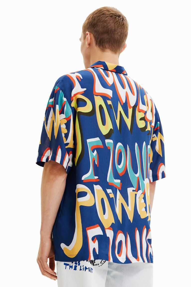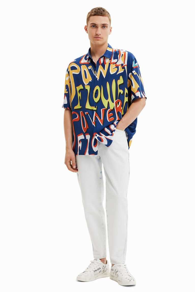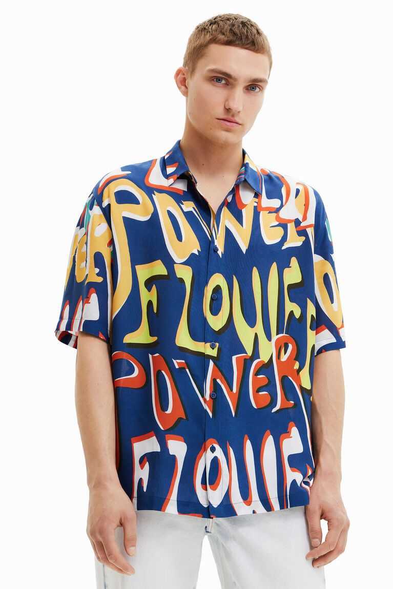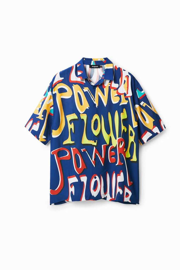 A short-sleeve resort shirt, made from eco-friendly fibres, featuring an all-over print with a giant multicoloured "Flower Power" message.