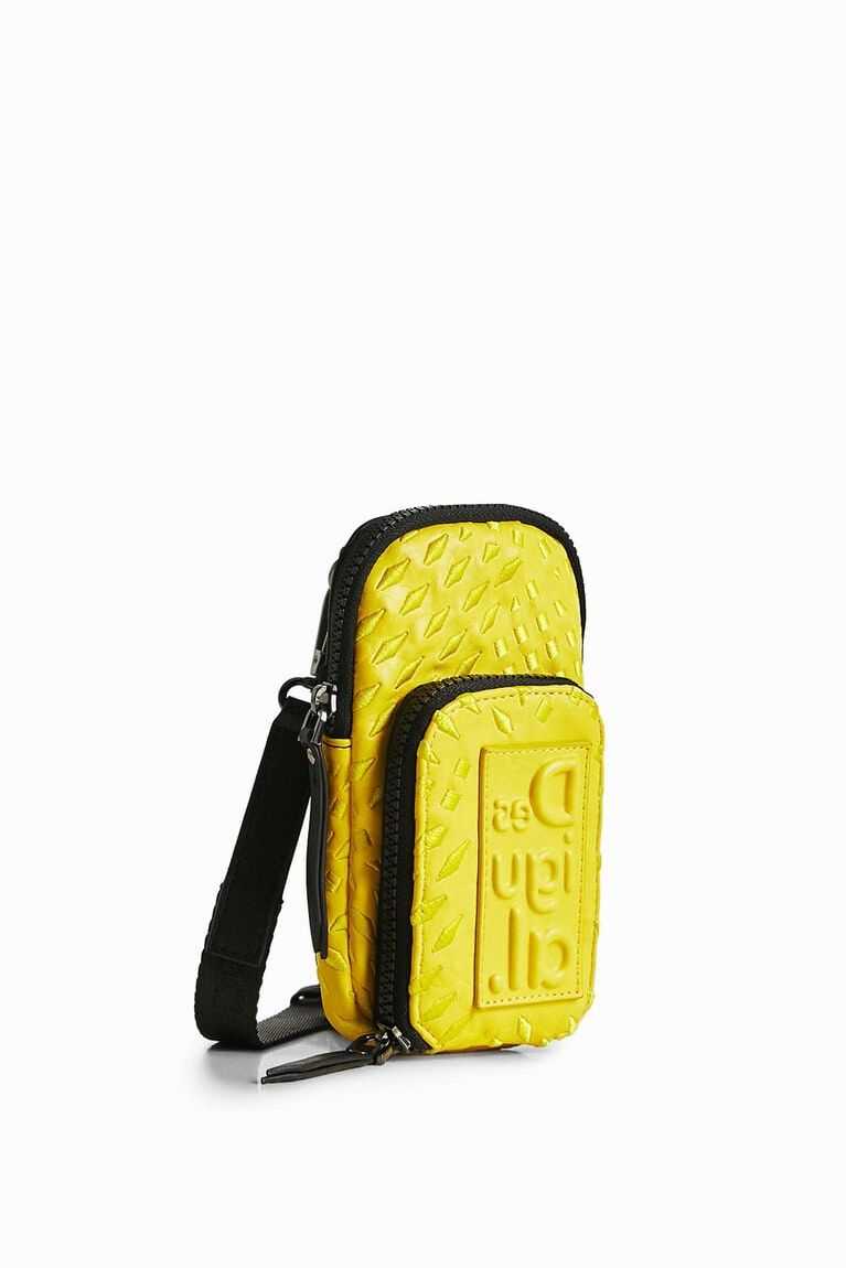 A smartphone pouch with an embossed geometric texture and a large logo on the front. Features multiple pockets and a large fabric strap with logo.