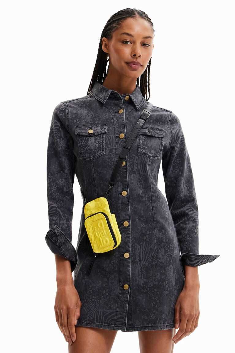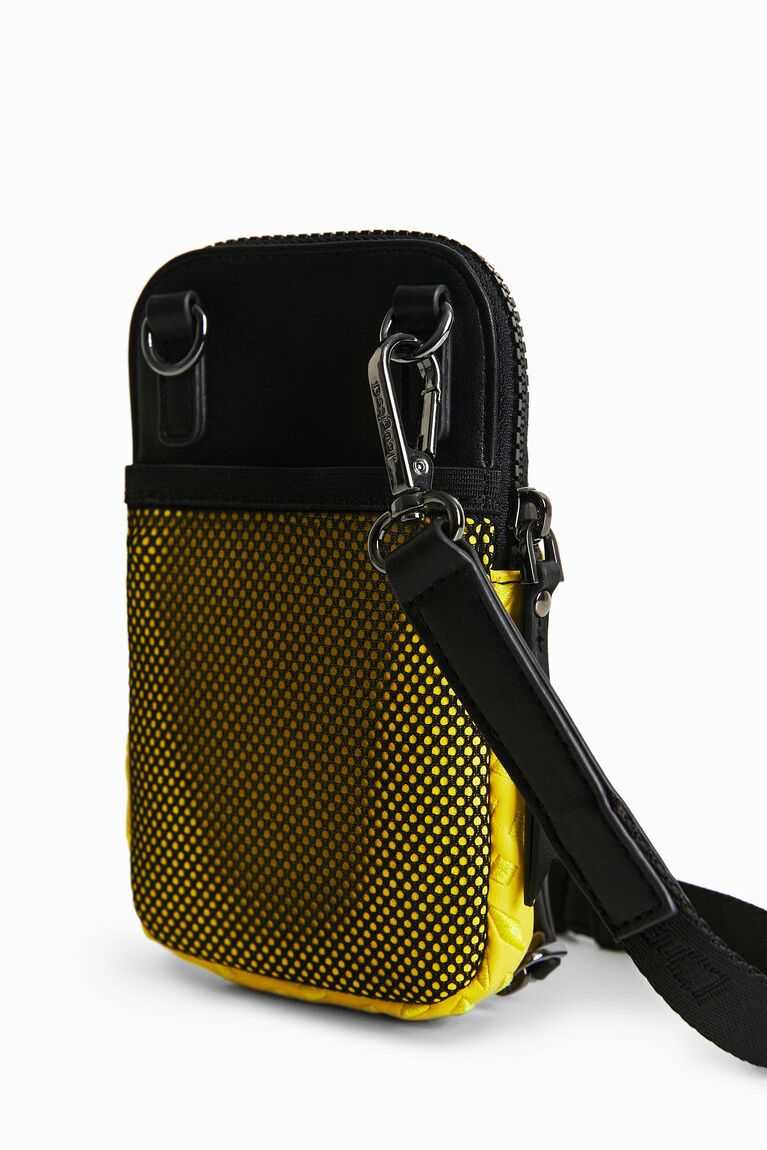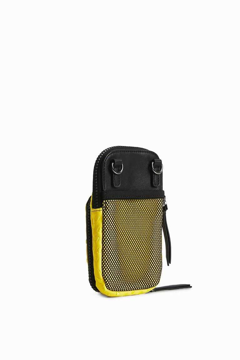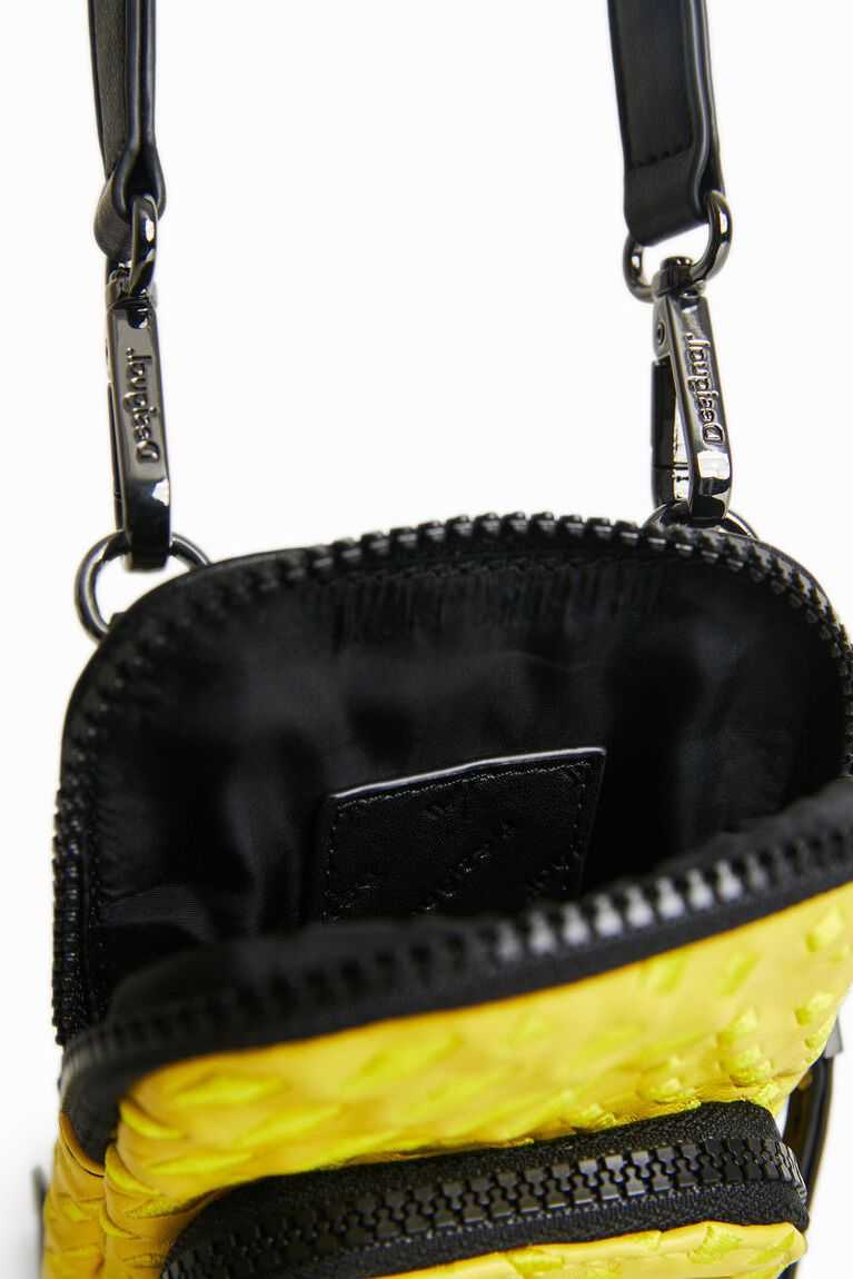 A smartphone pouch with an embossed geometric texture and a large logo on the front. Features multiple pockets and a large fabric strap with logo.