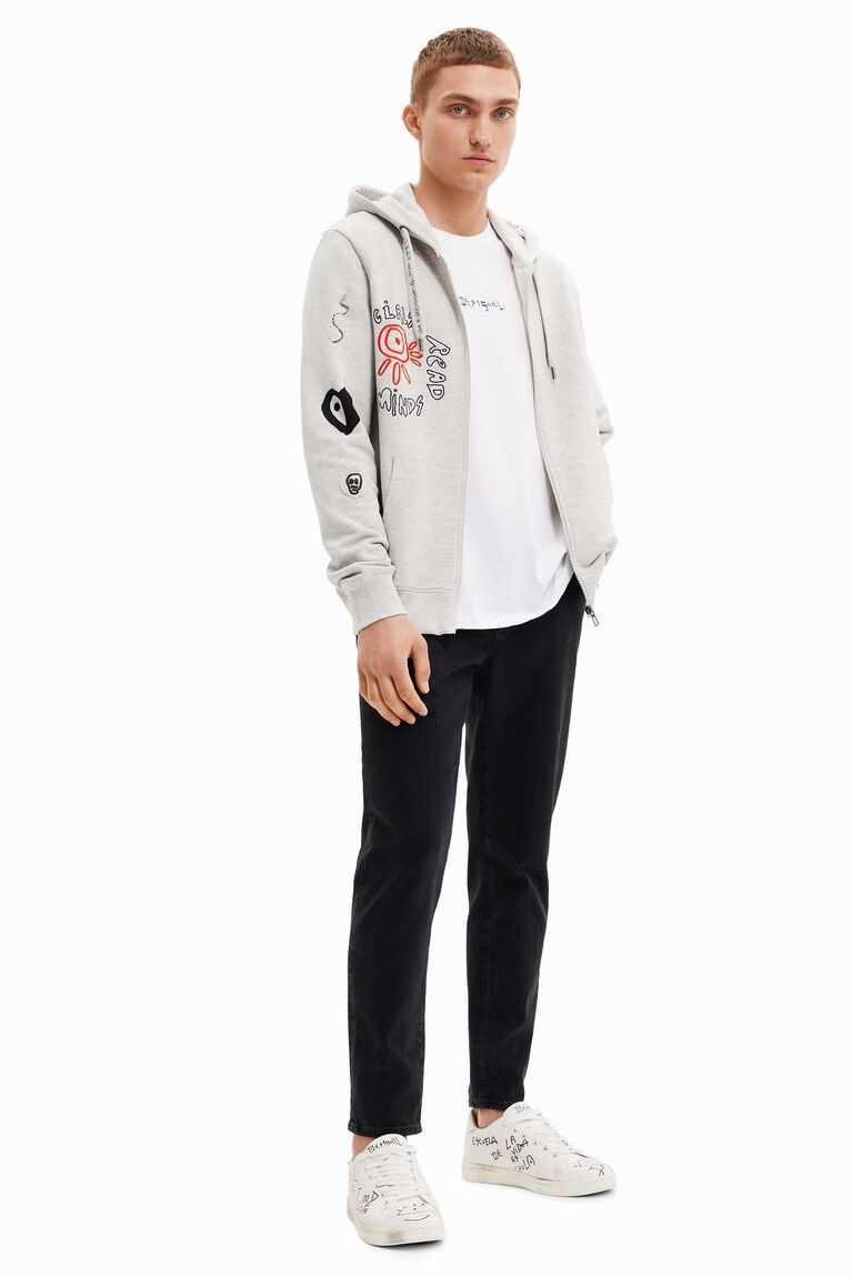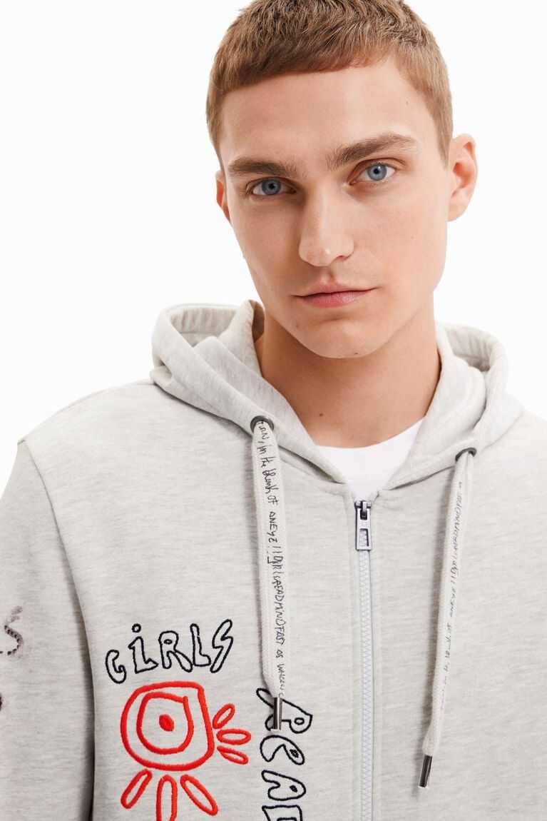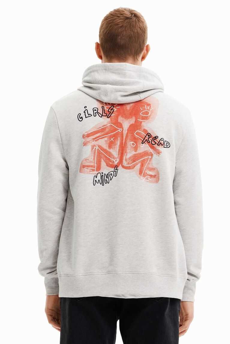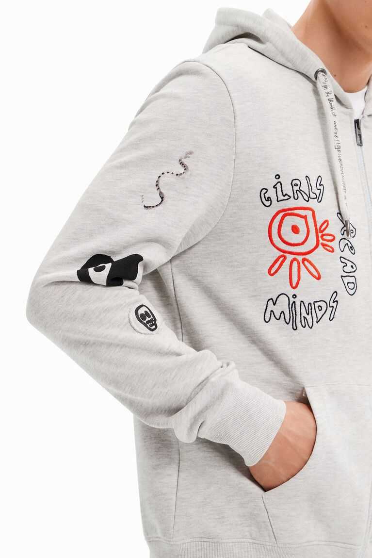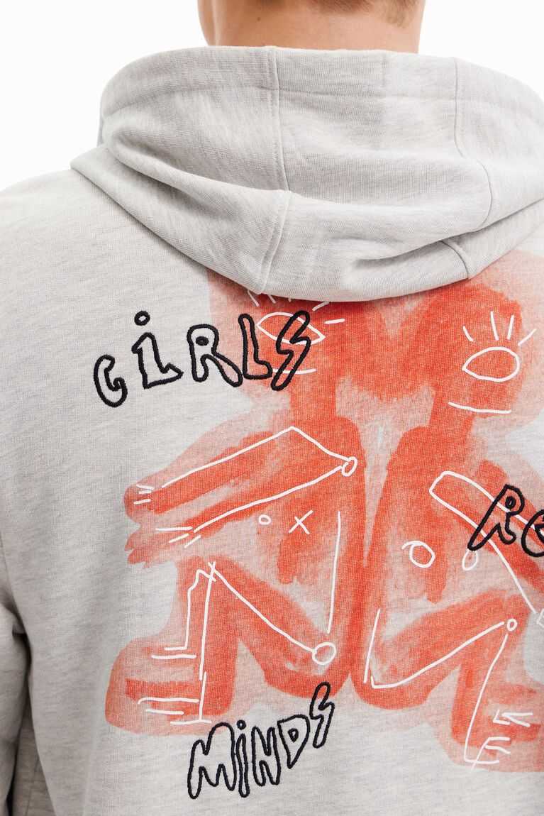 A grey cotton zip-up hoodie with a washed look, an embroidered "Girls read minds" message and a graffiti-style print on the back.