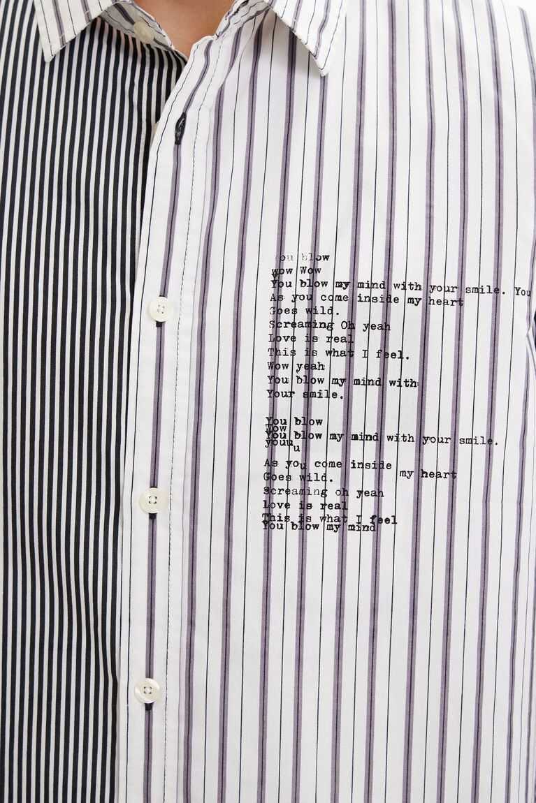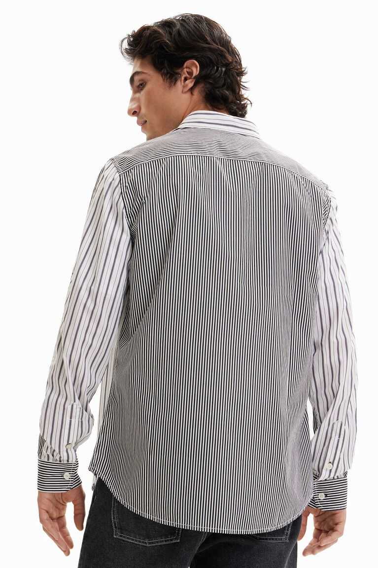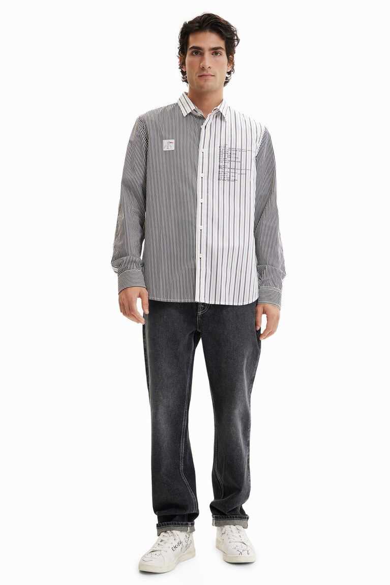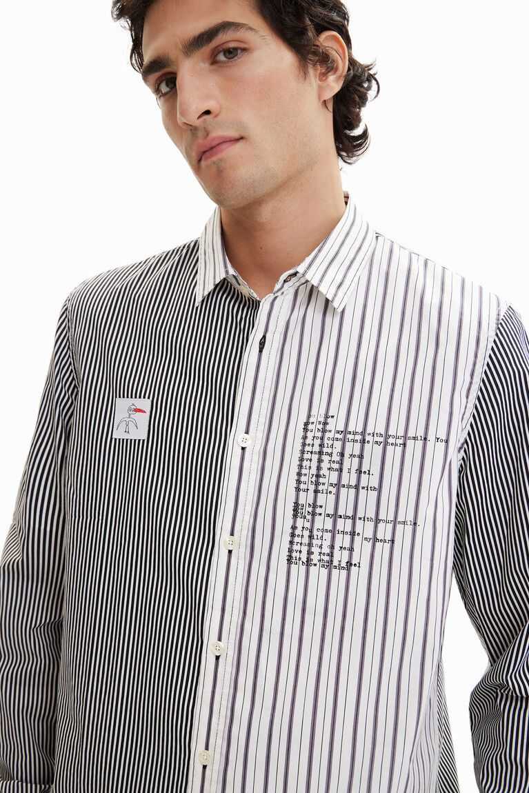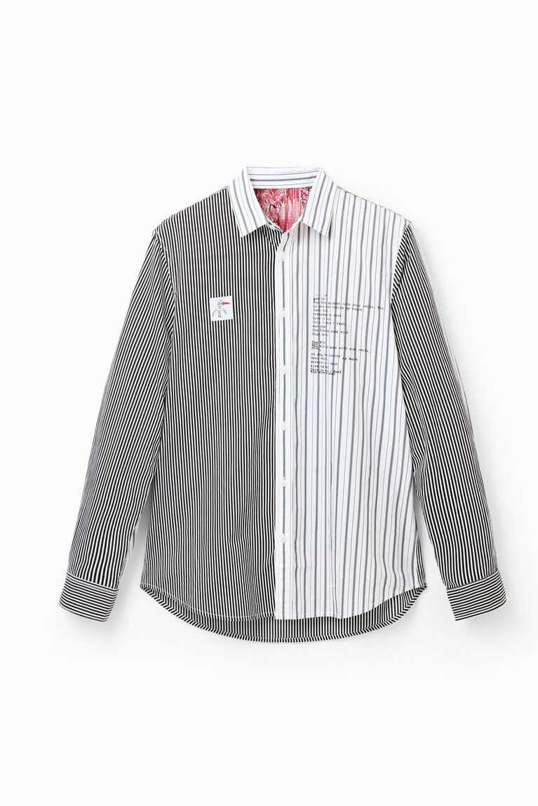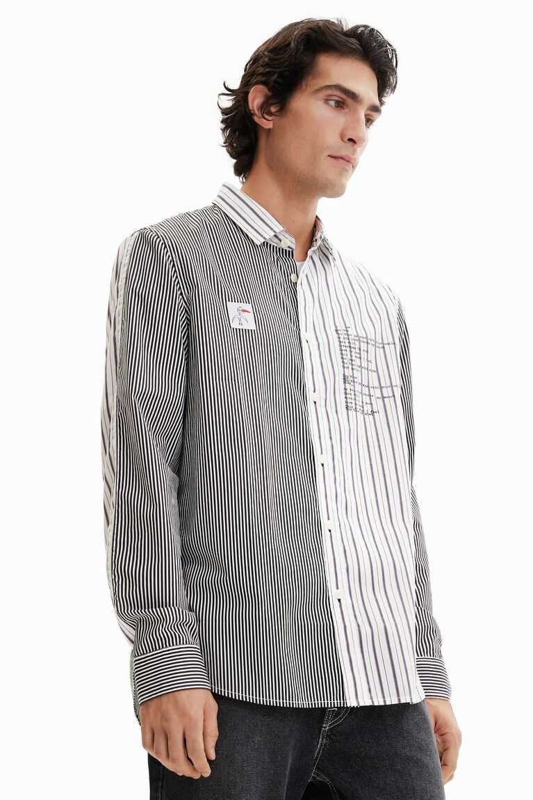 A half-and-half long-sleeve shirt with two striped prints, patch detail and text.