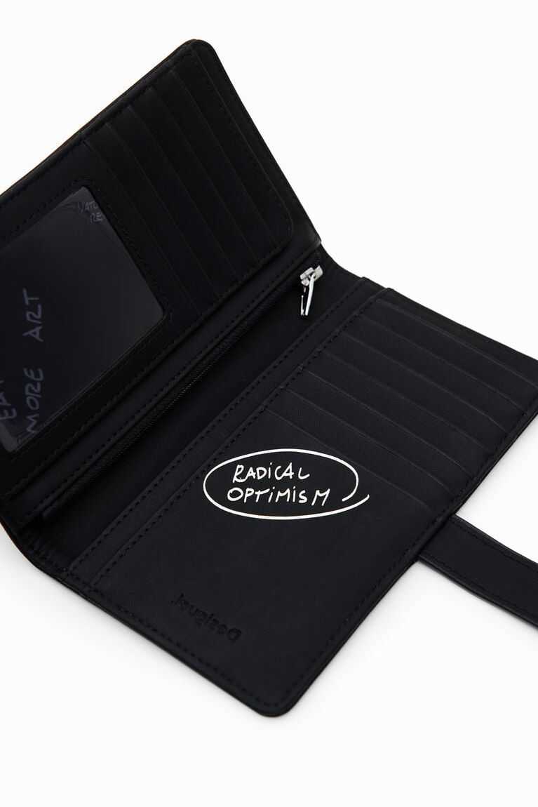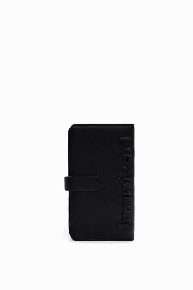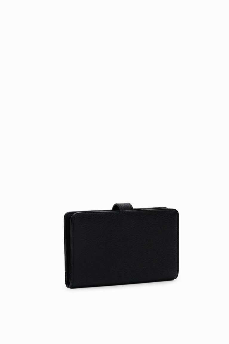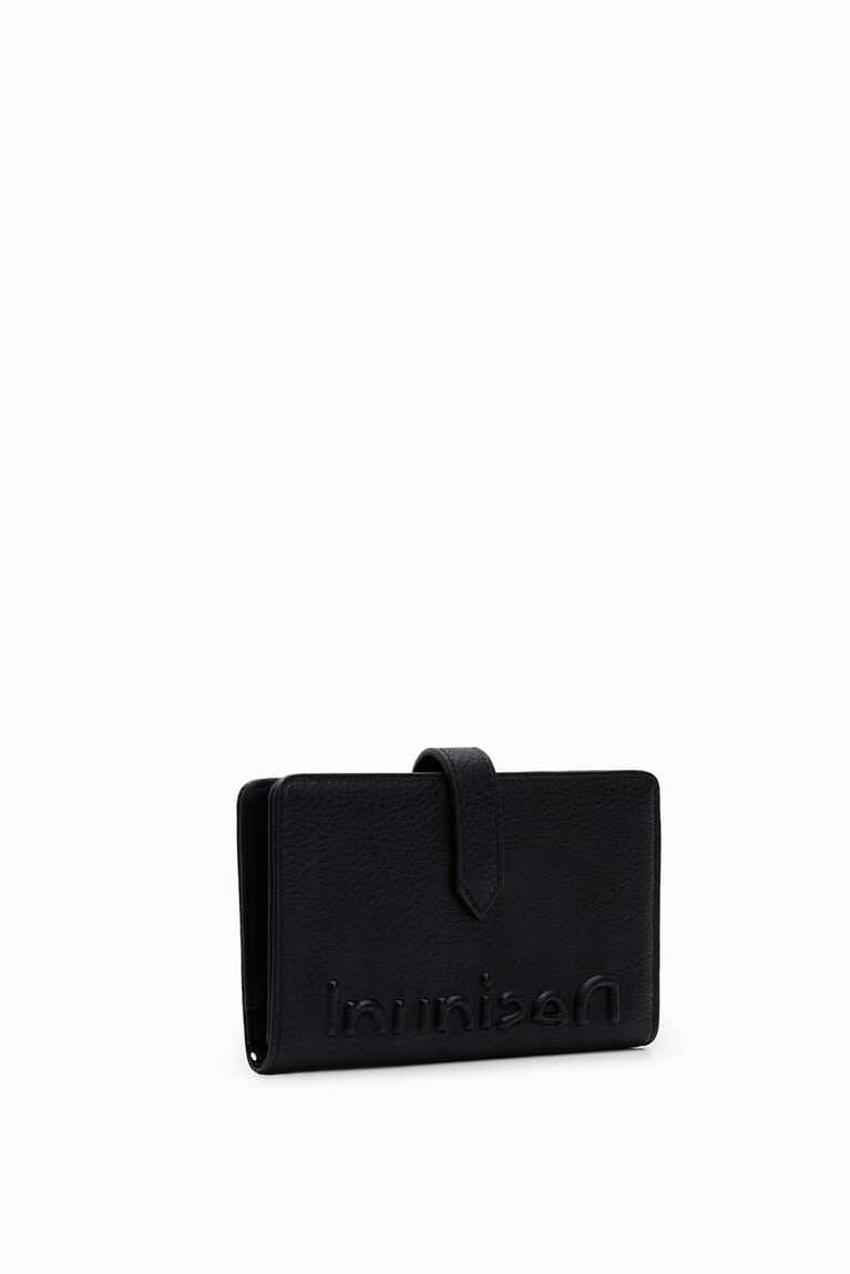 Faux-leather wallet with a half logo and loop closure plus an interior card holder and zipped coin pocket. Medium-sized.