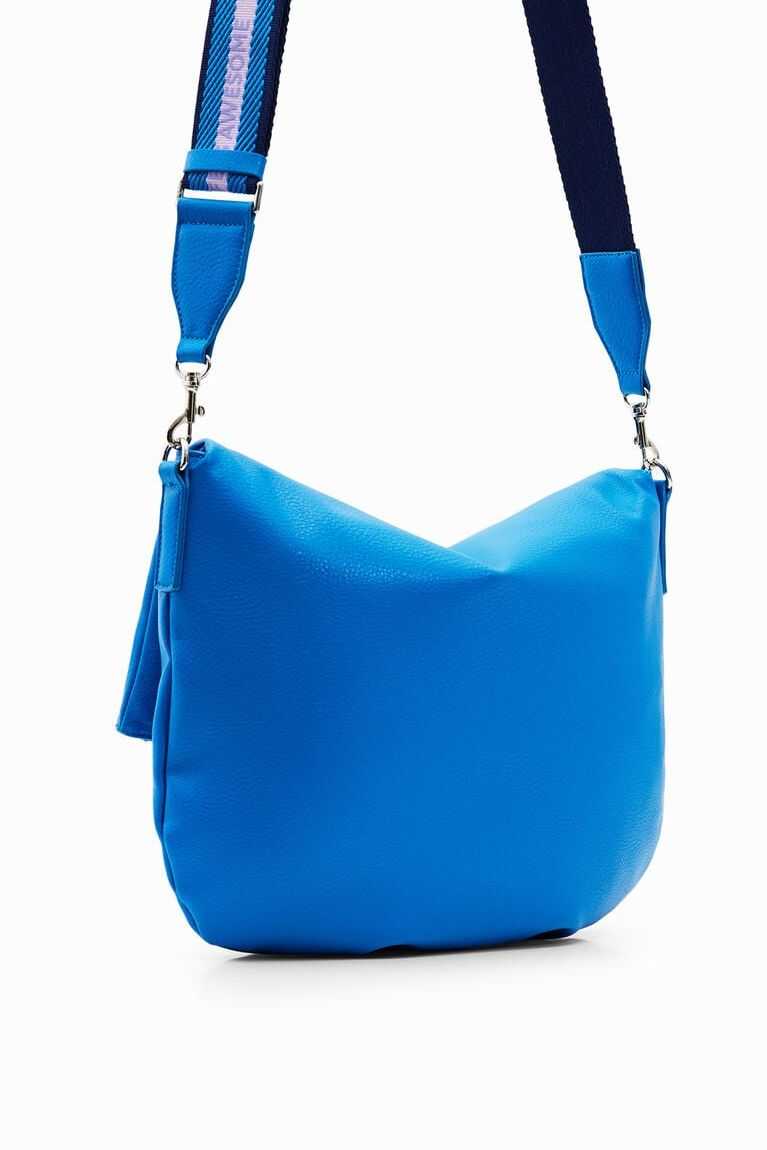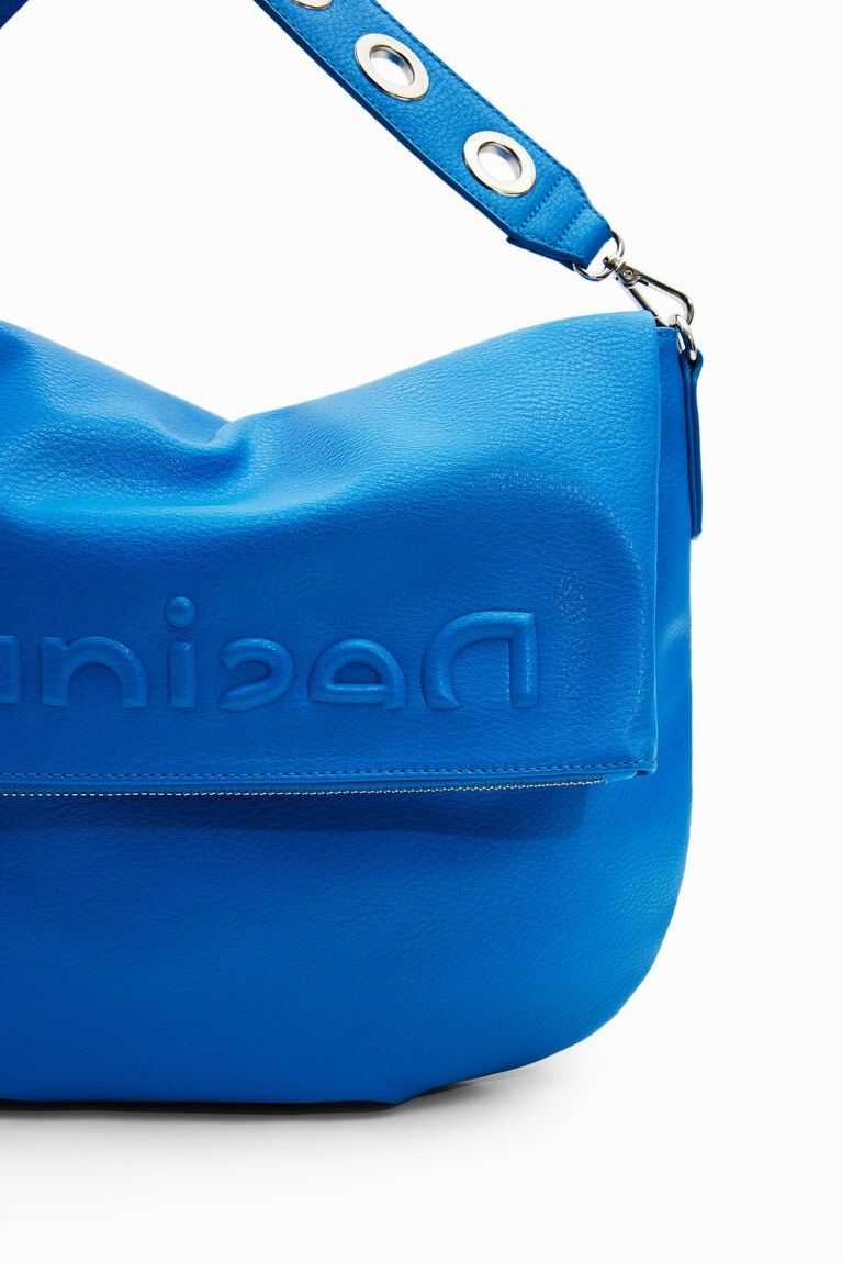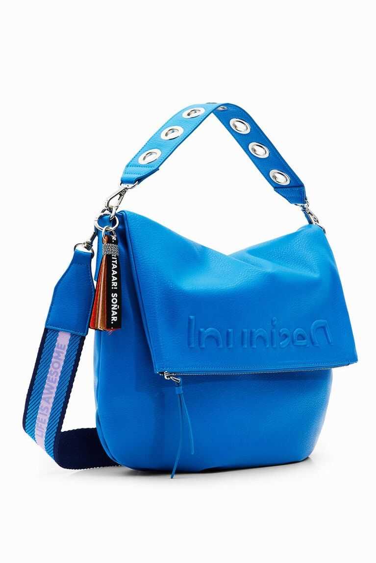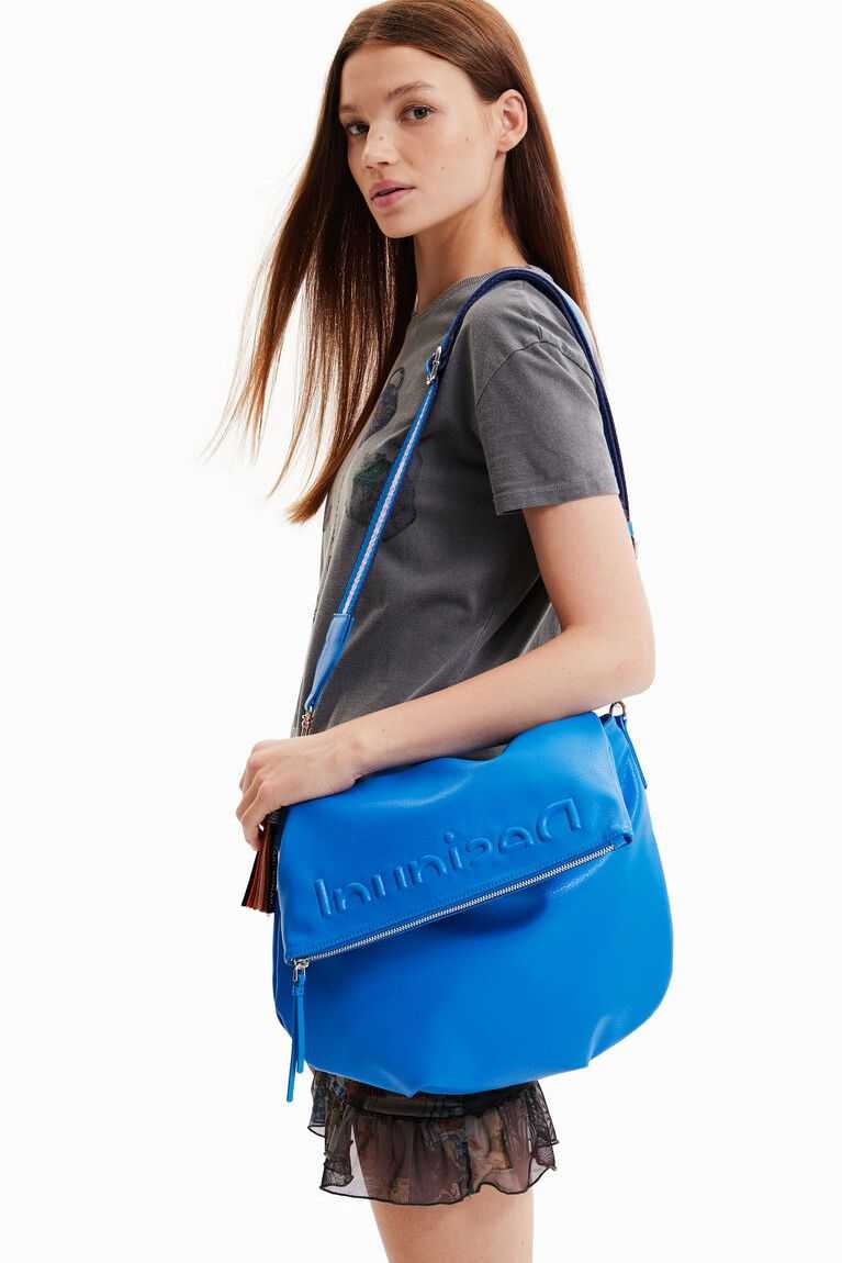 Shoulder bag in faux leather with an embossed half logo on the lower part. Boasts multiple straps for carrying in different ways. Very lightweight with a soft texture.