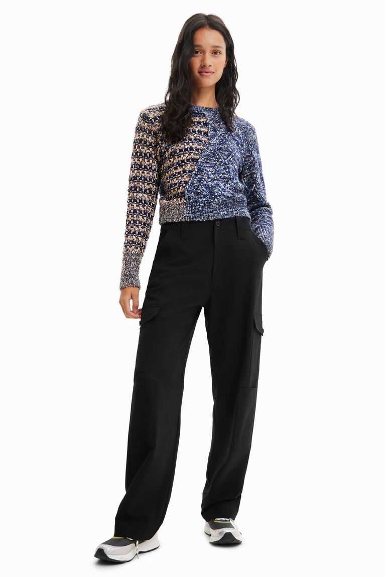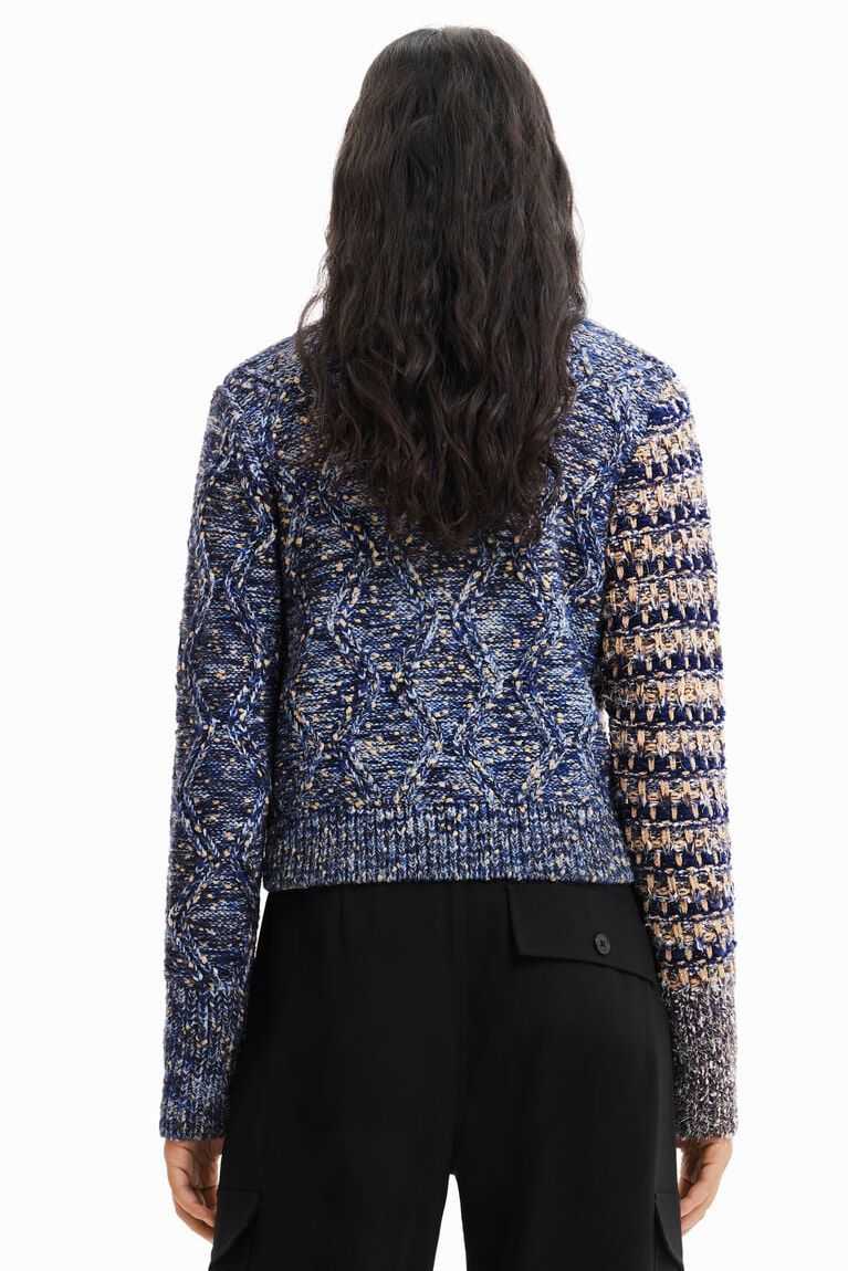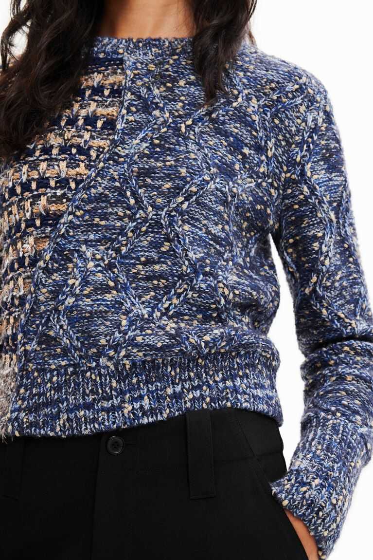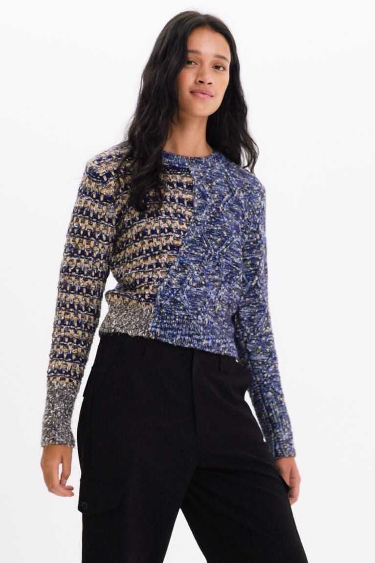 Two types of knit, one pullover! A chunky knit tricot garment with shiny lurex yarn that will add plenty of texture and colour to your between-season looks.