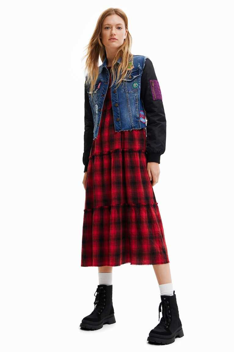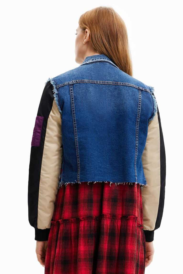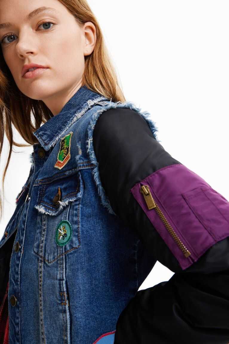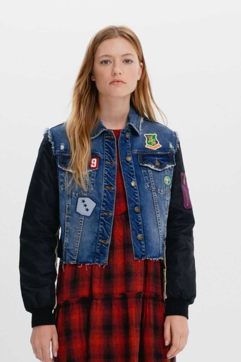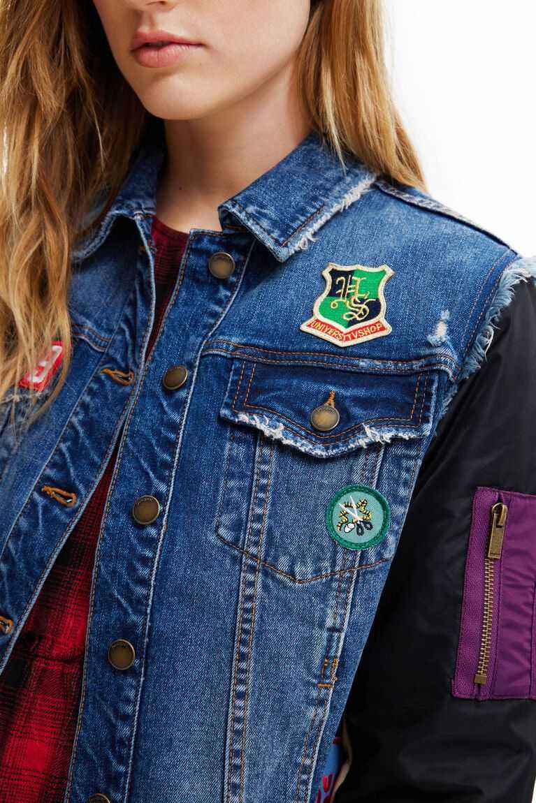 A hybrid of a bomber jacket and a denim jacket.It has contrasting panels on the sleeves and various embroidered patches on the front.