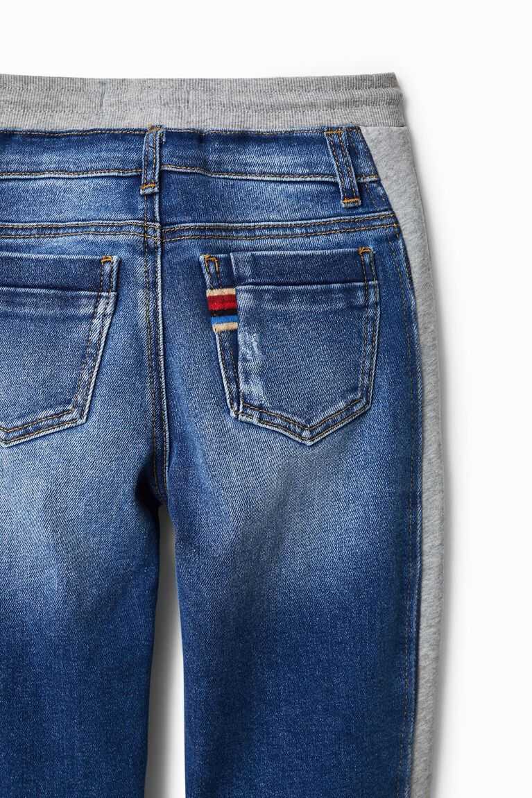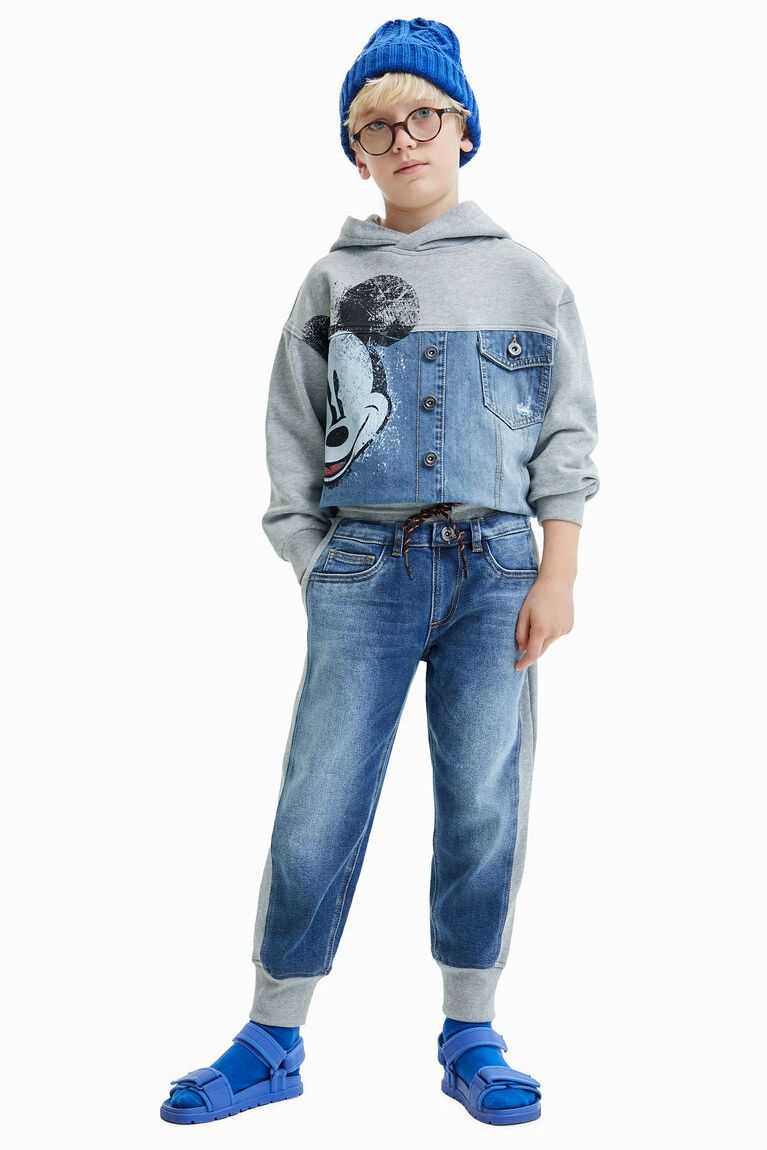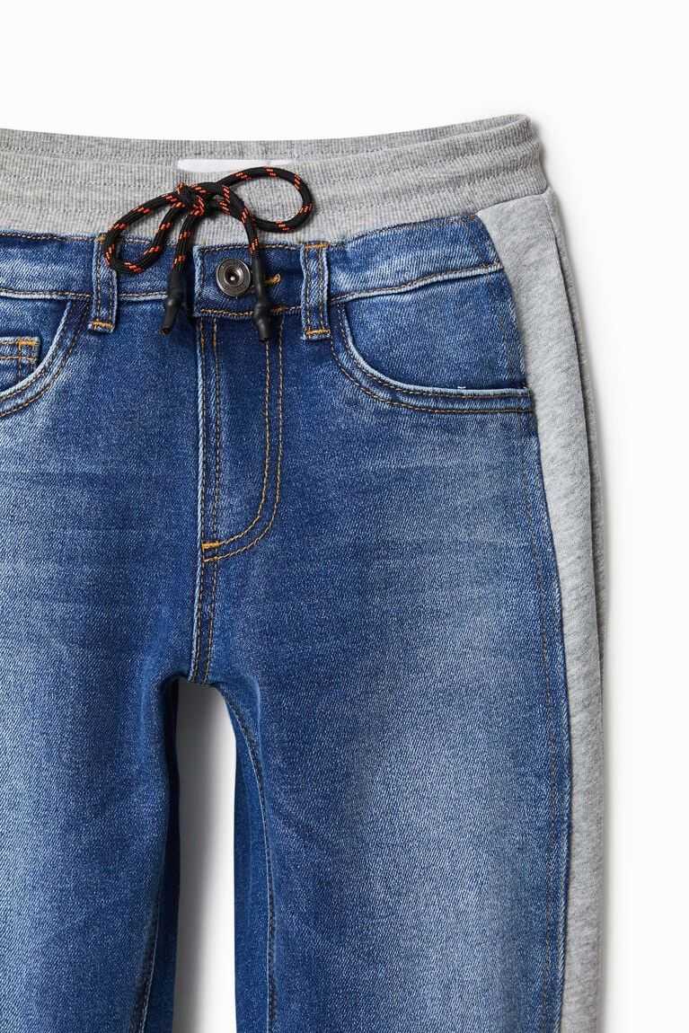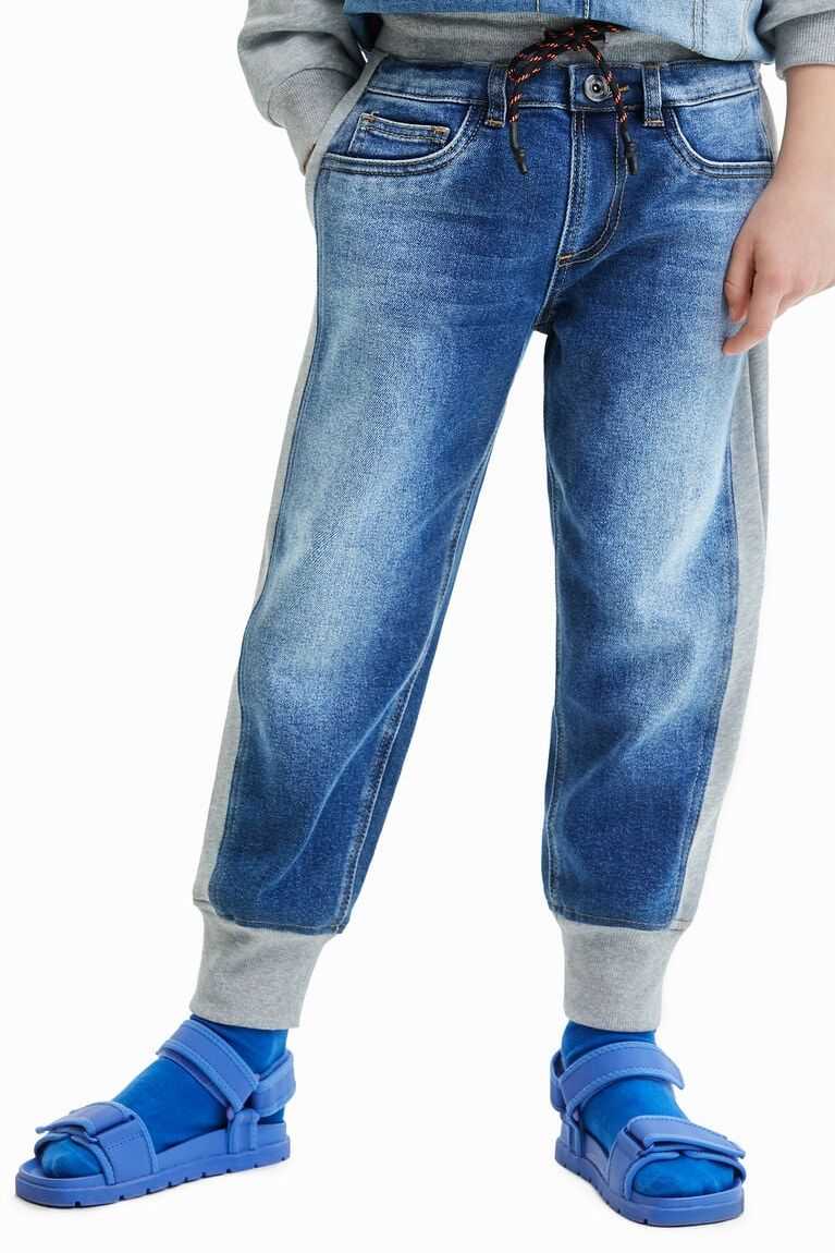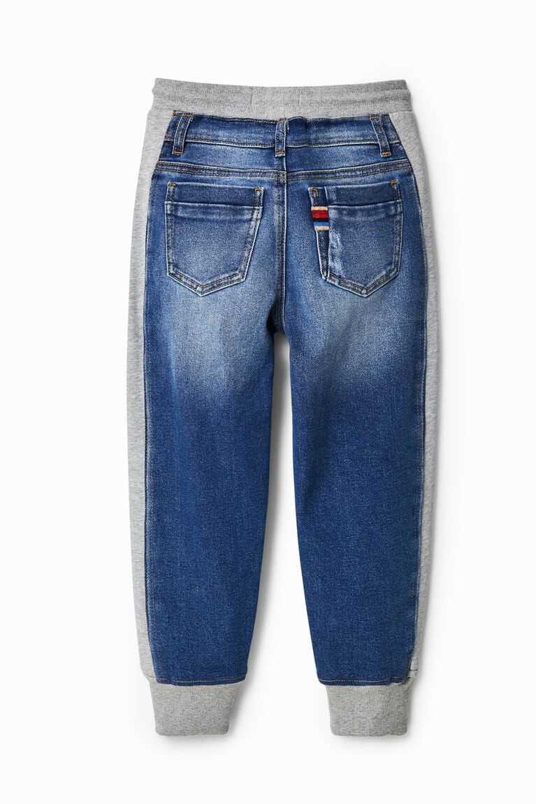 These hybrid joggers feature denim fabric on the front and plush on the back. Very comfortable elasticated hems and waistband. Made from sustainable cotton.