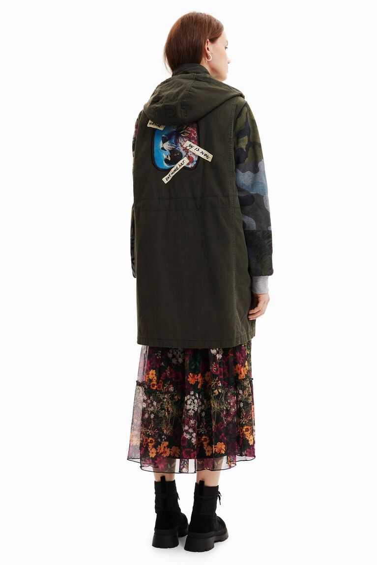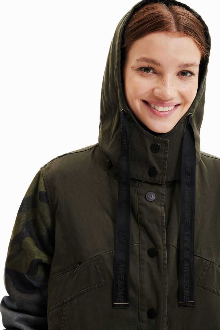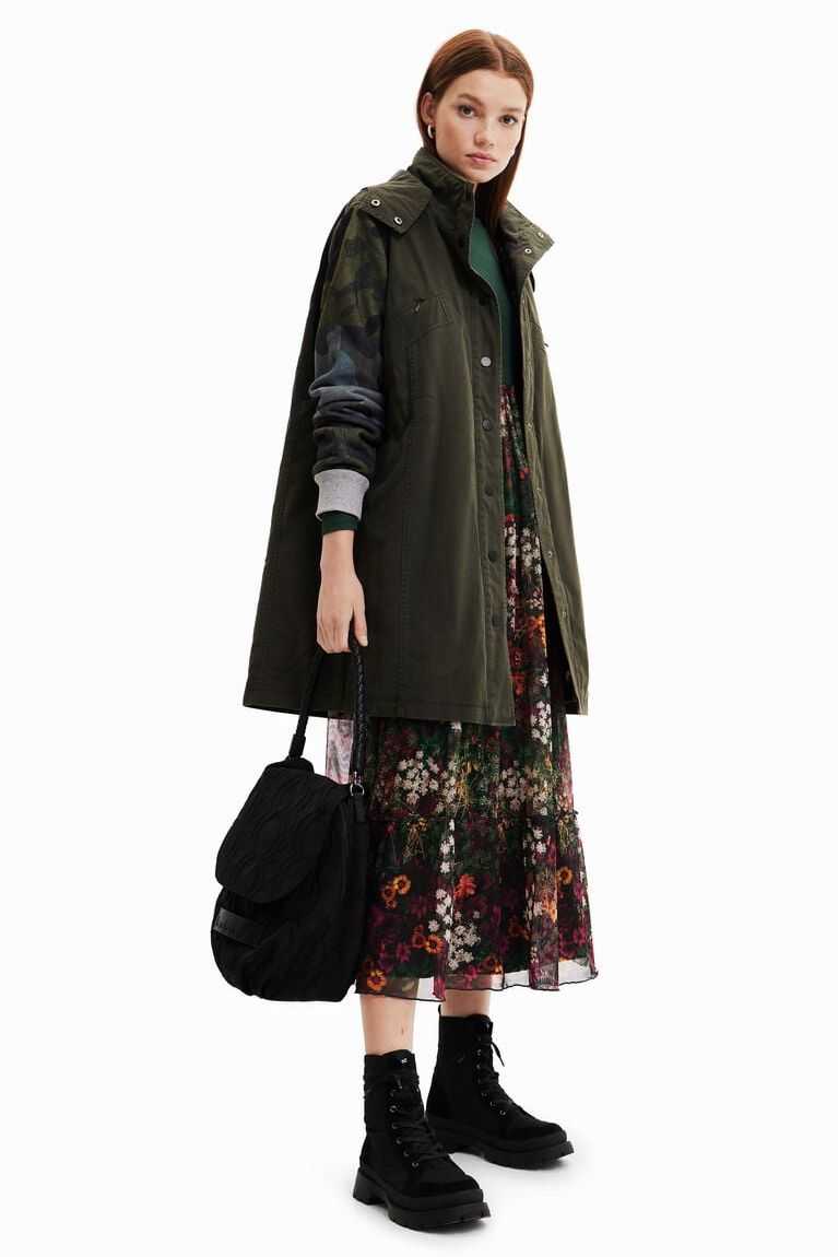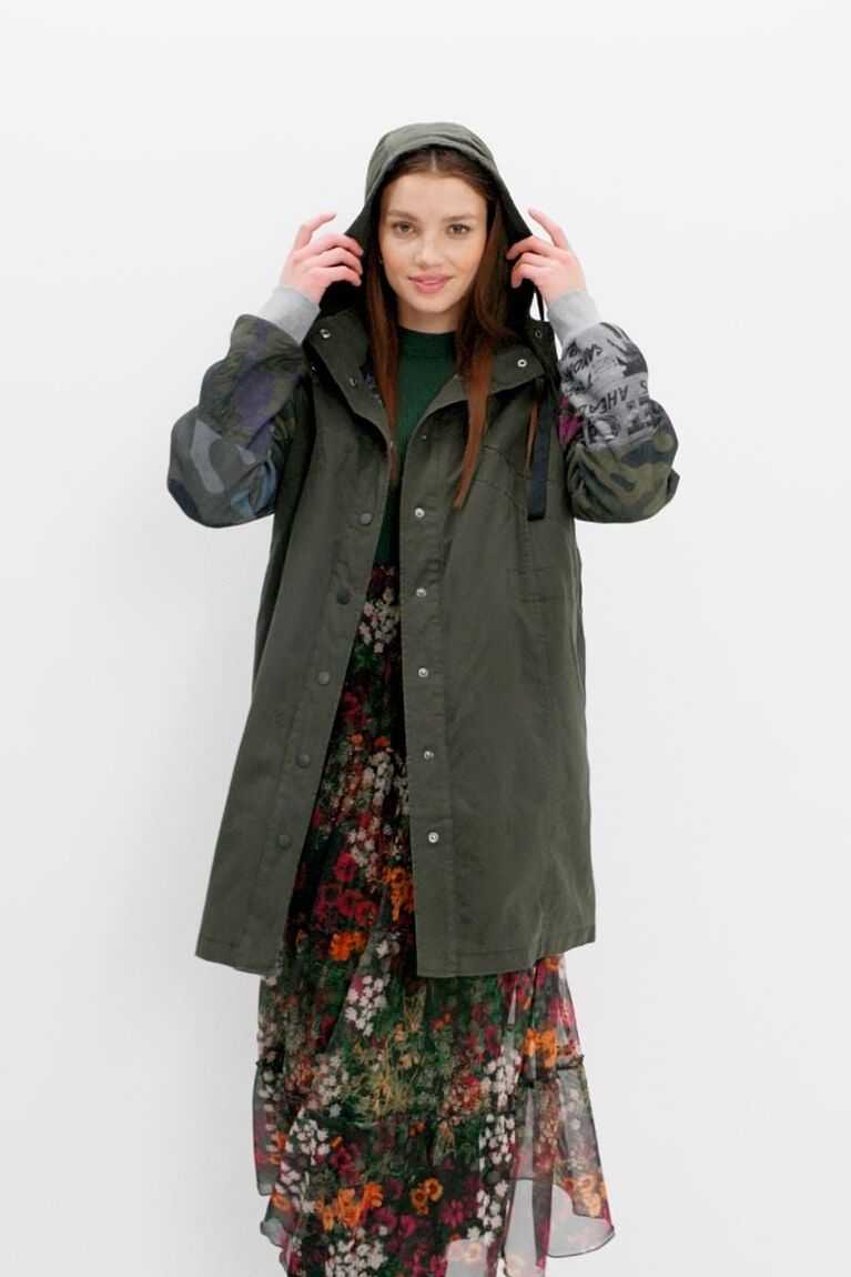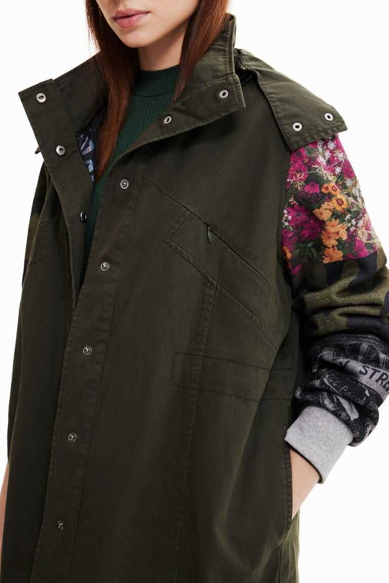Various camouflage and floral prints decorate the plush sleeves of this hybrid parka with a safari vibe. Features a detachable hood with maxi drawstrings that make it adjustable.