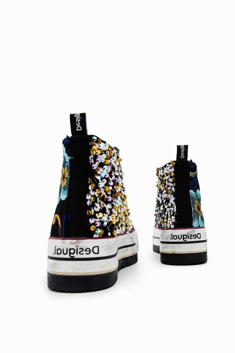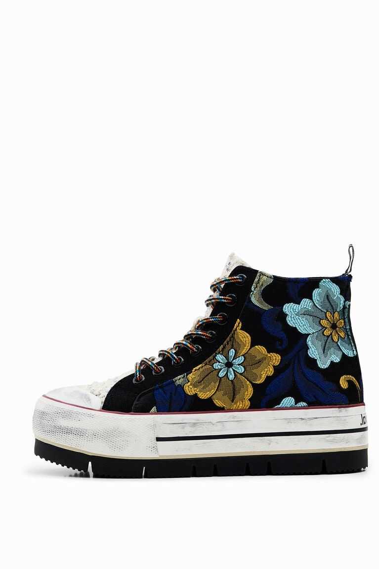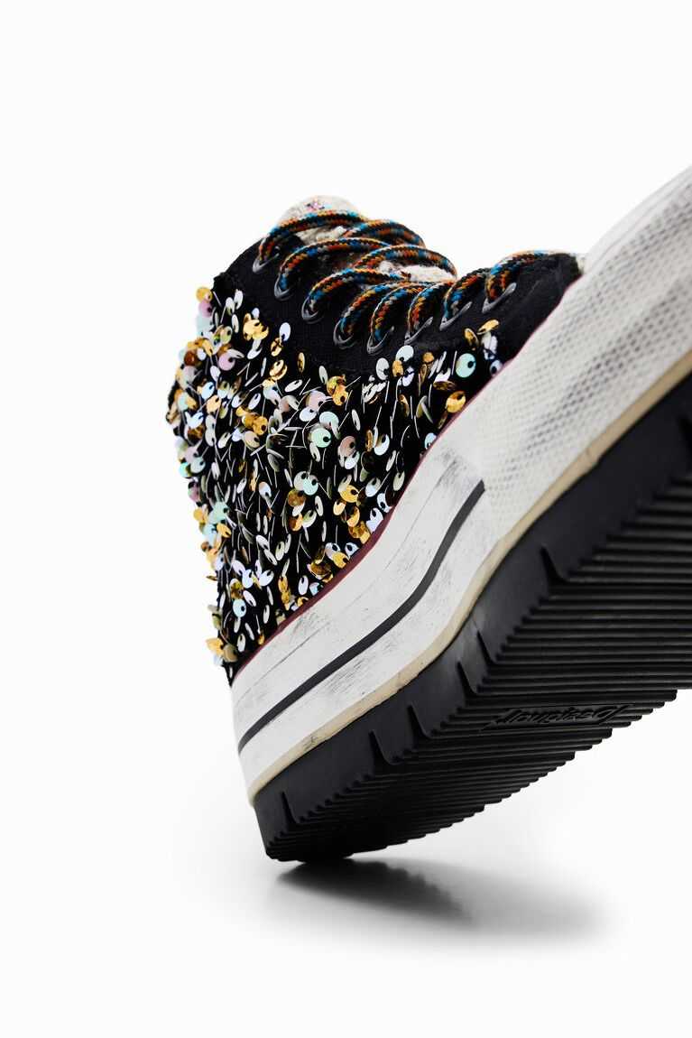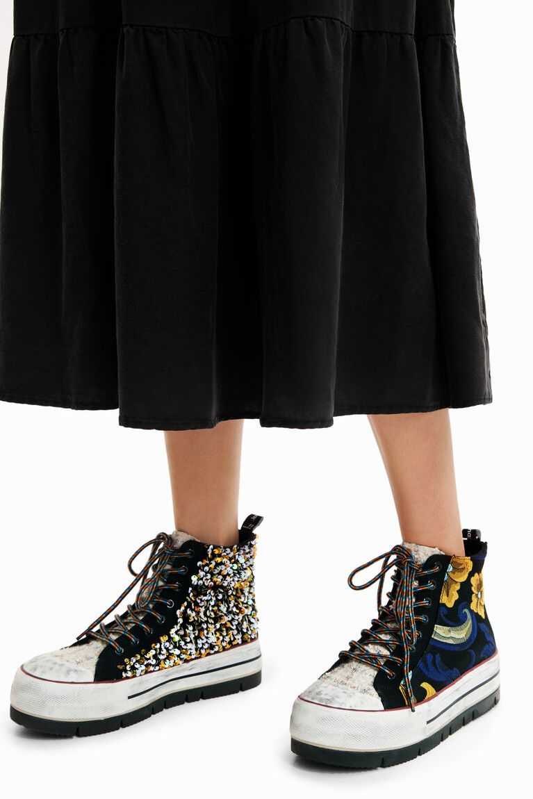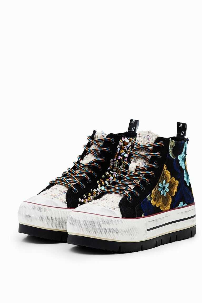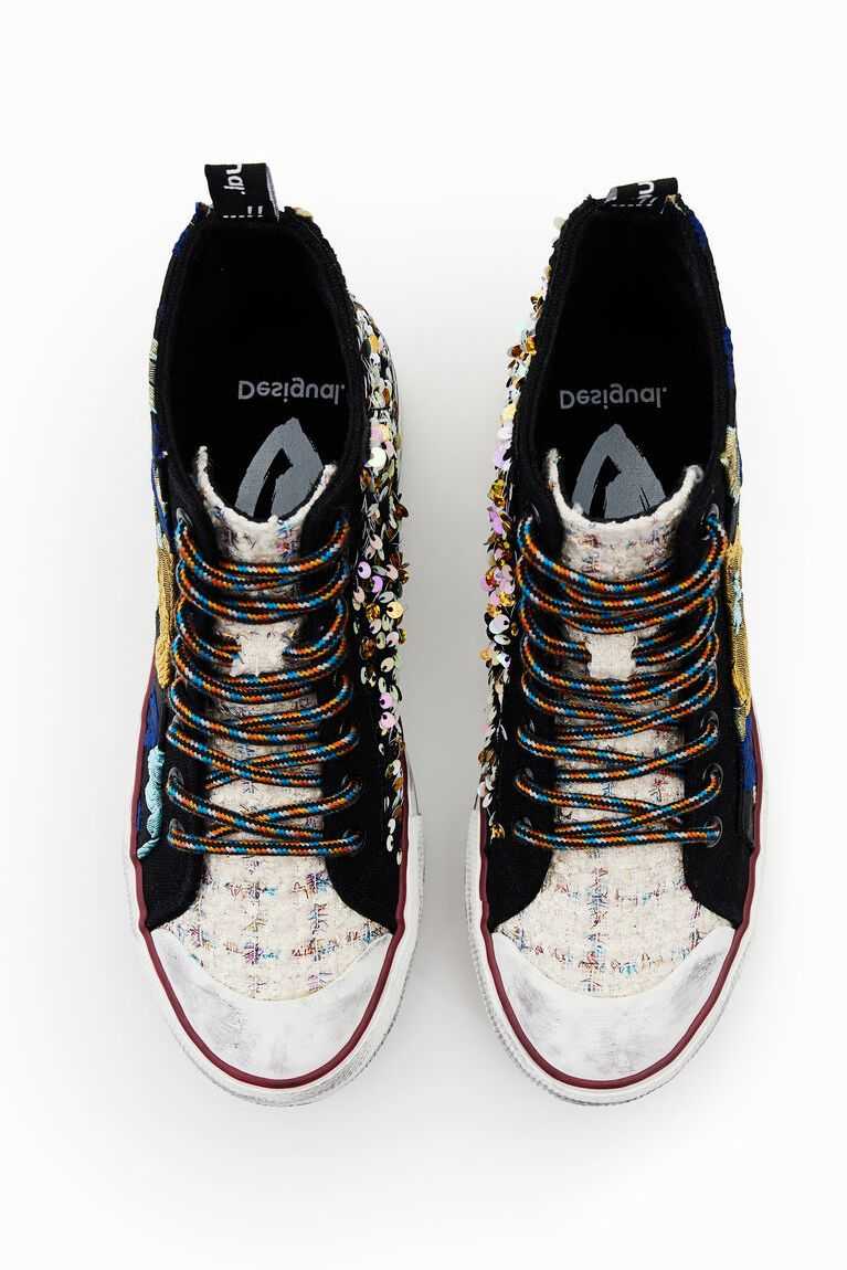 High-top platform sneakers with a mix of rich fabrics: jacquard, multicoloured paillettes and tweed. Featuring laces with touches of colour.