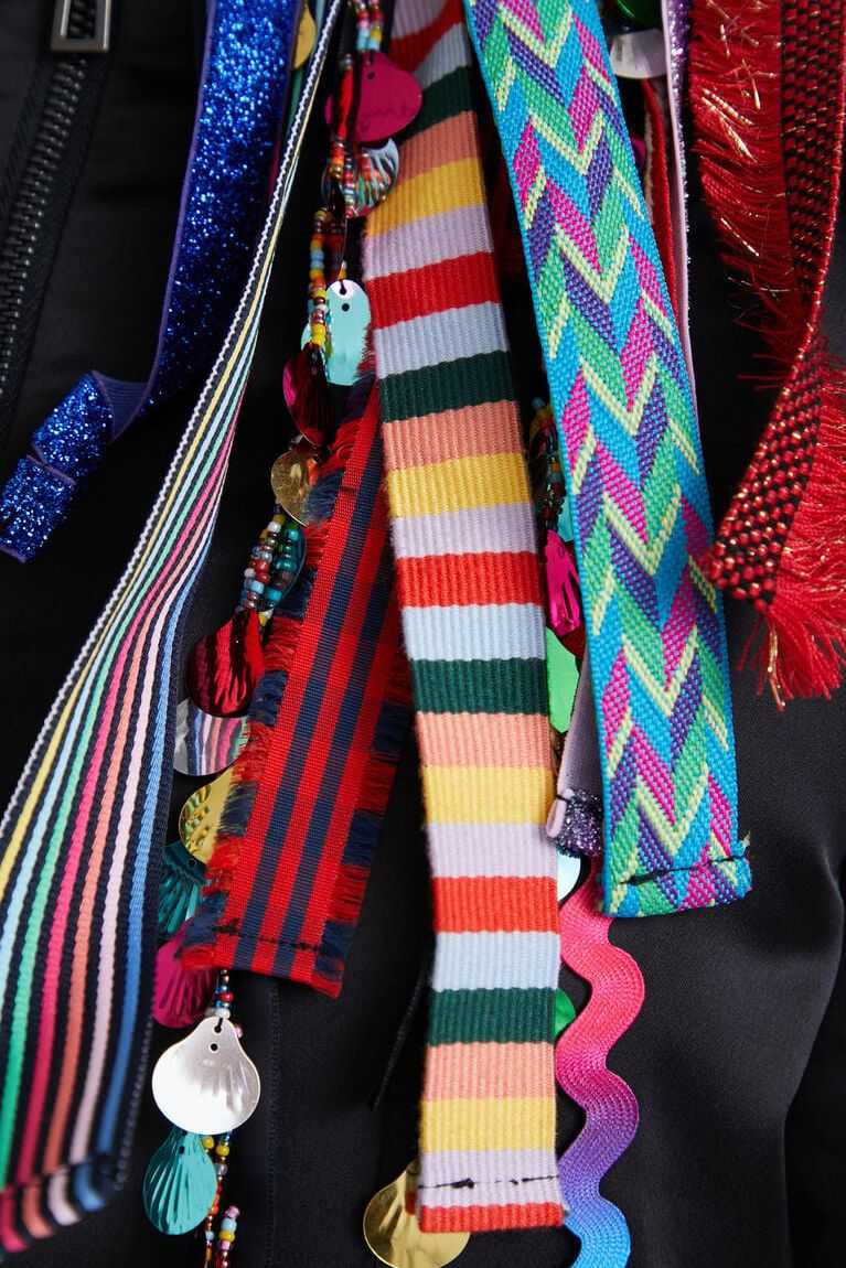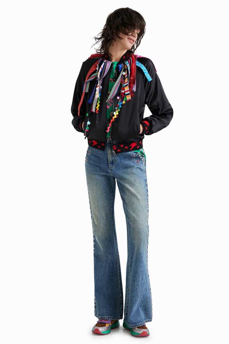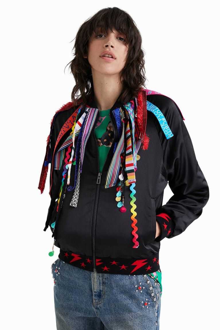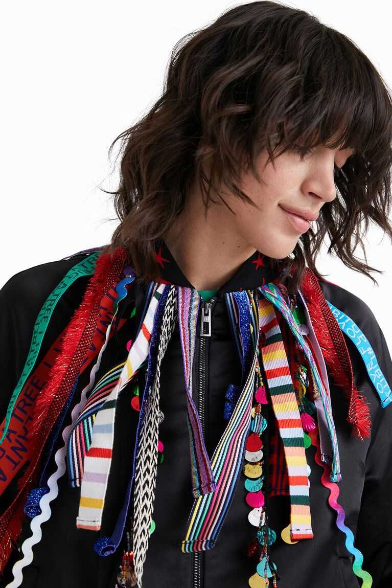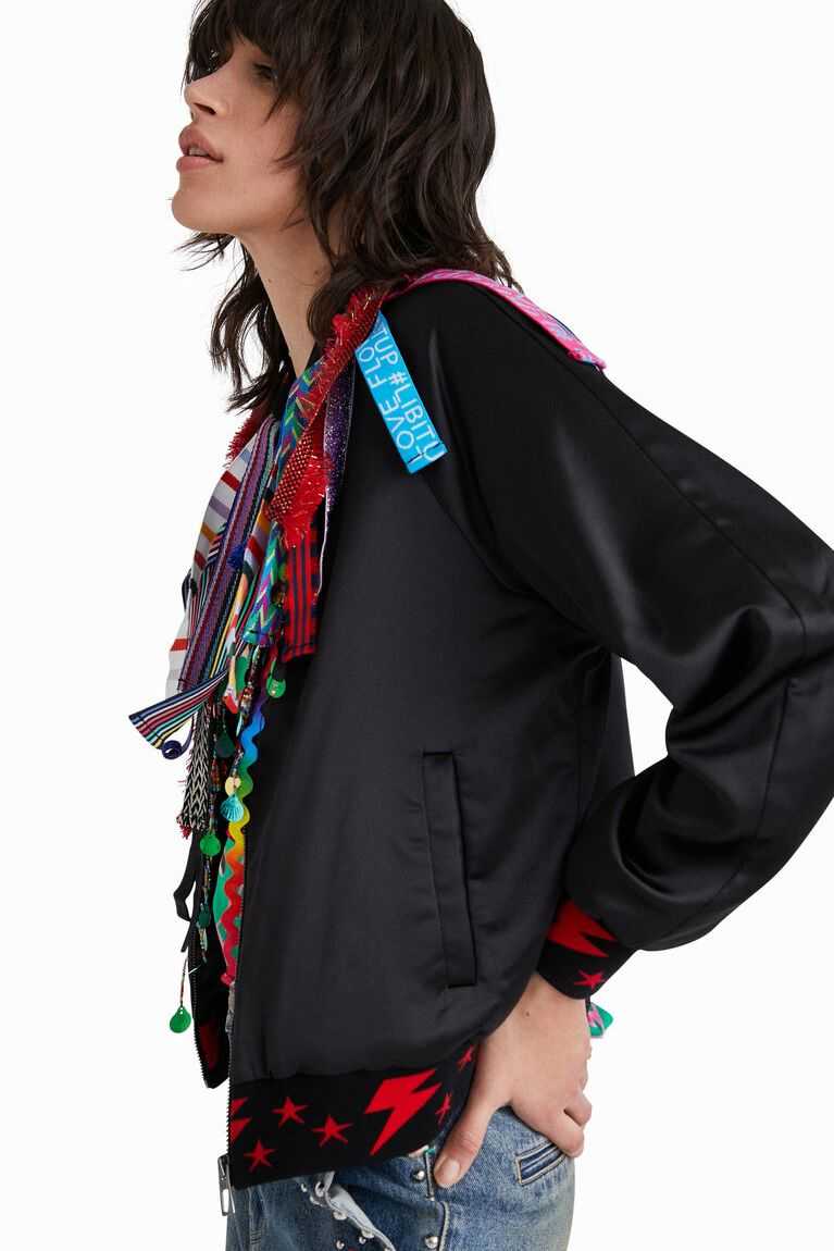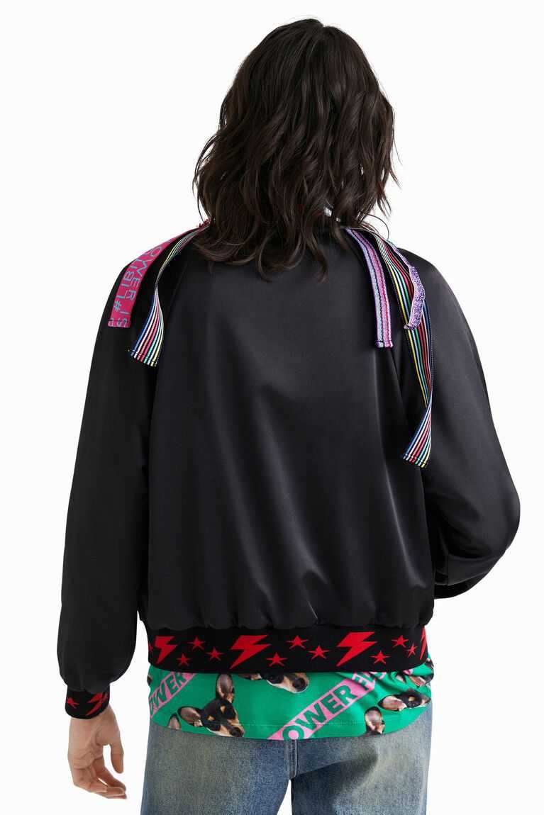 This bomber jacket with a glossy finish is full of details: ribbons and multicoloured decorations spring from the collar and feature statements from this collection's designer, Johnson Hartig. Made from recycled fibres. Go for the total look with the matching Bermuda shorts.