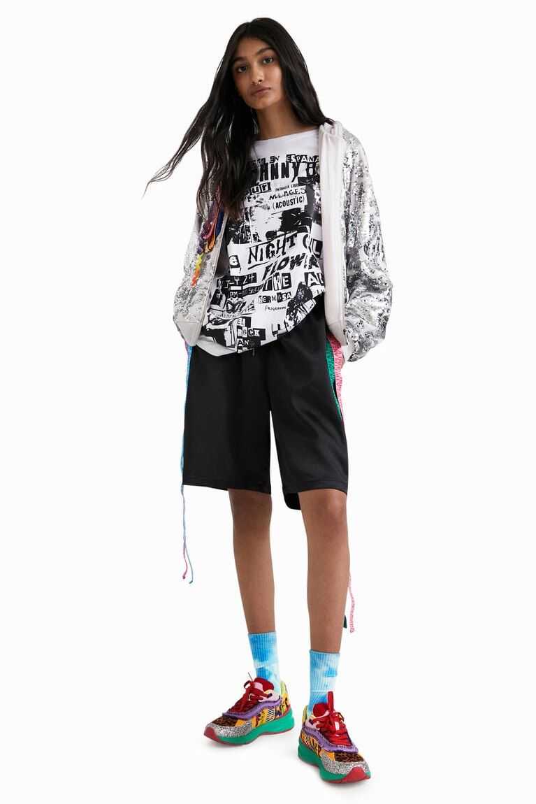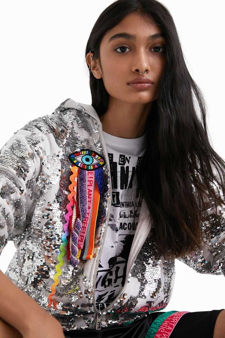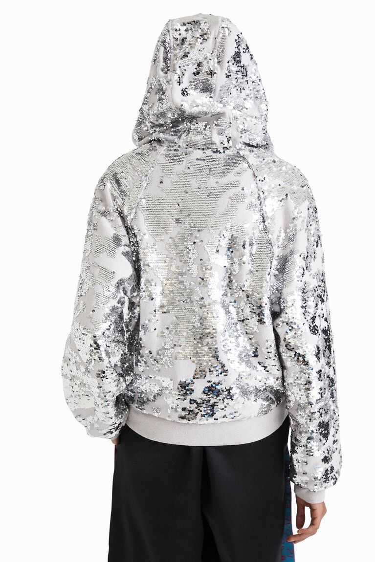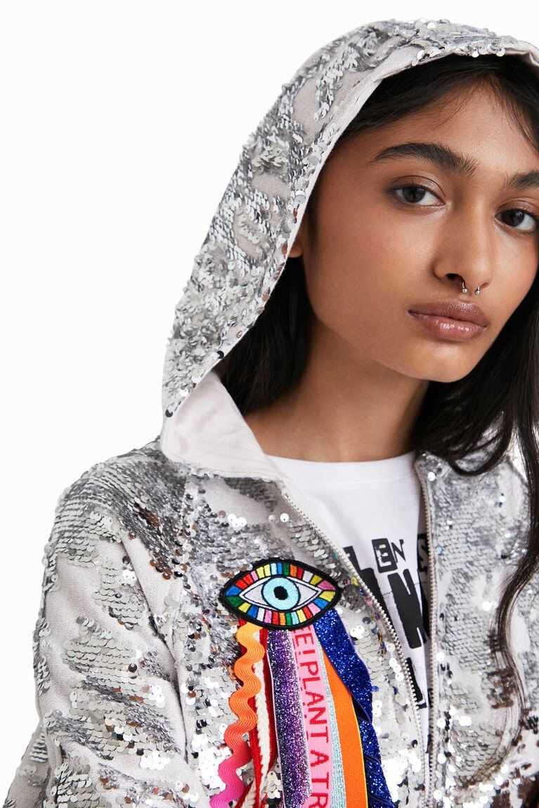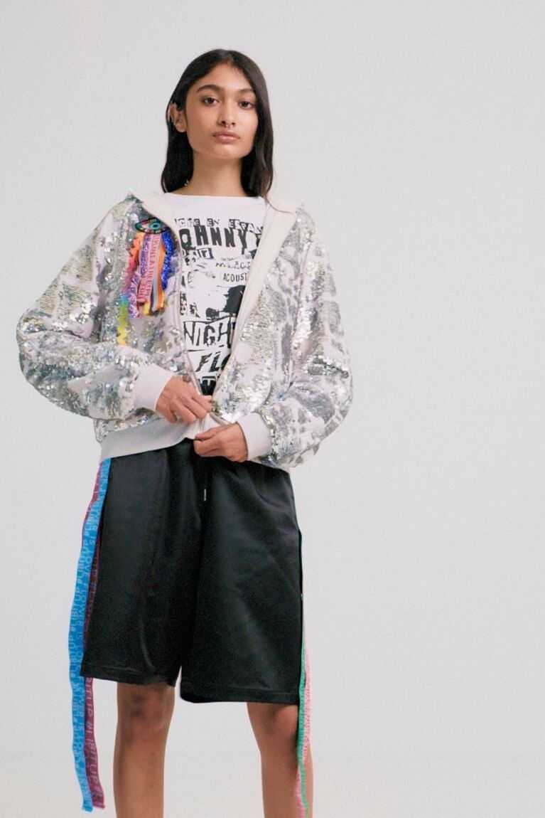 Combining comfort and party vibes, this hoodie sparkles brightly thanks to its sequins and silver fabric. It's designed by Johnson Hartig and features a patch detail with multicoloured ribbons. Combine it with the matching shorts.