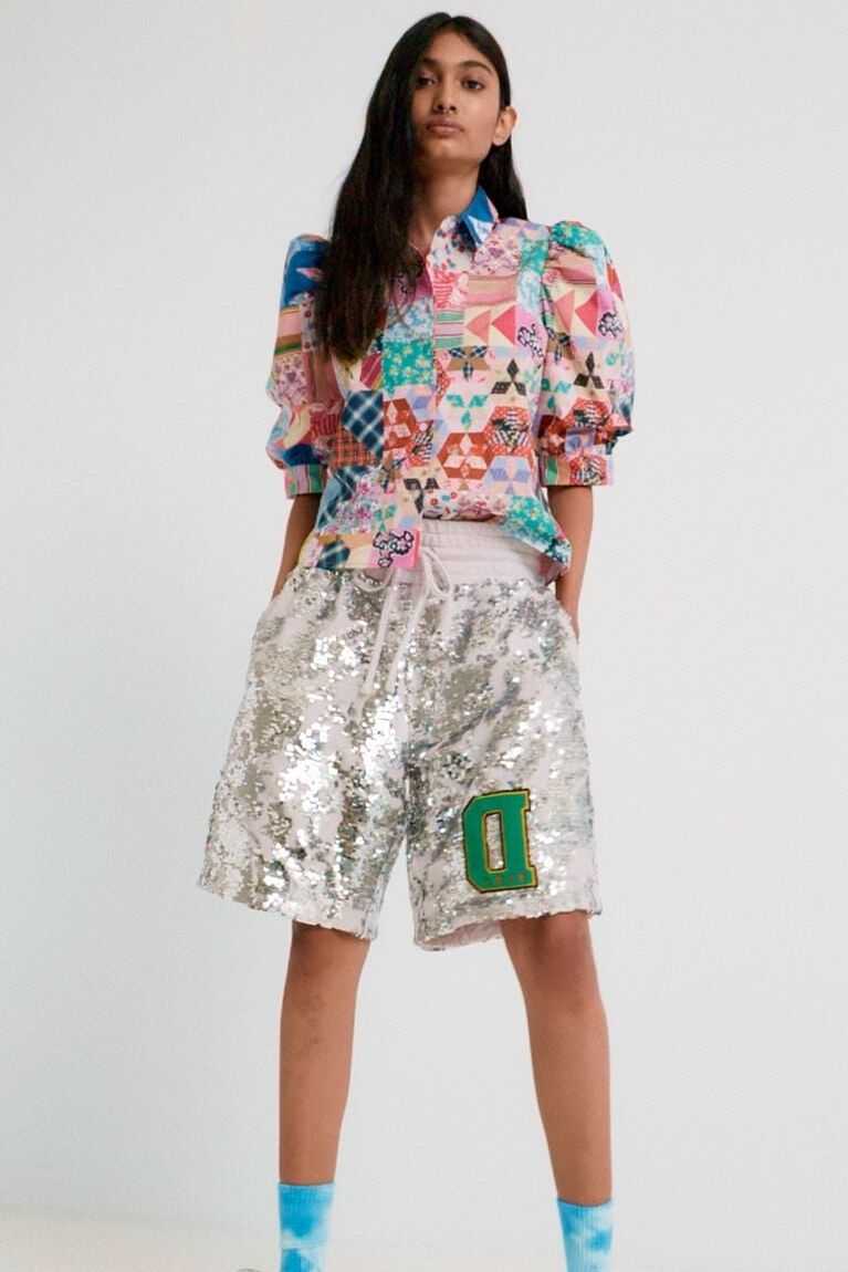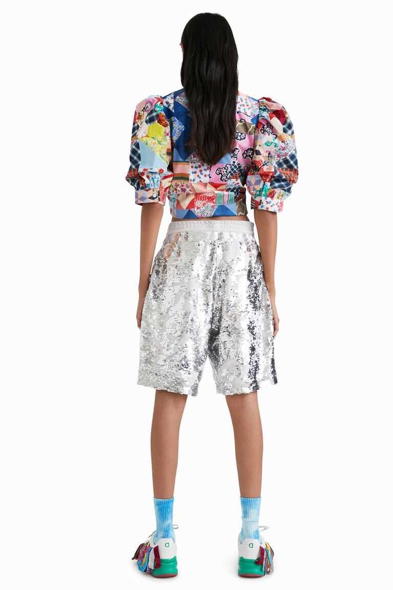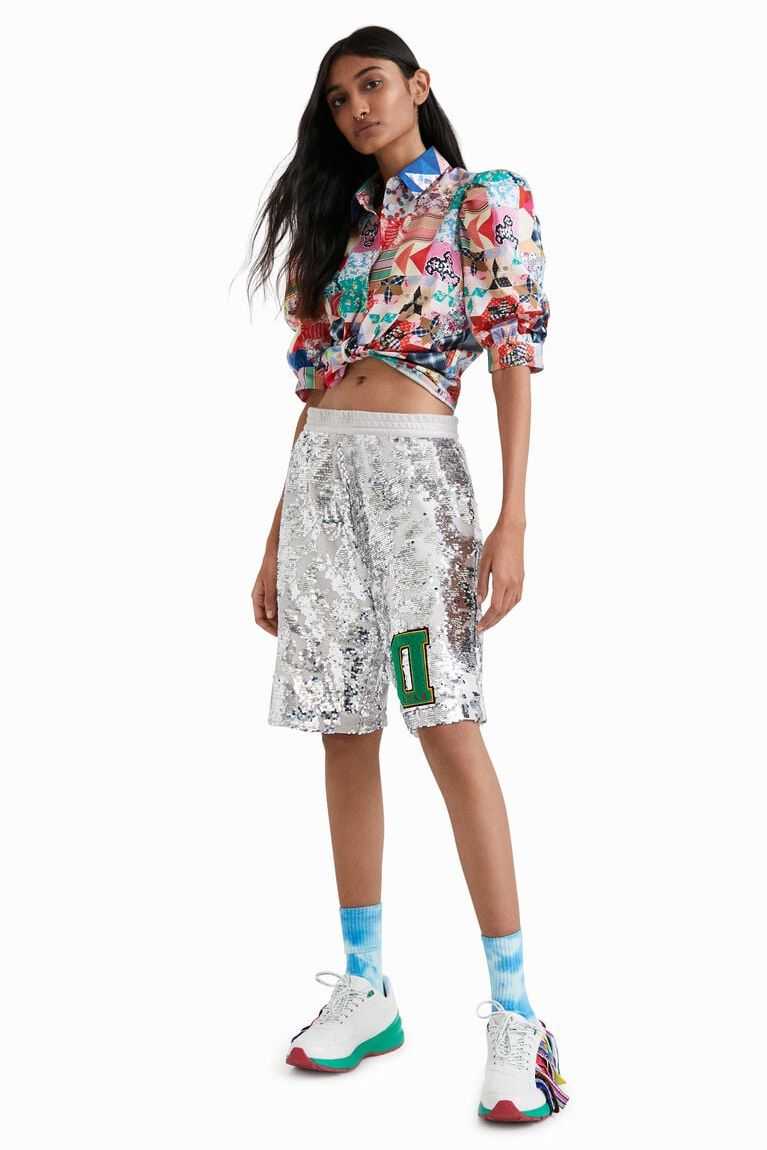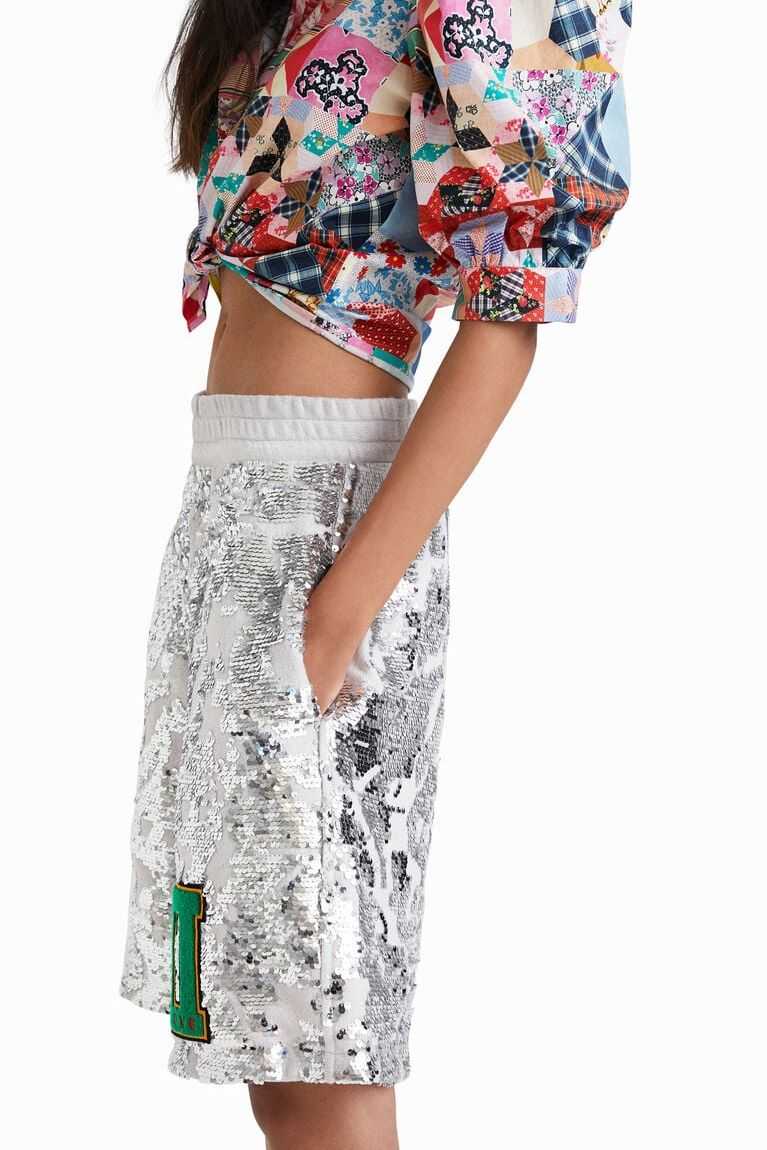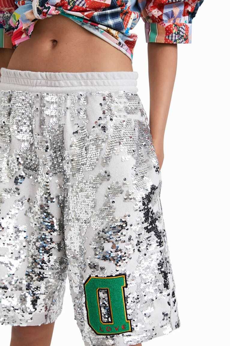 Sporty Bermuda shorts with sequins on lurex fabric and a "D" patch designed by Johnson Hartig. Pair them with the matching sweatshirt.
