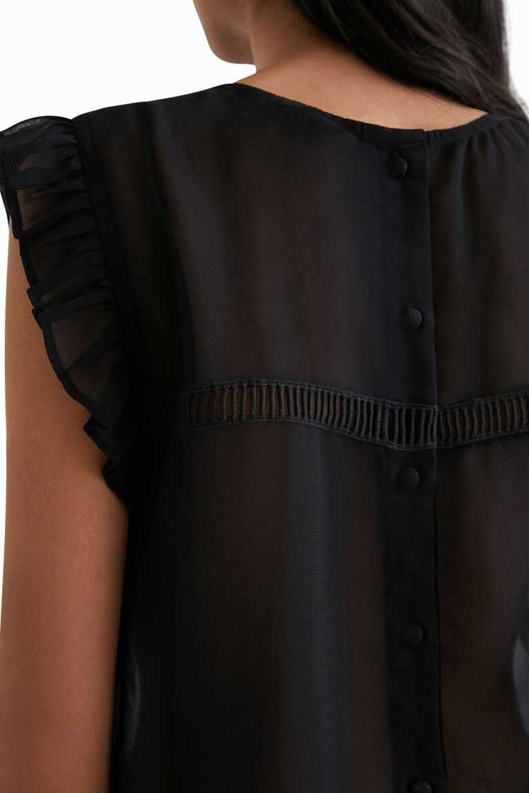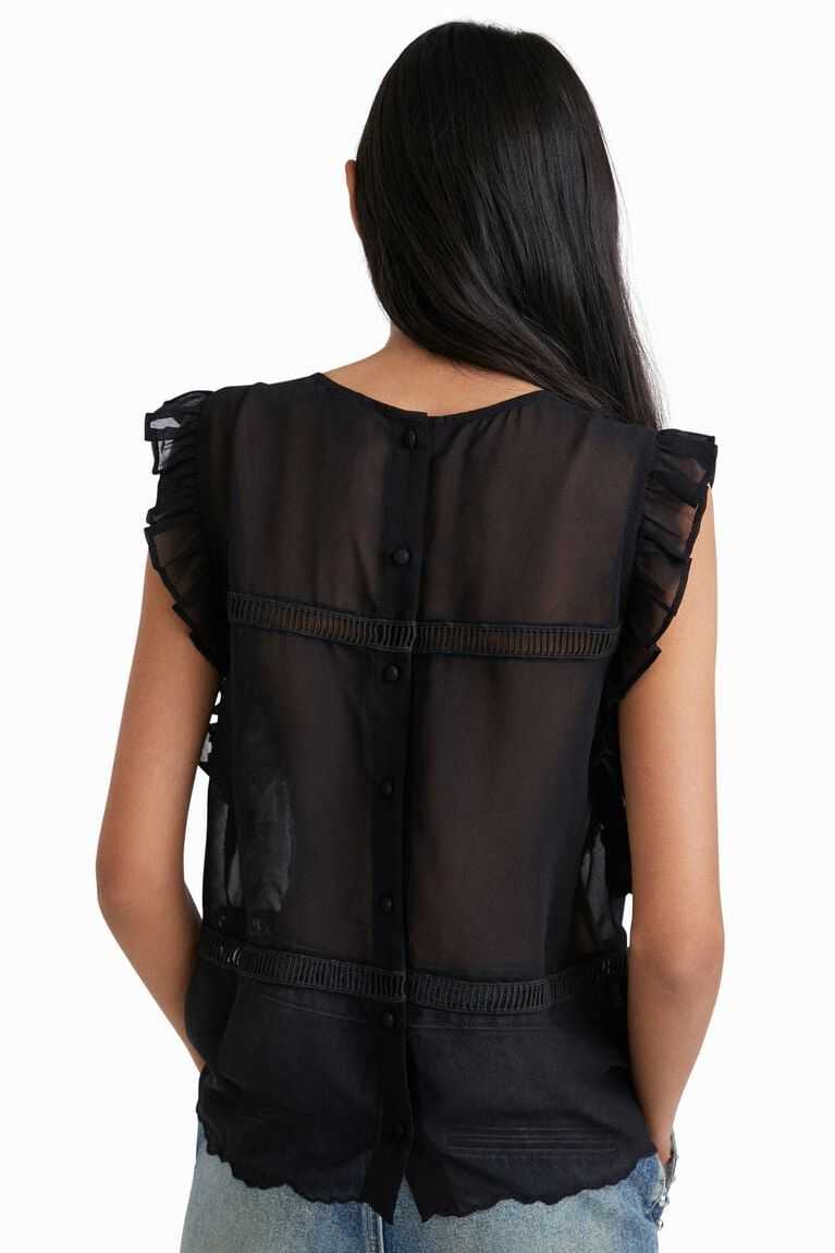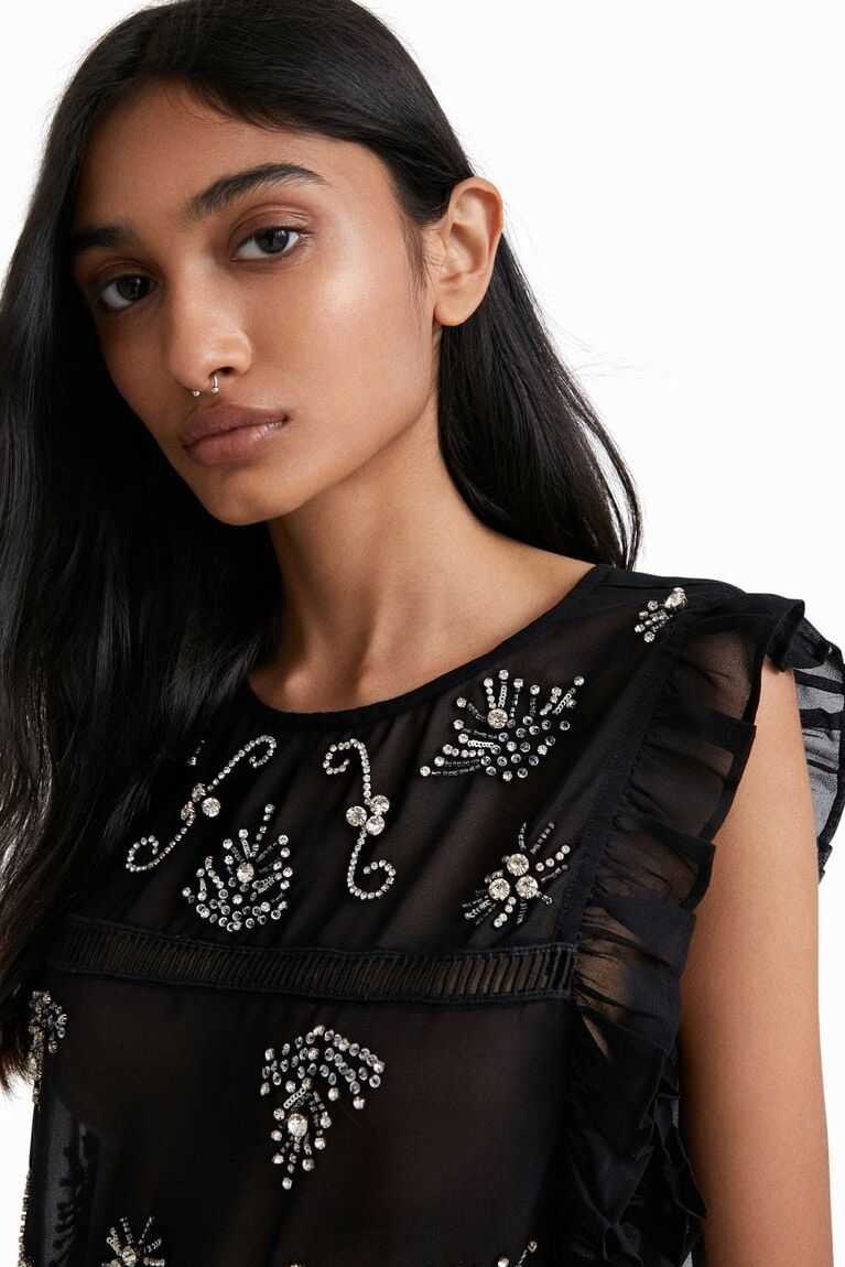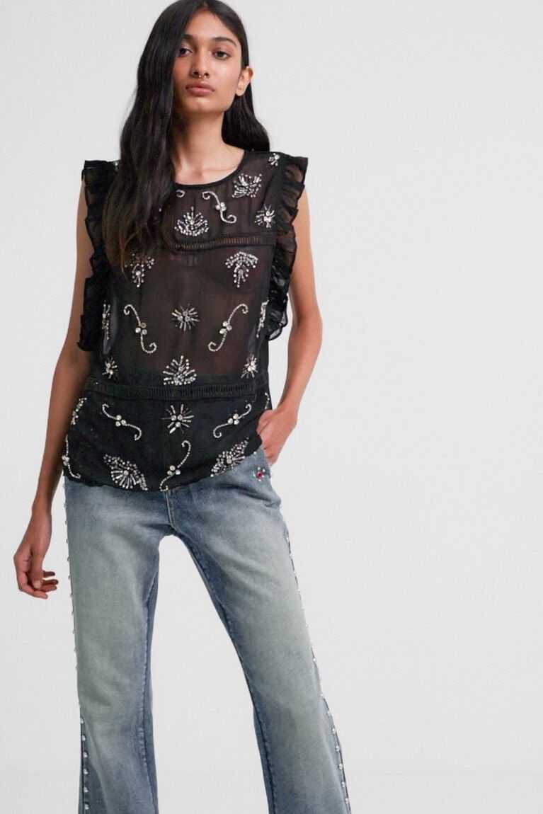 The front of this sheer blouse designed by Johnson Hartig is full of rhinestone appliqu