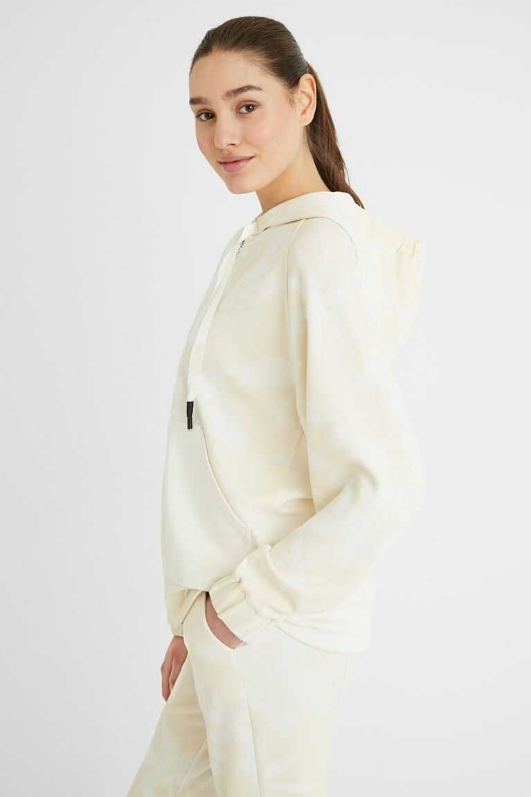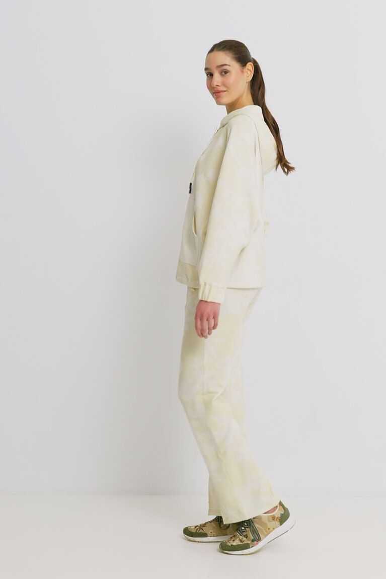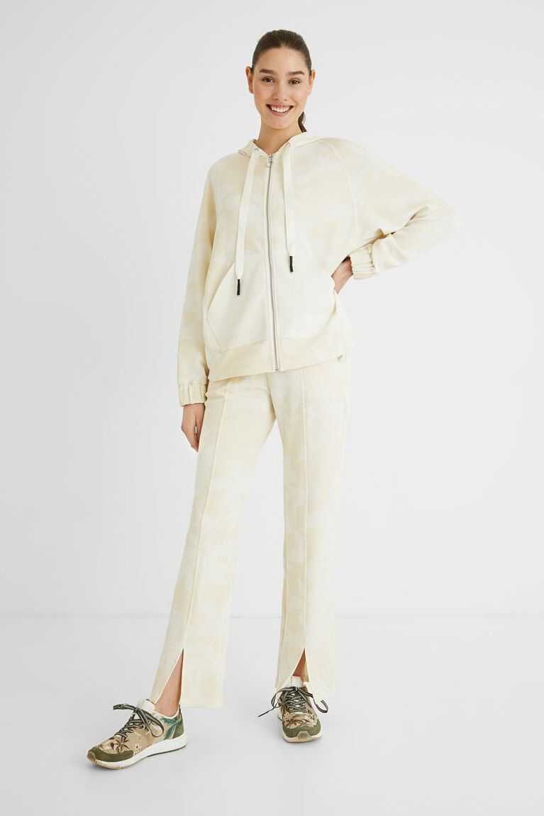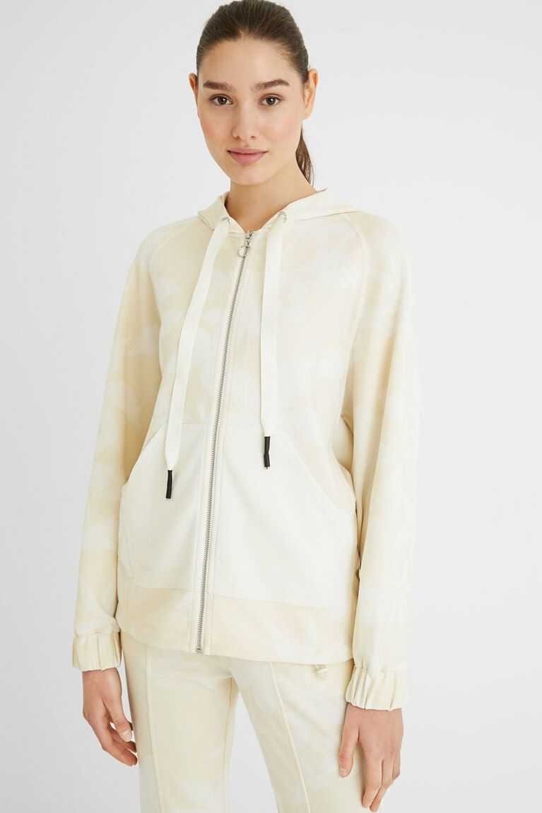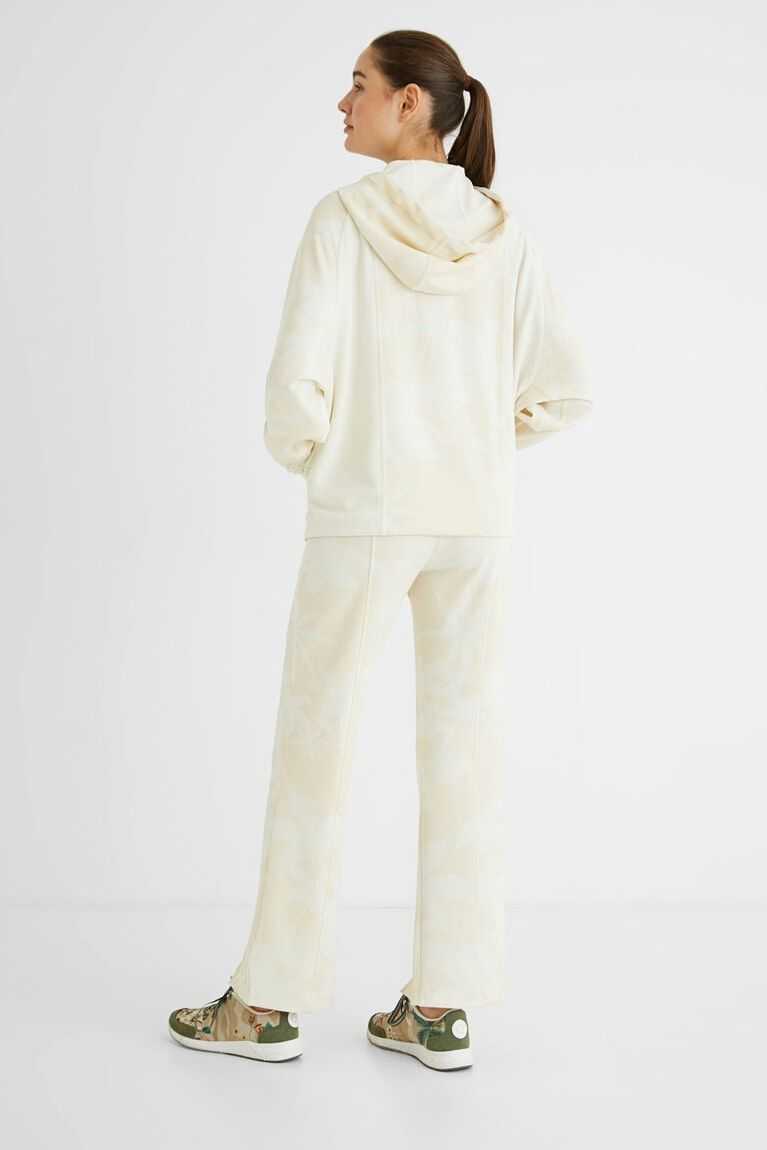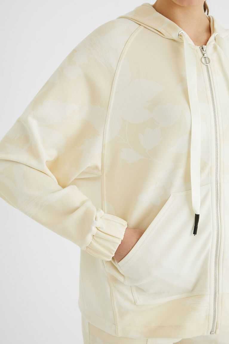This hooded sweatshirt with kangaroo pockets is soft and light. With zip fastener and strings to adjust the hood, its tone on tone floral print is discreet and elegant.