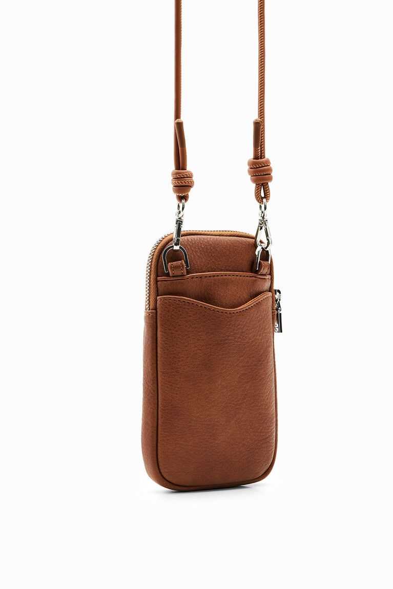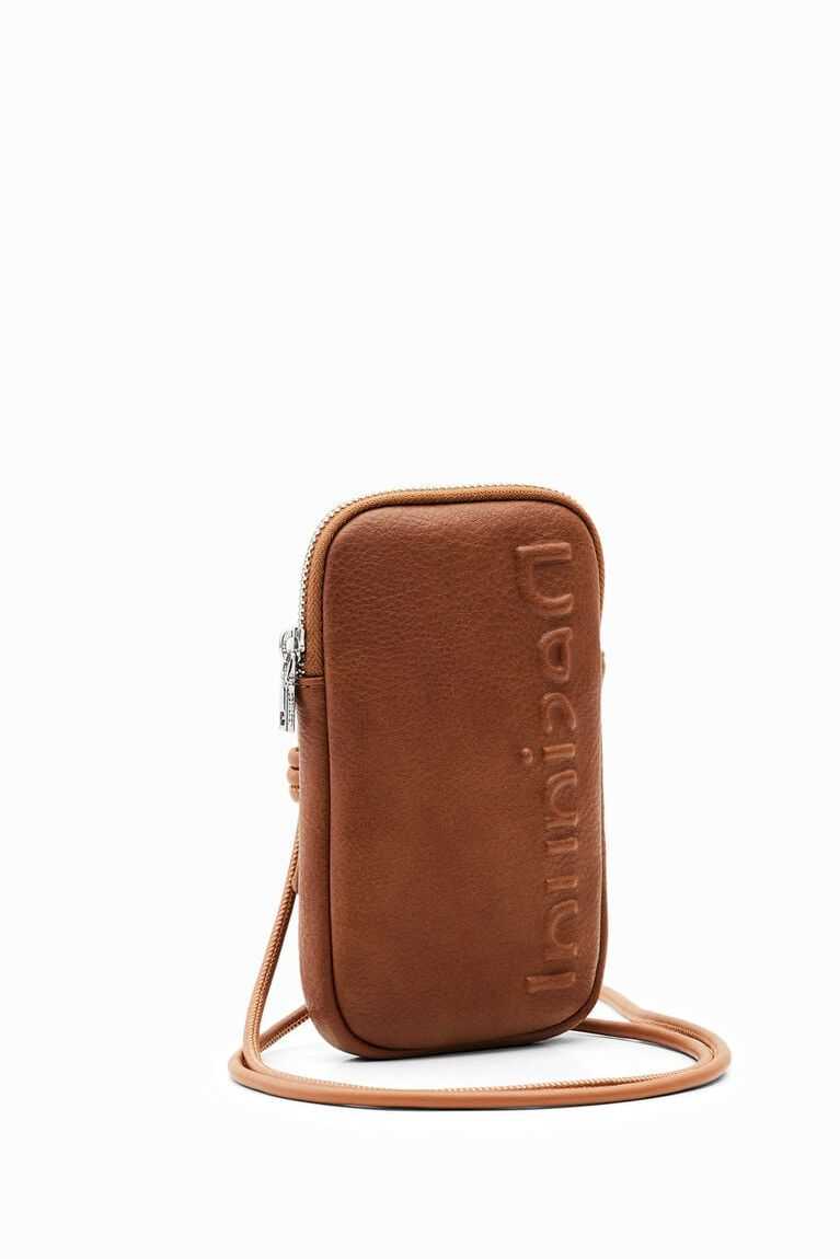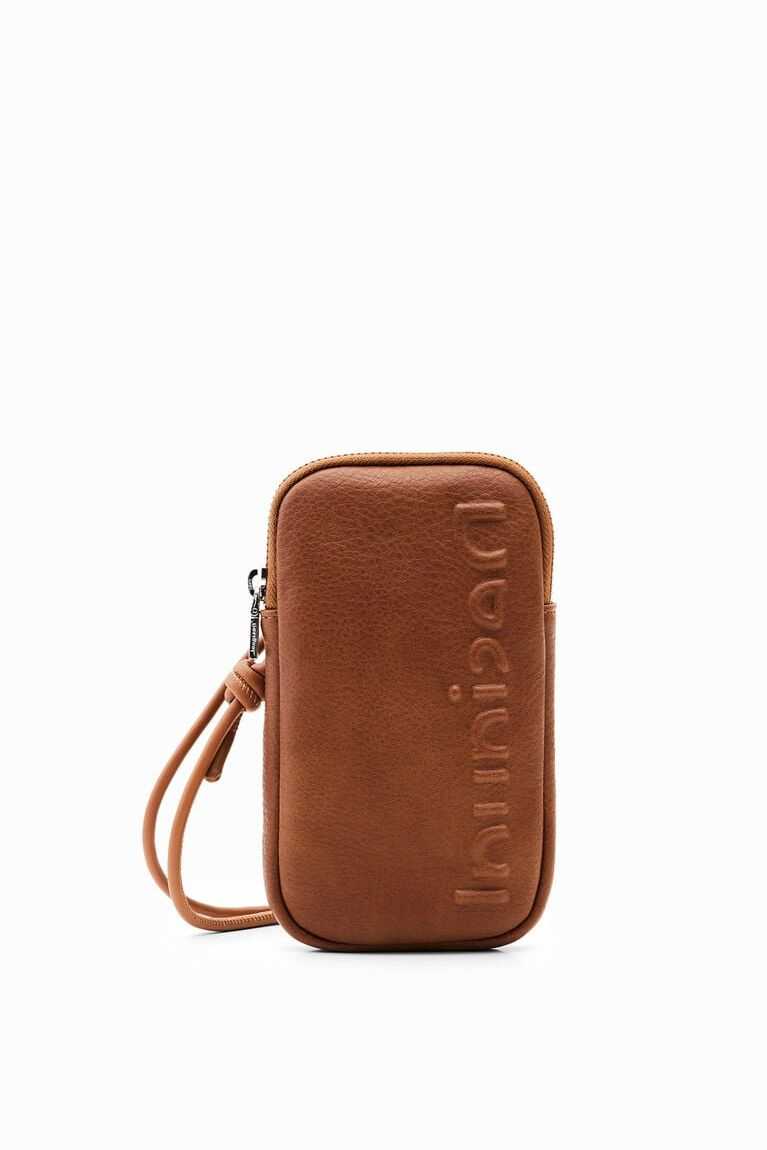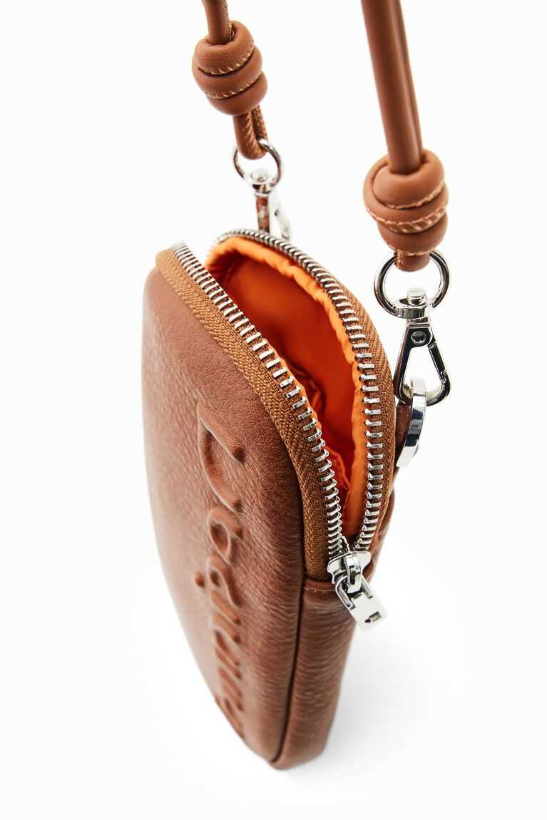 A smartphone holder in leather-effect fabric with an embossed logo, zip closure and several pockets.