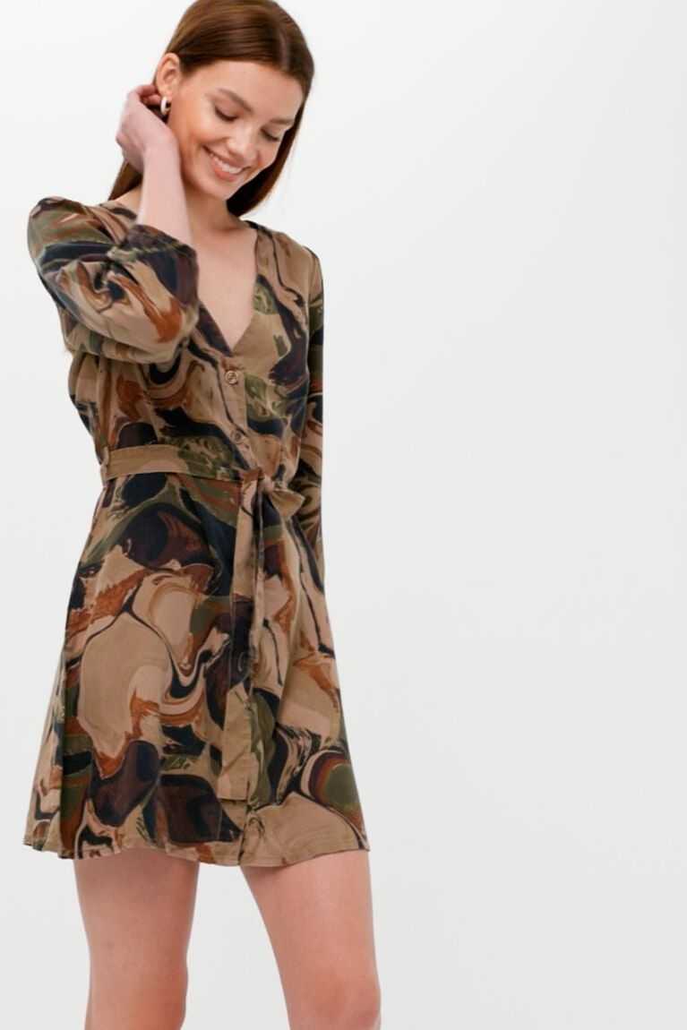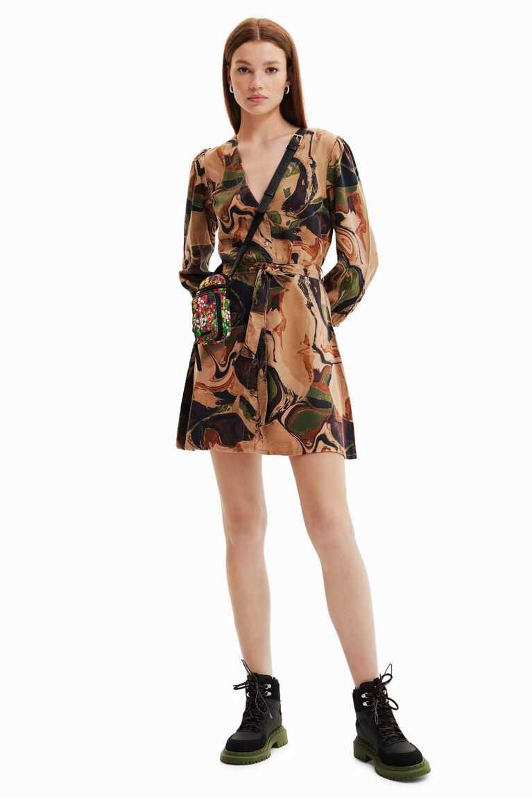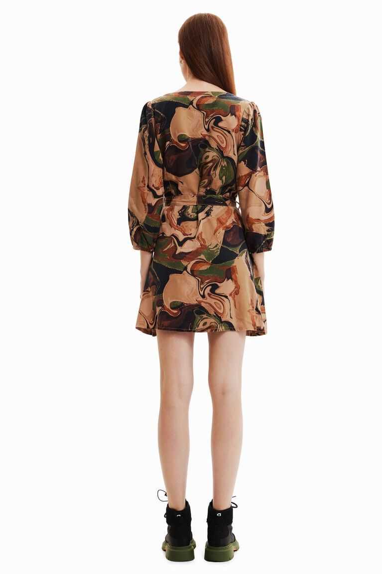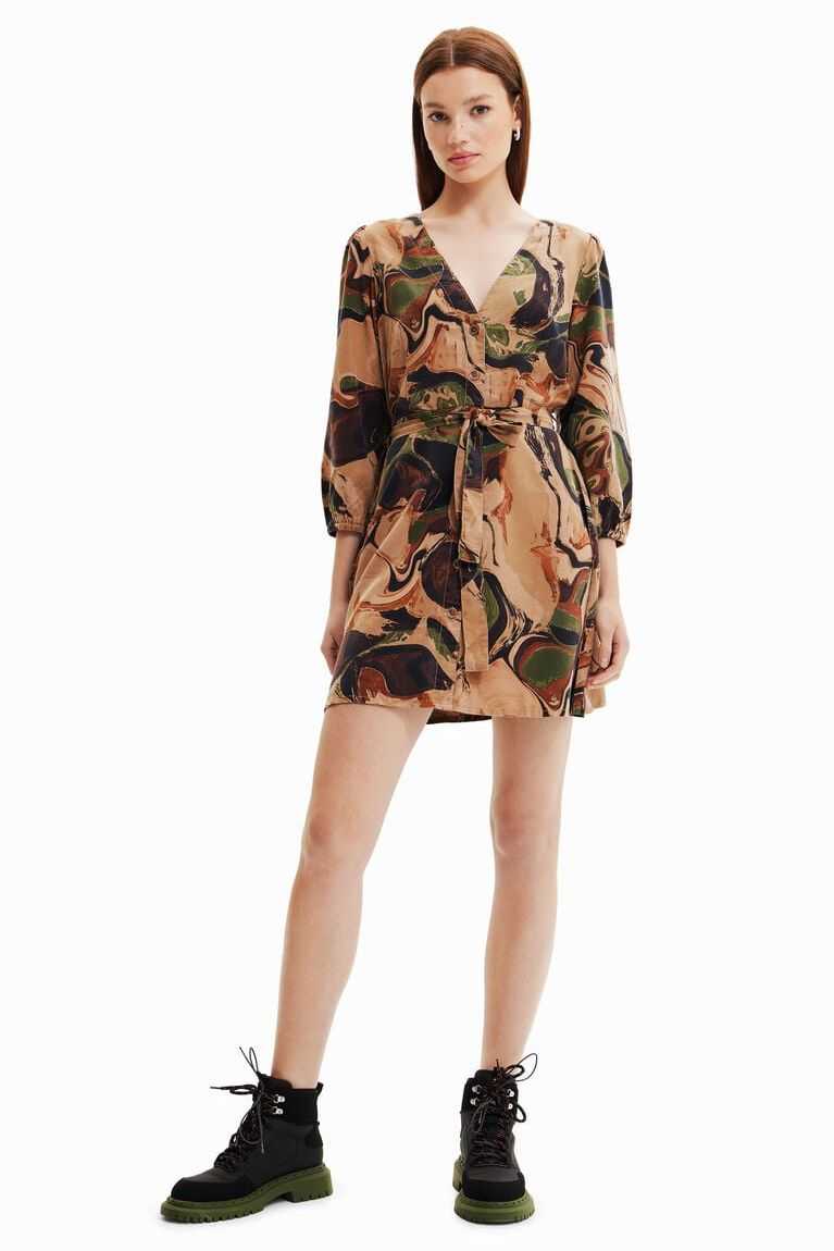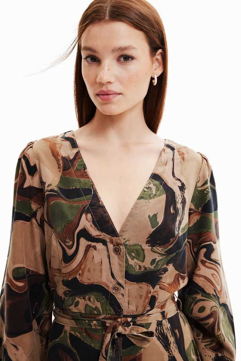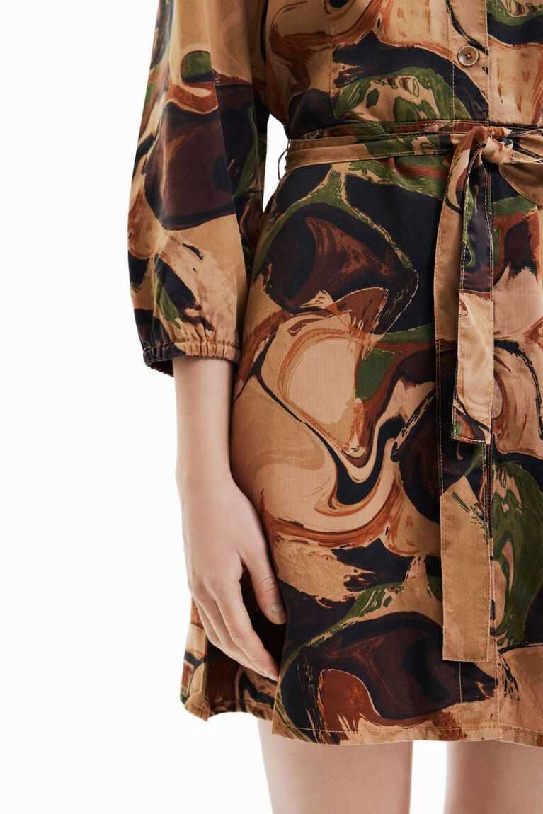 A short shirt dress with a camouflage print and button fastening. Made from eco-friendly fibres to produce a dress with substance that is still fresh.