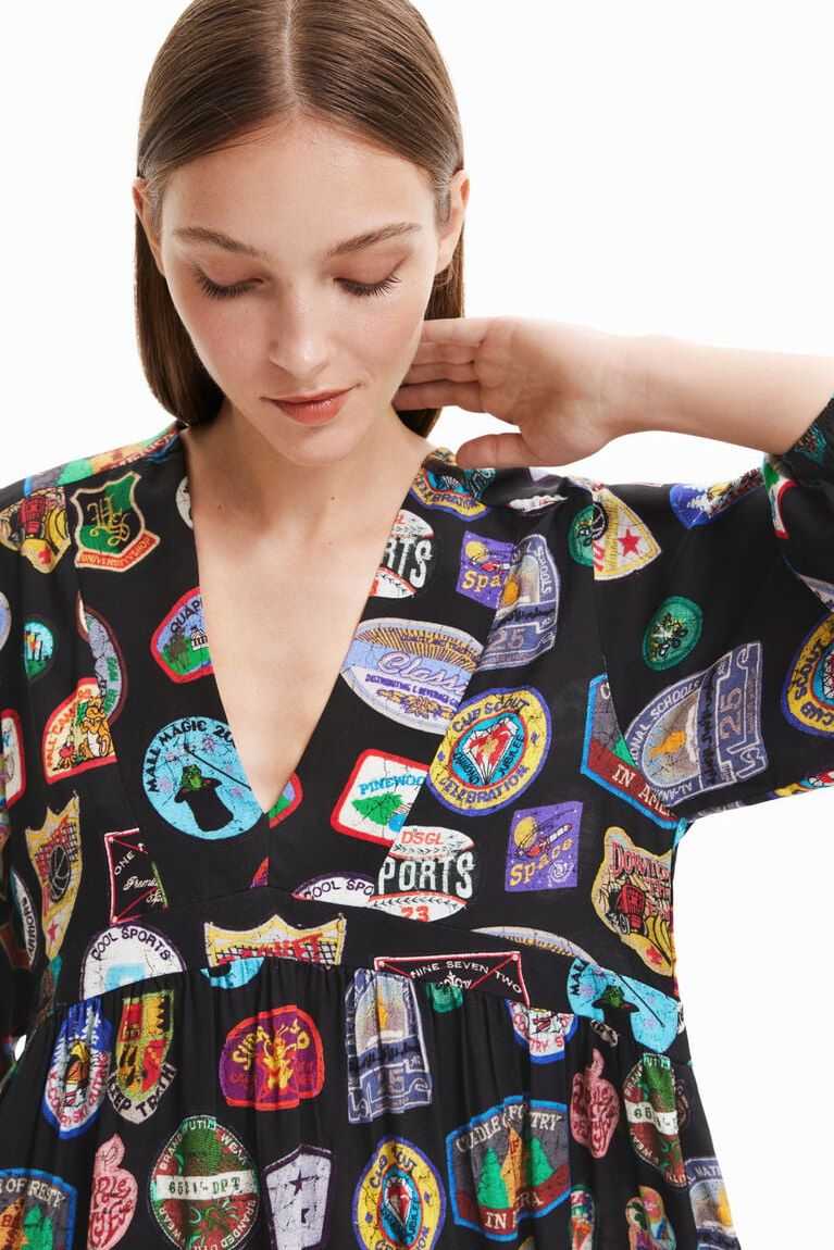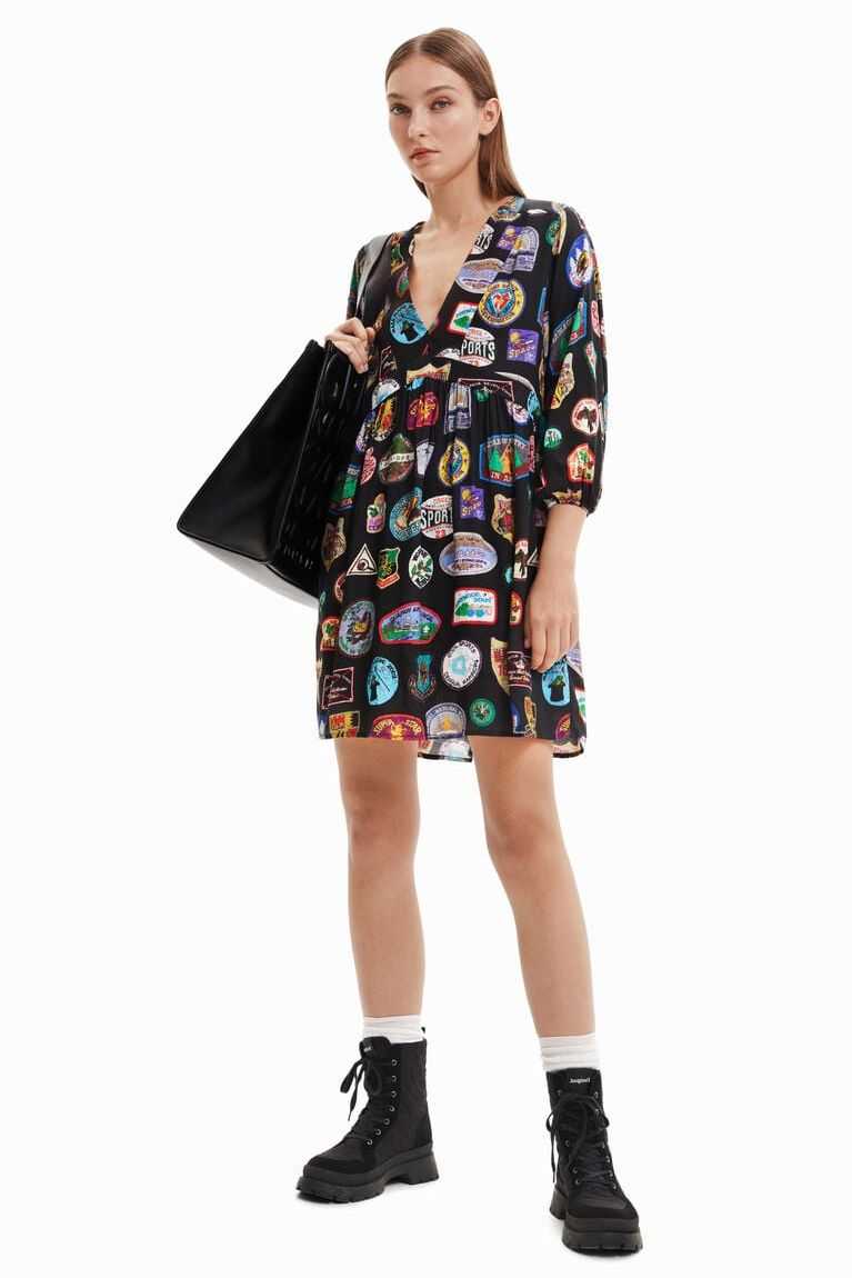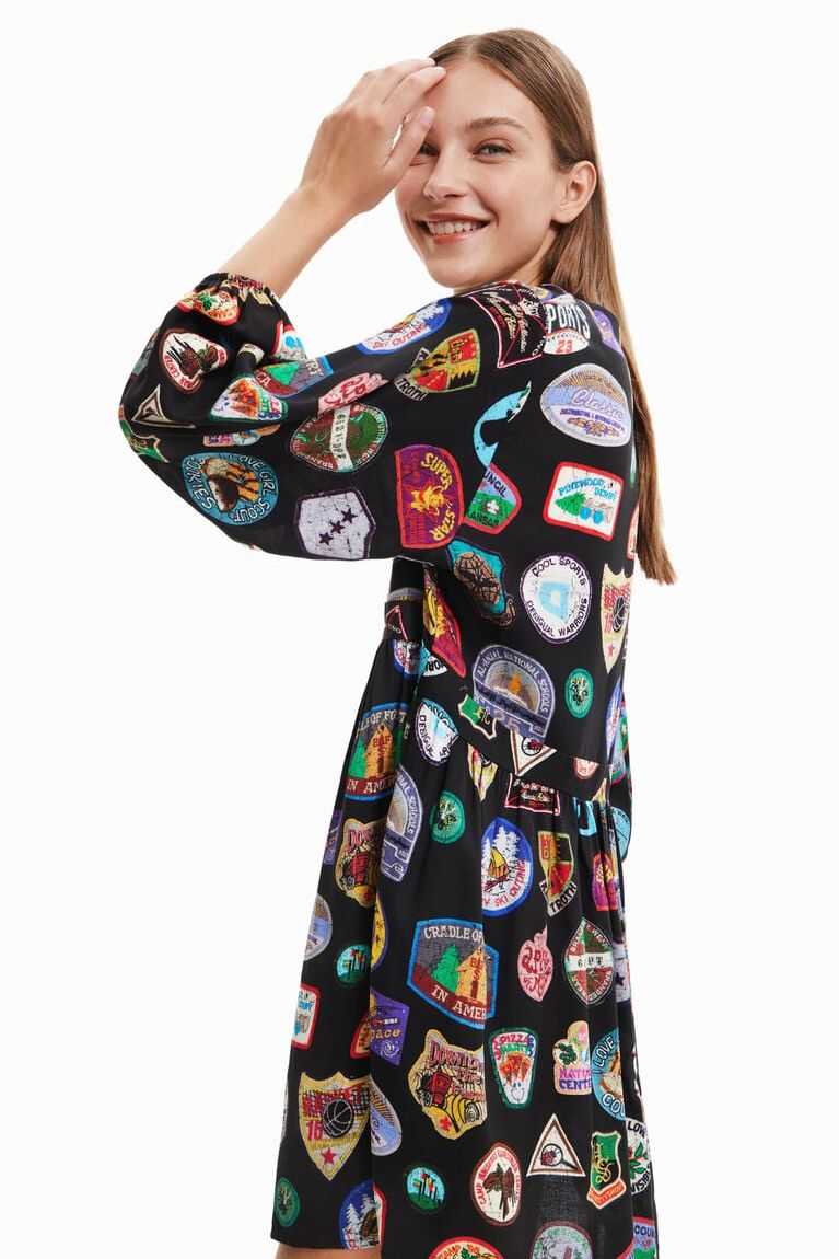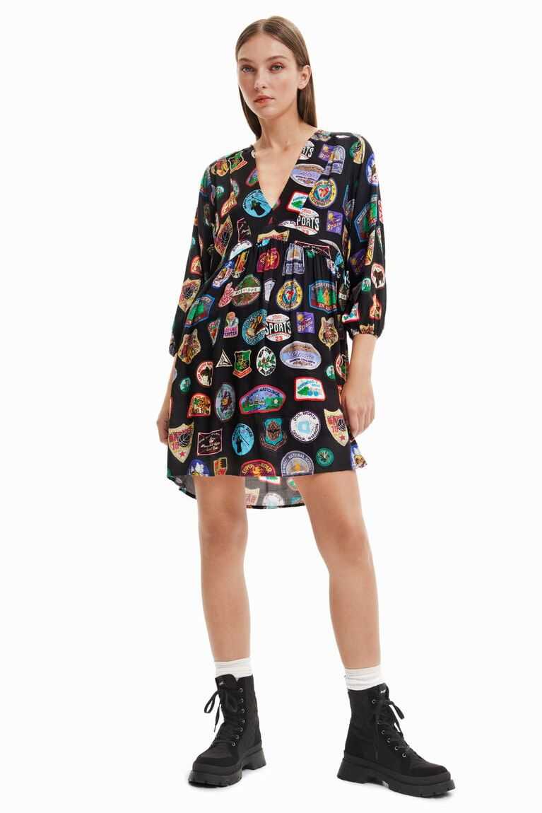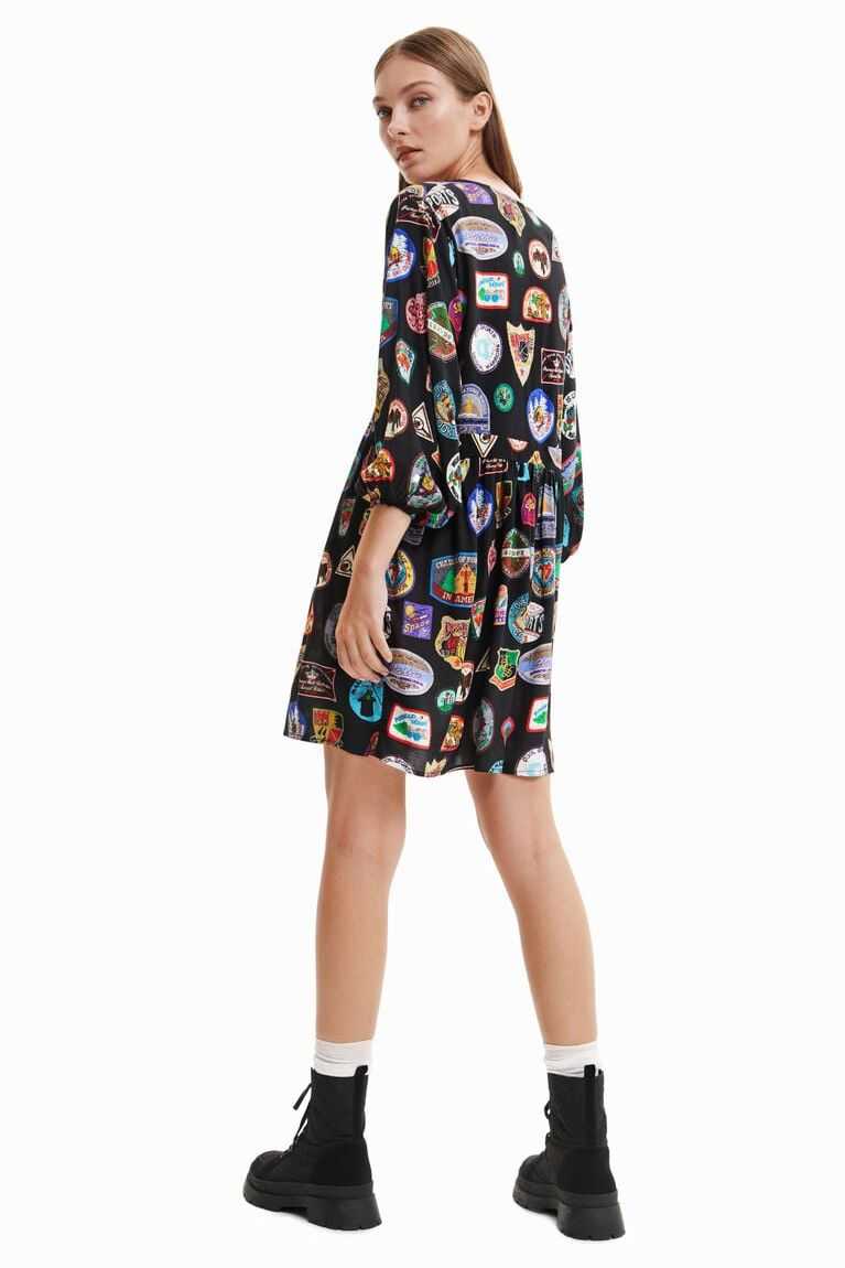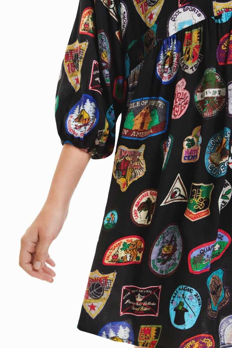 A short floaty dress with balloon sleeves, made from cotton with a digital patch print.