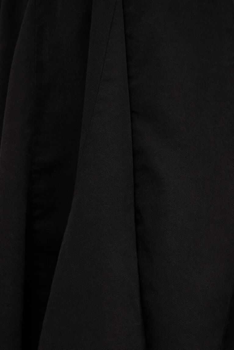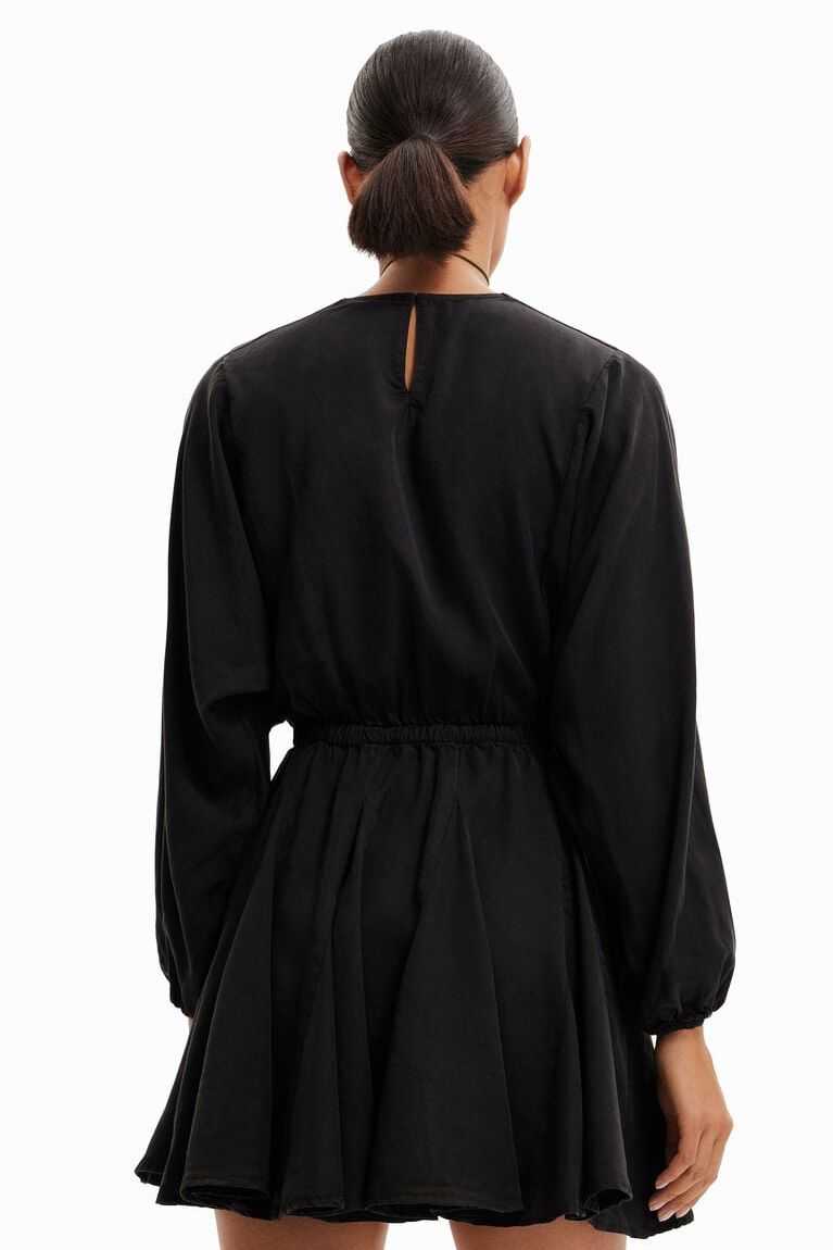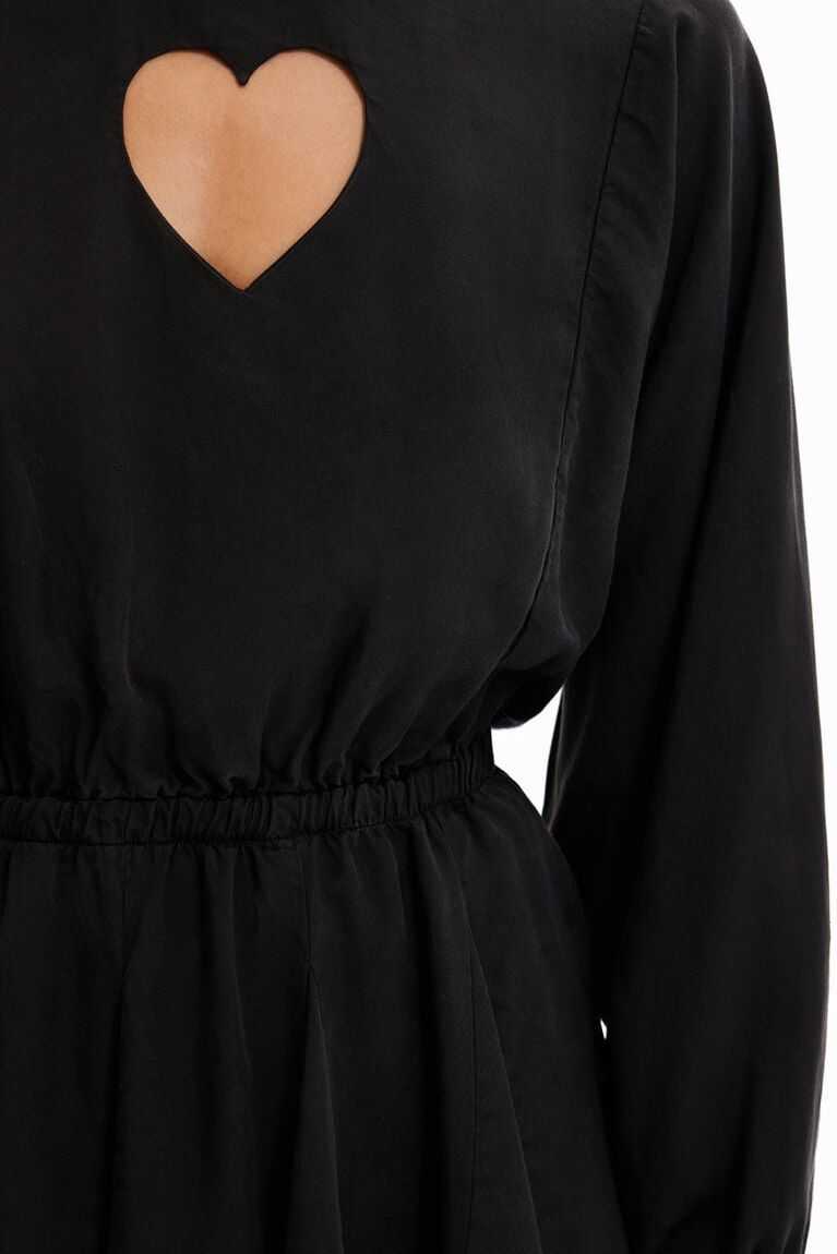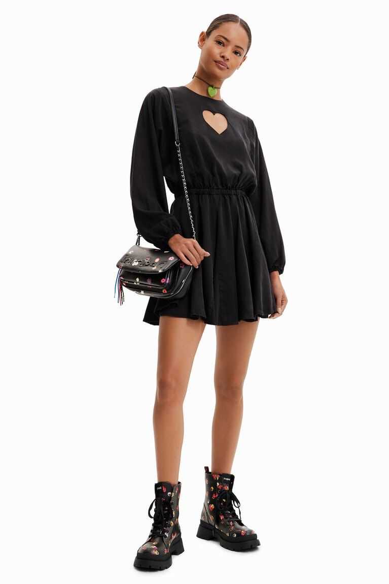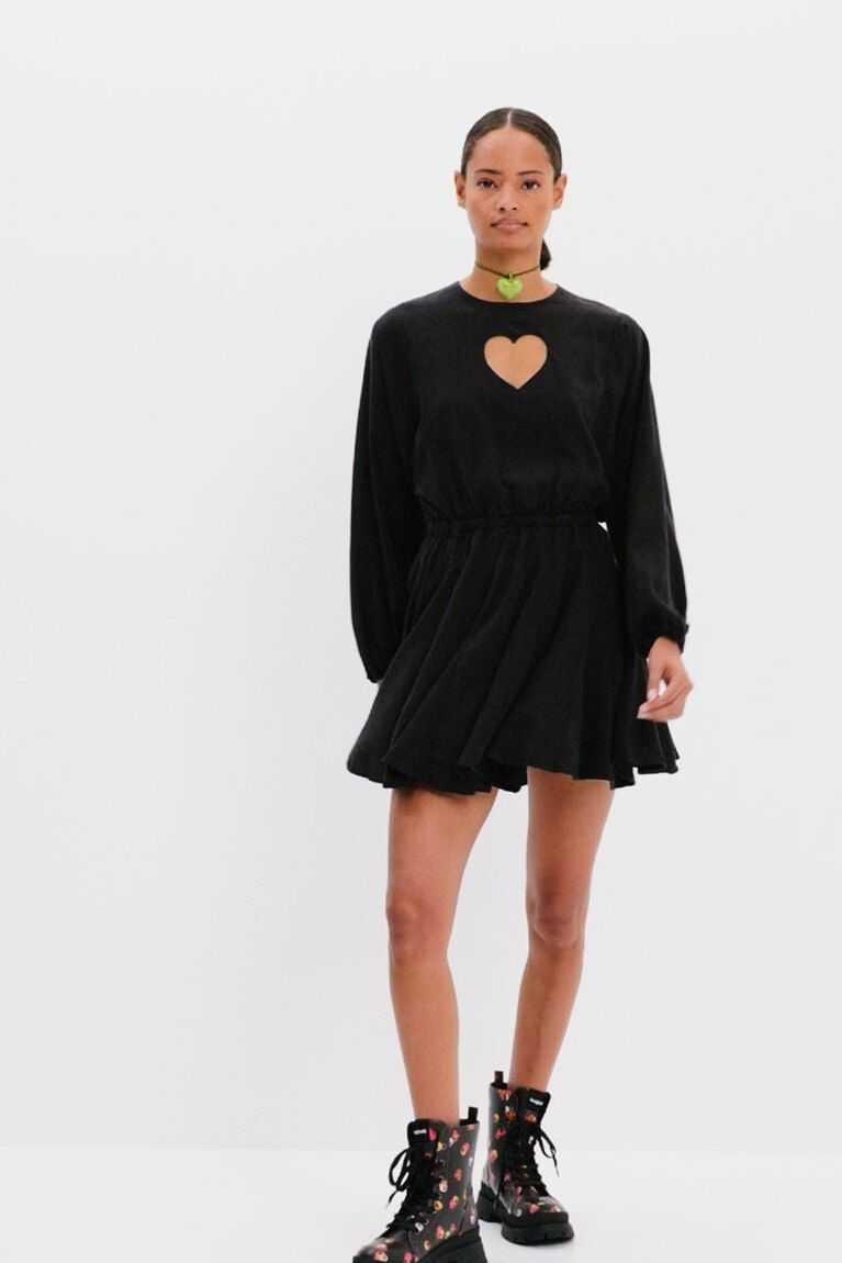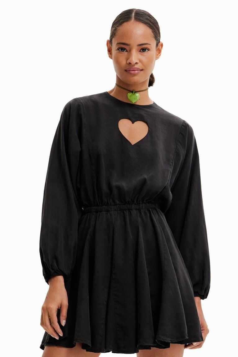 A short plain dress with long balloon sleeves, a gathered waist and a heart cut-out on the chest.