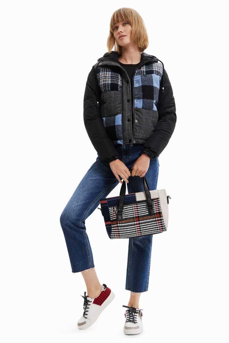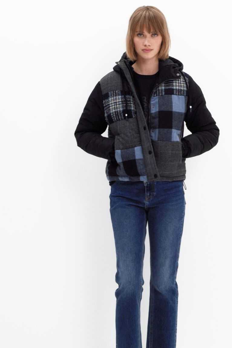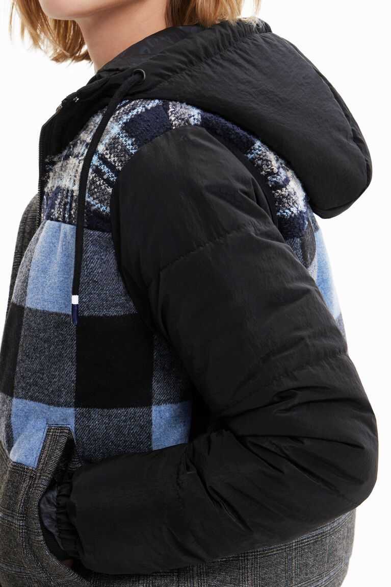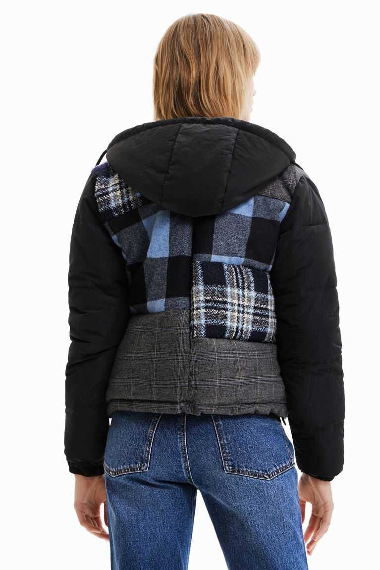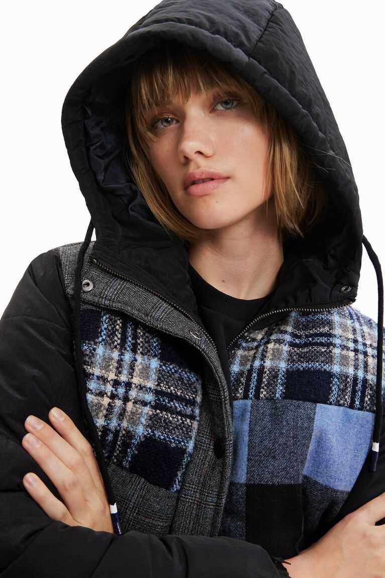 This quilted jacket, made from recycled fibres, features a plaid patchwork in the centre. With a hooded collar and adjustable waist to keep in the warmth.