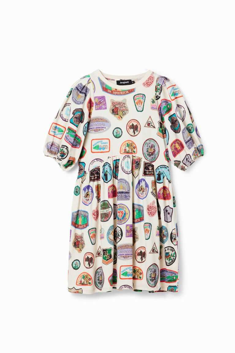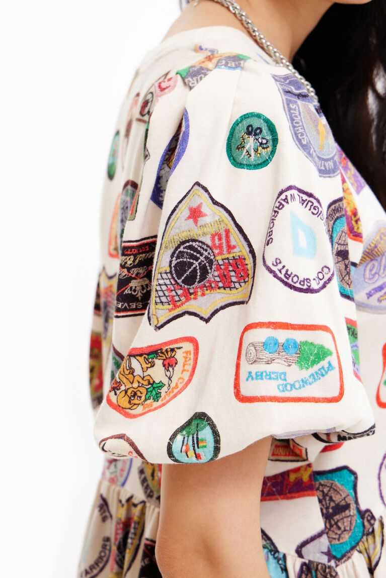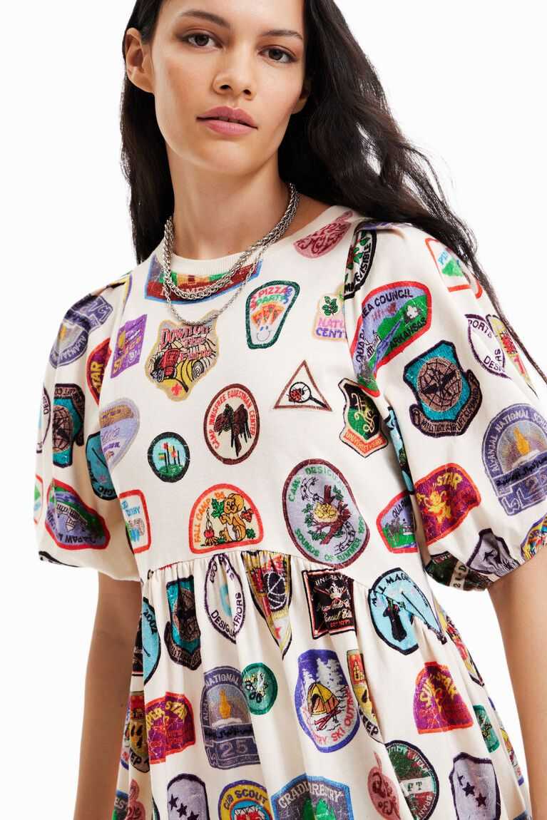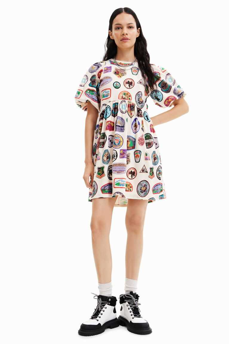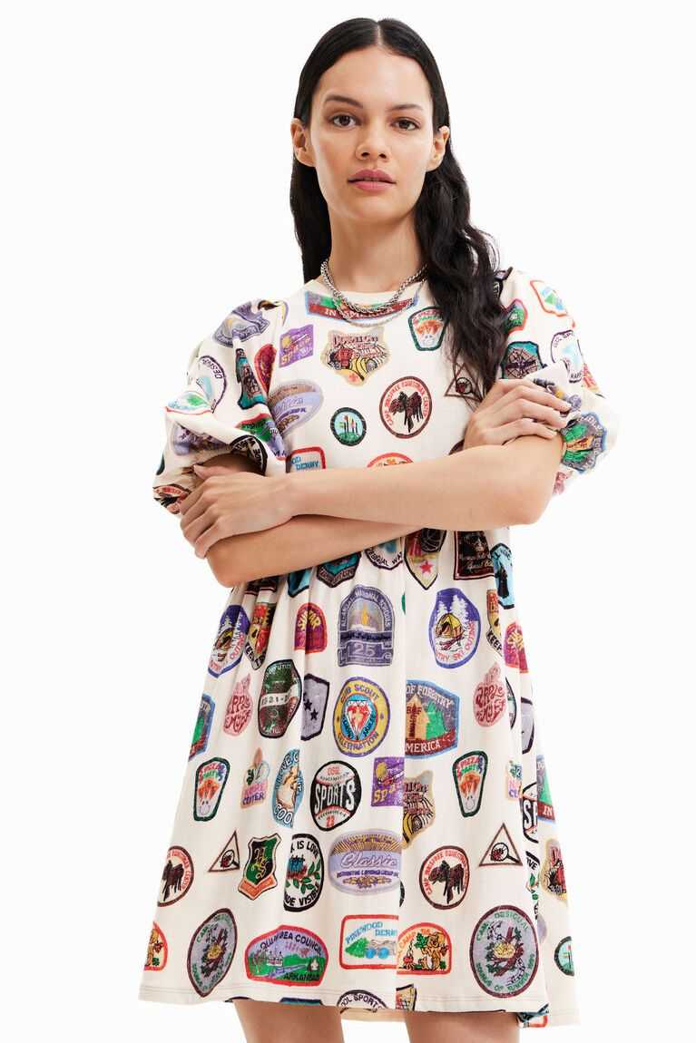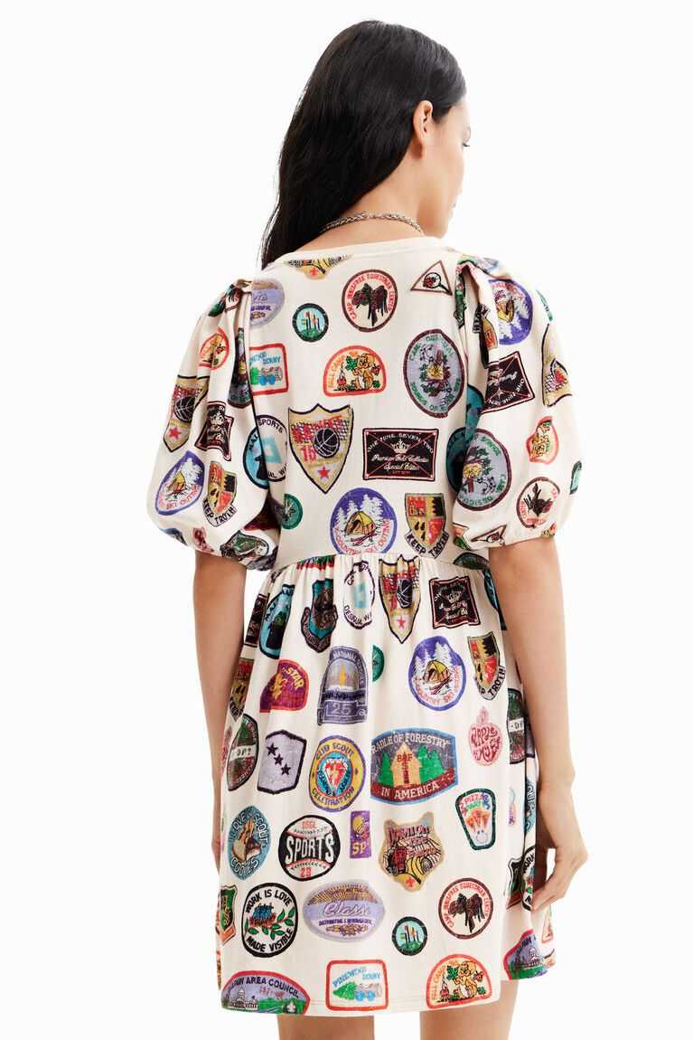 A short floaty dress with balloon sleeves, made in cotton with a digital patch print.