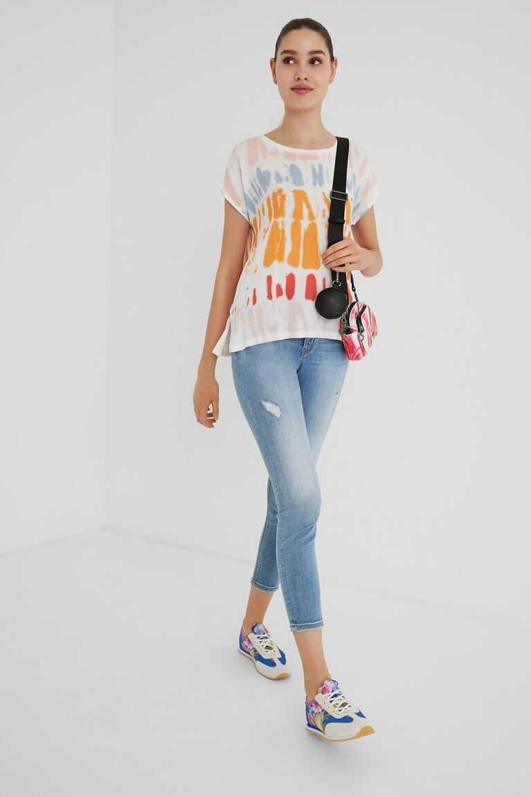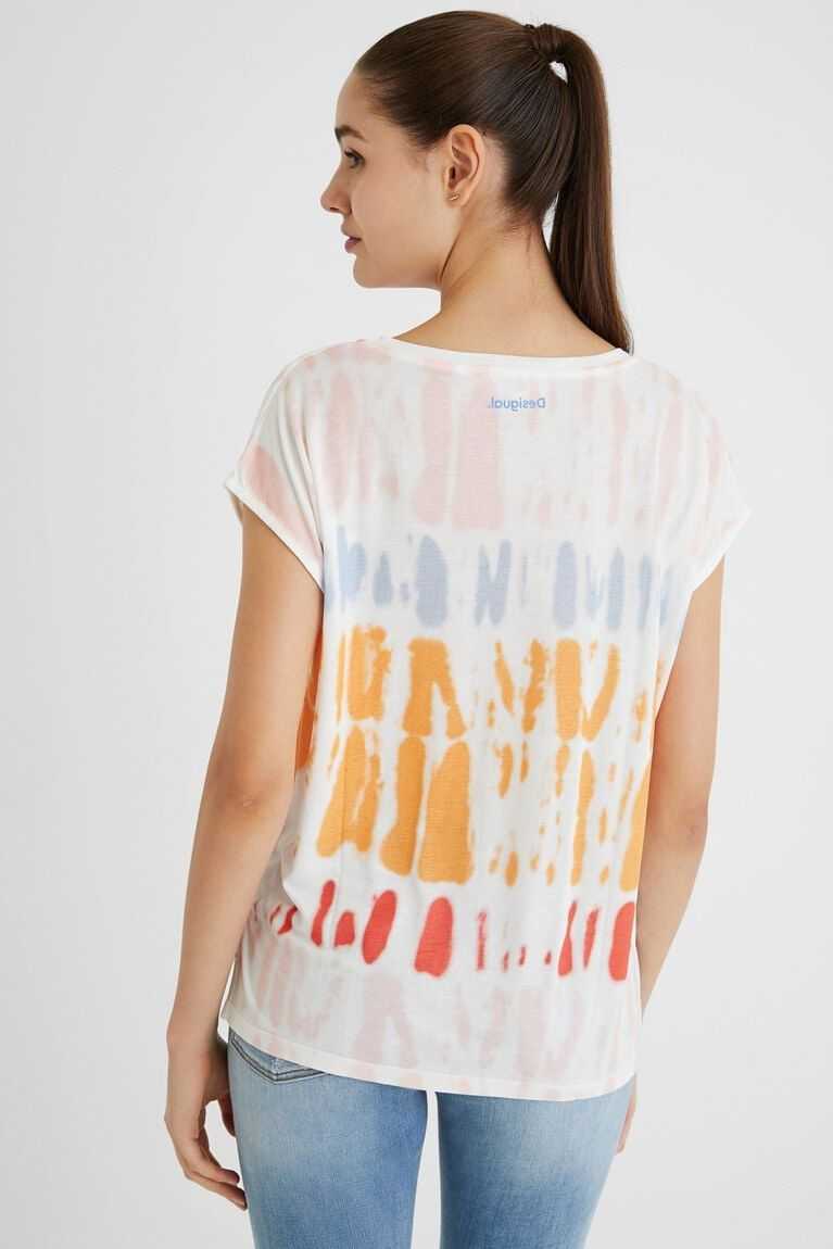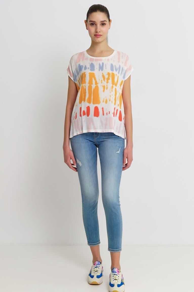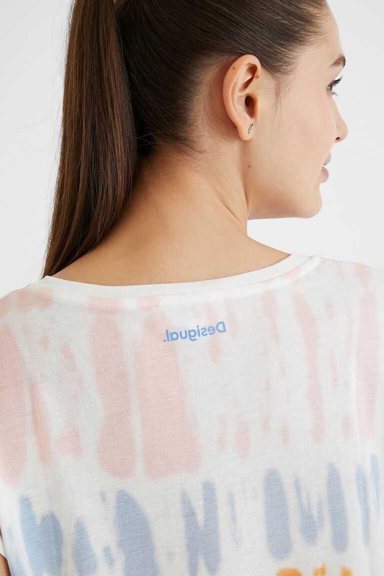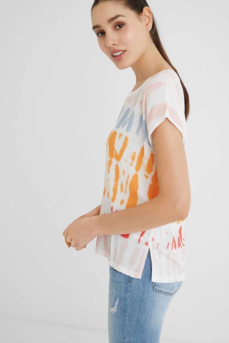 The diaphanous and flowing fabric of this loose short sleeve T-shirt is as cool as its own print