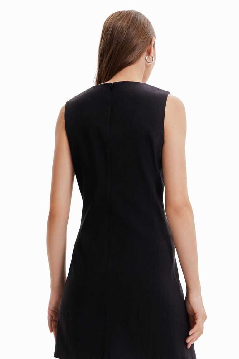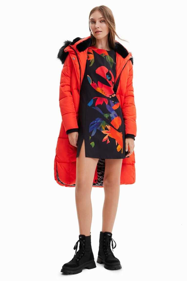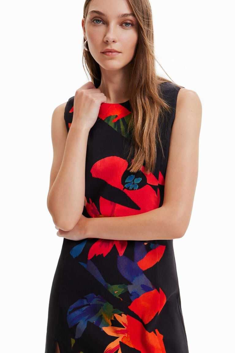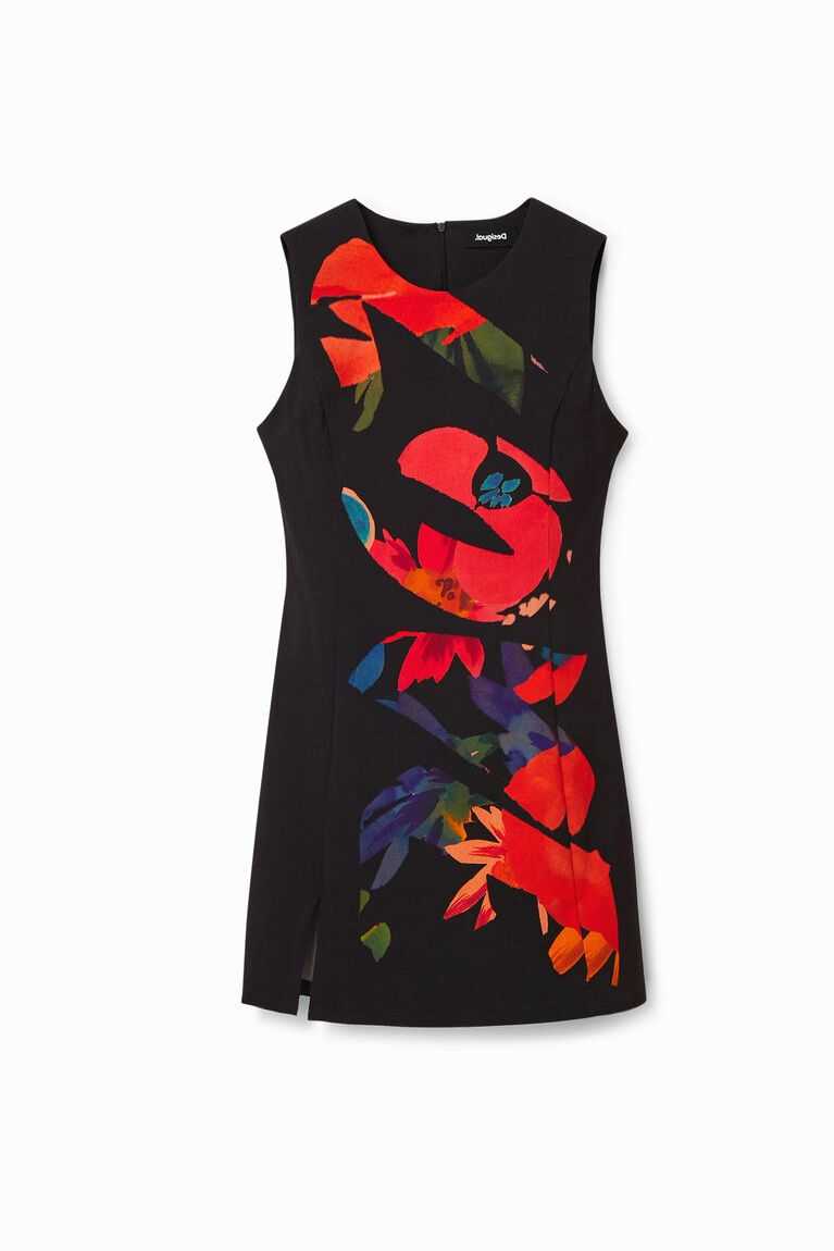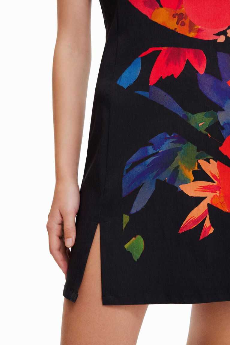 A short fitted dress with a small slit on the leg, featuring a print of large flowers and a lot of colour on the front.
