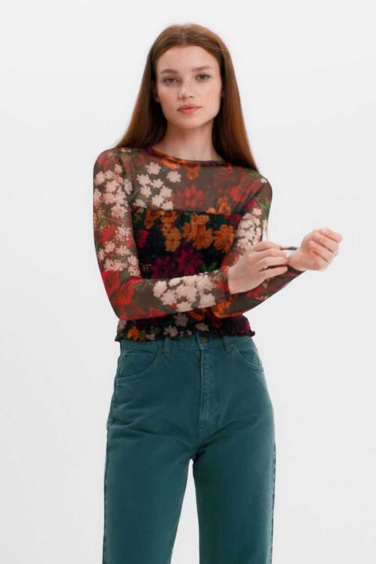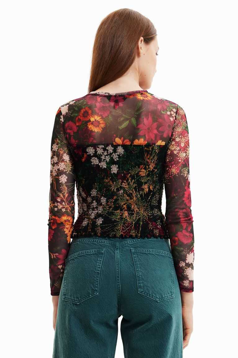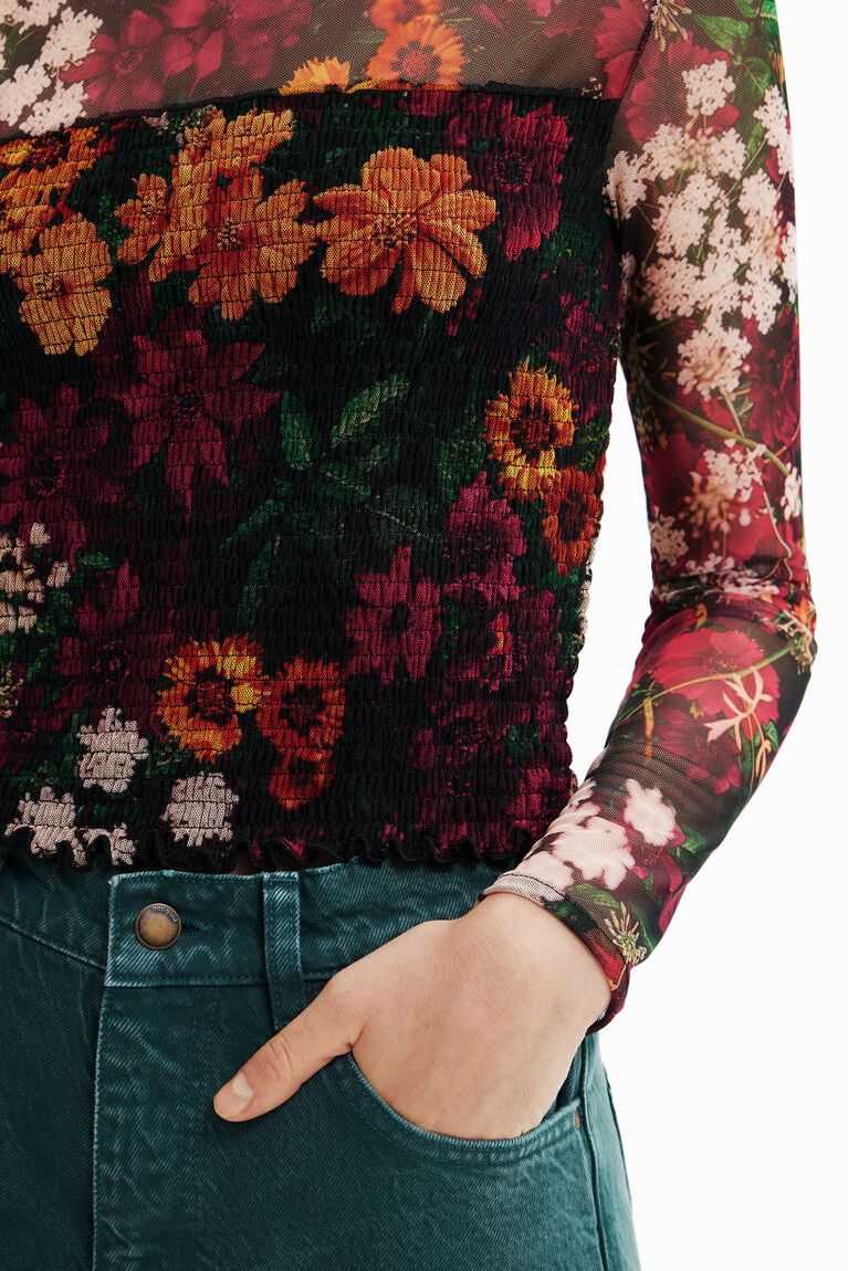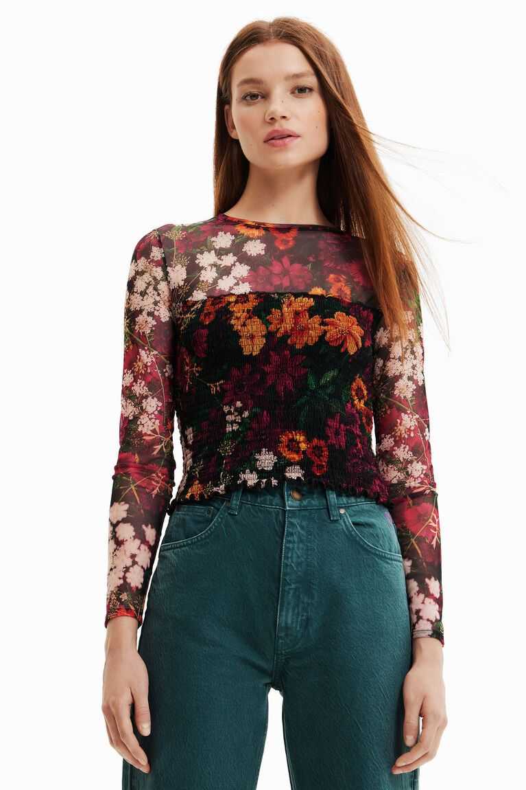 A short fitted tulle T-shirt with long sleeves, a stretch smock-stitch body and a floral print.