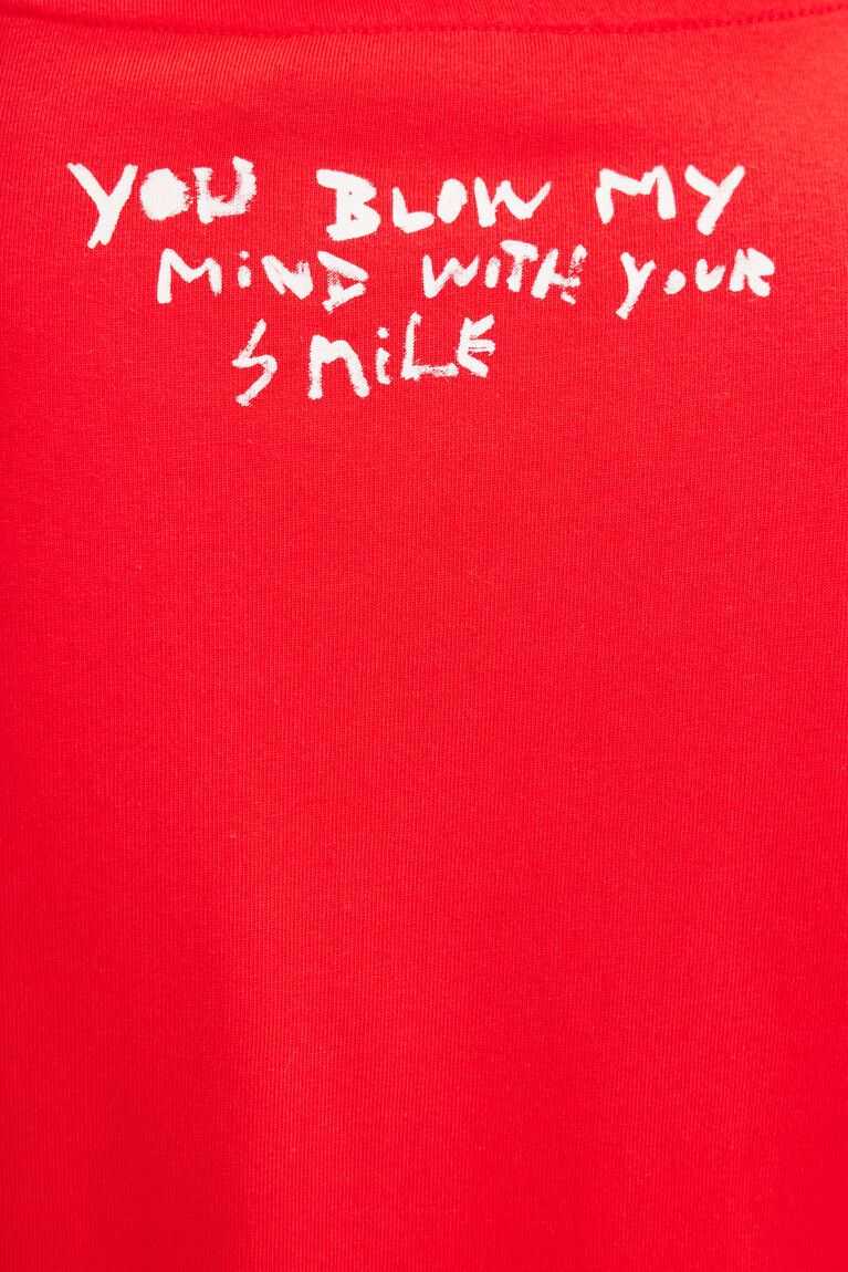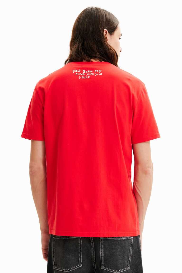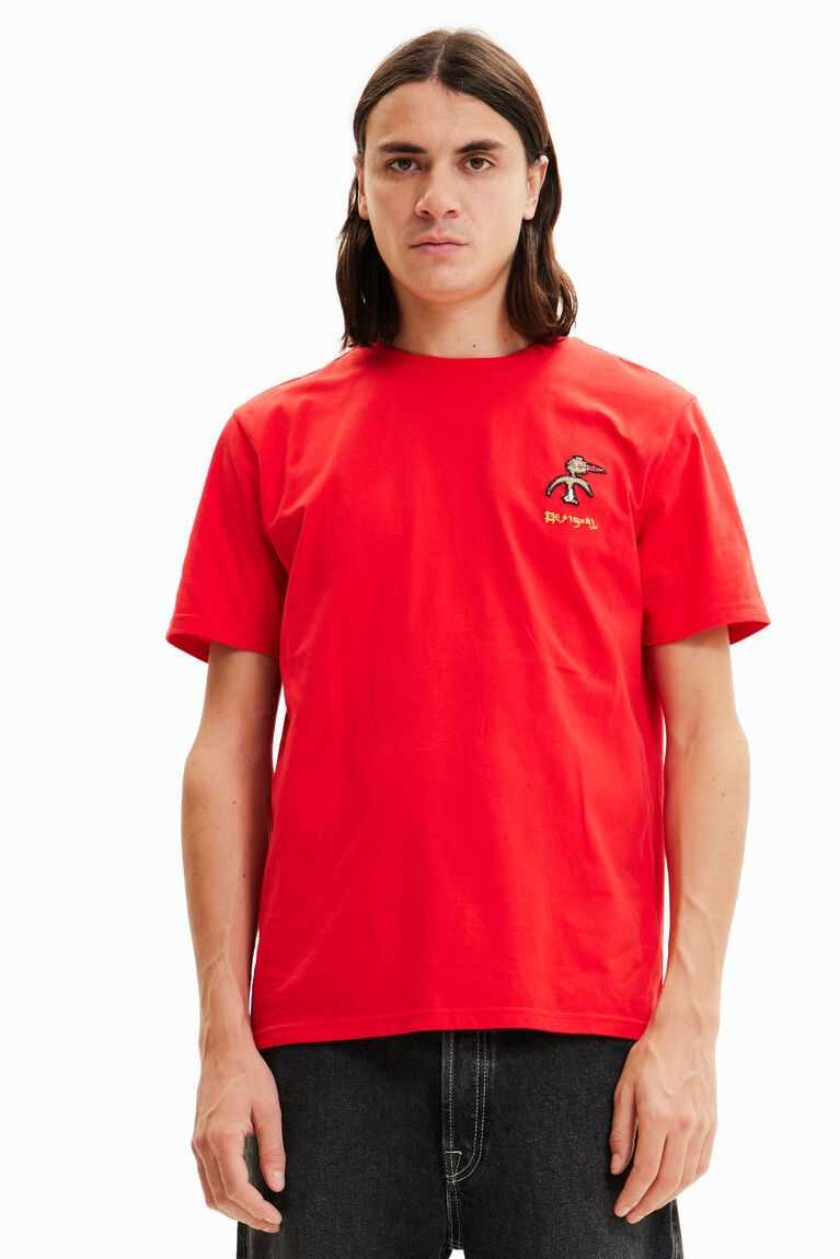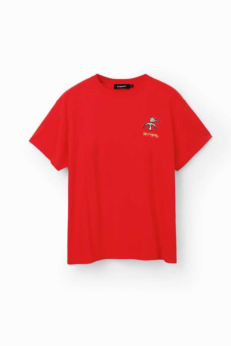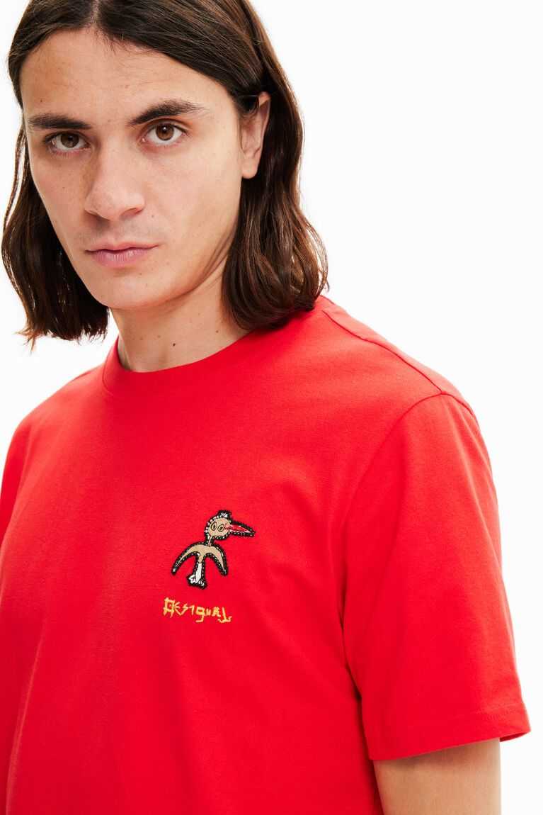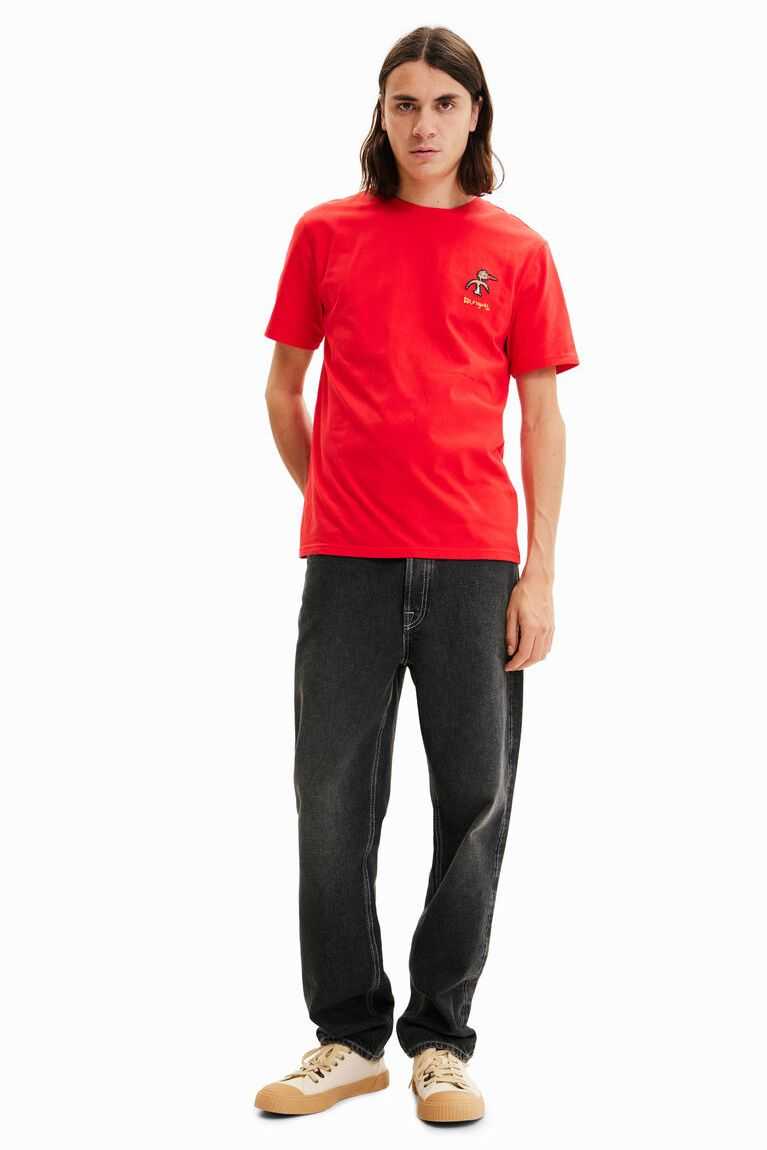A short-sleeve T-shirt with a front bird patch plus text and an illustration on the back.