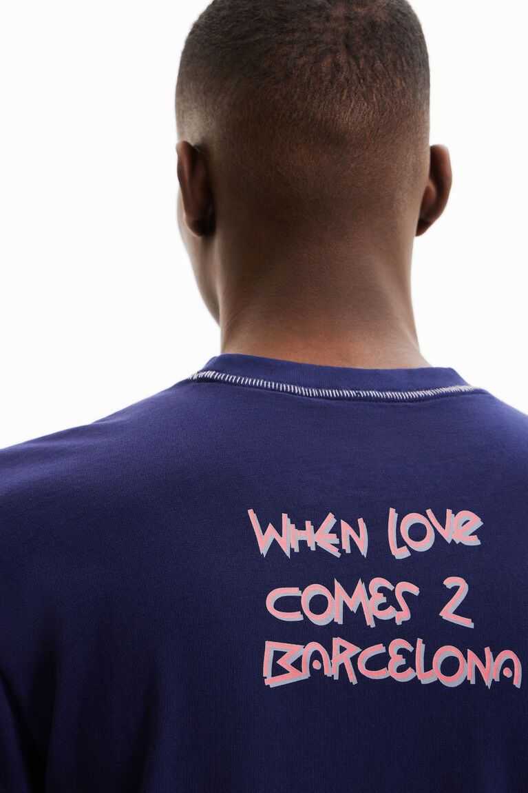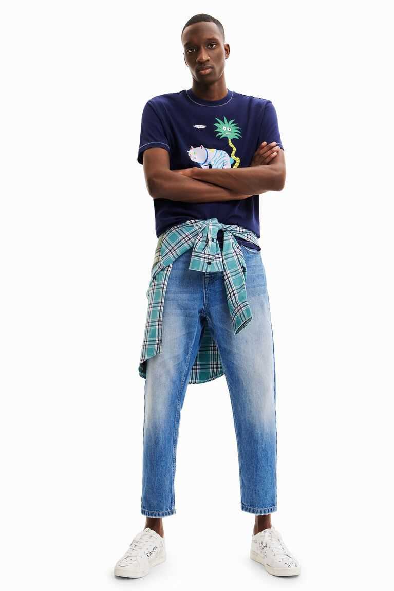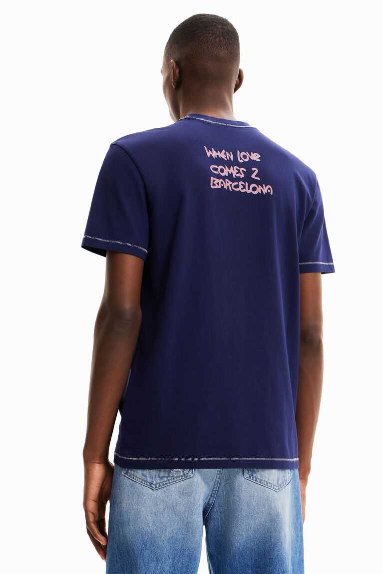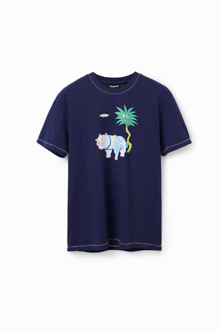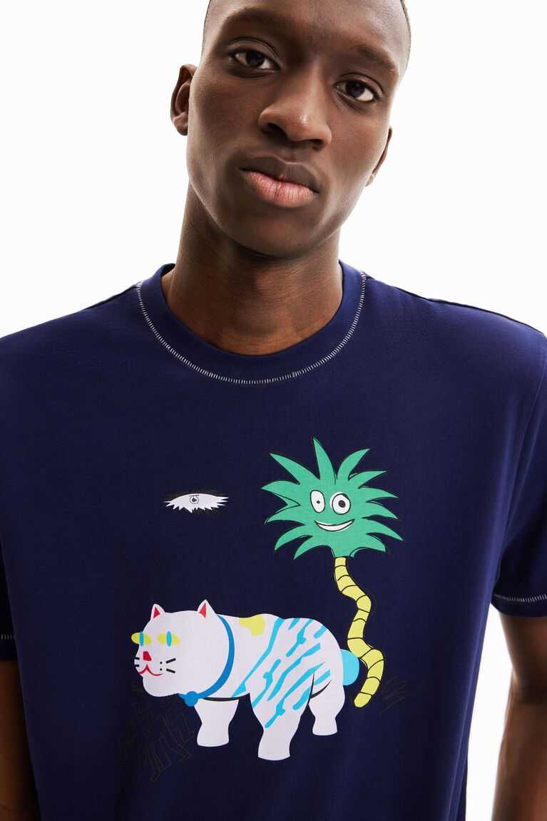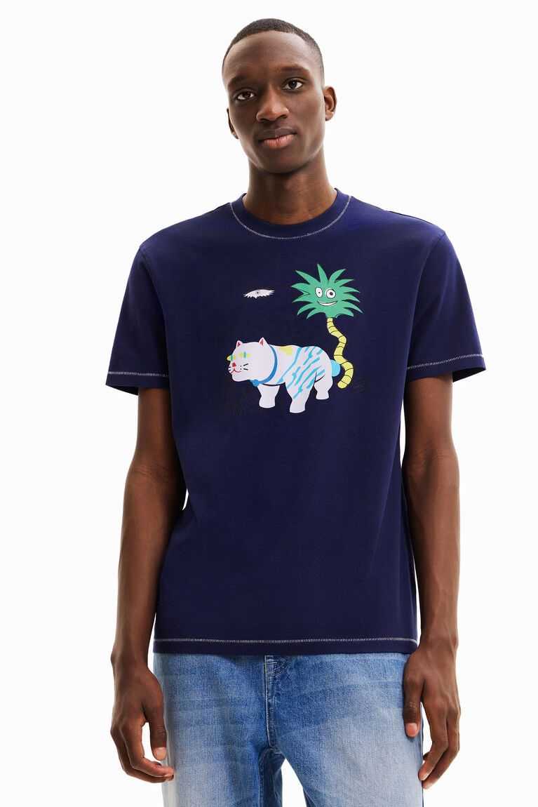 A short-sleeve cotton T-shirt with a full-colour positional print on the front featuring the Raval (Barcelona) cat sculpture and backstitching details that appear handmade.