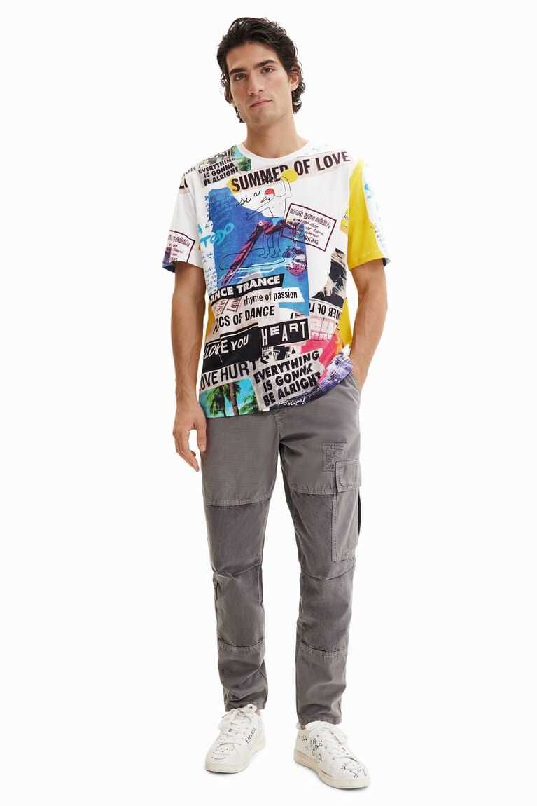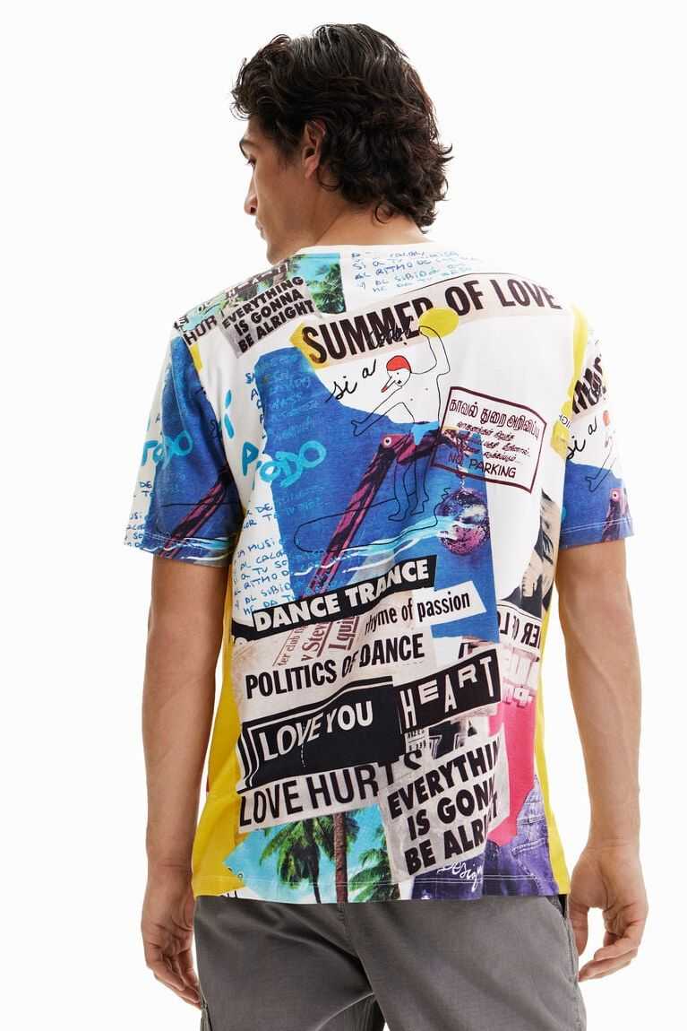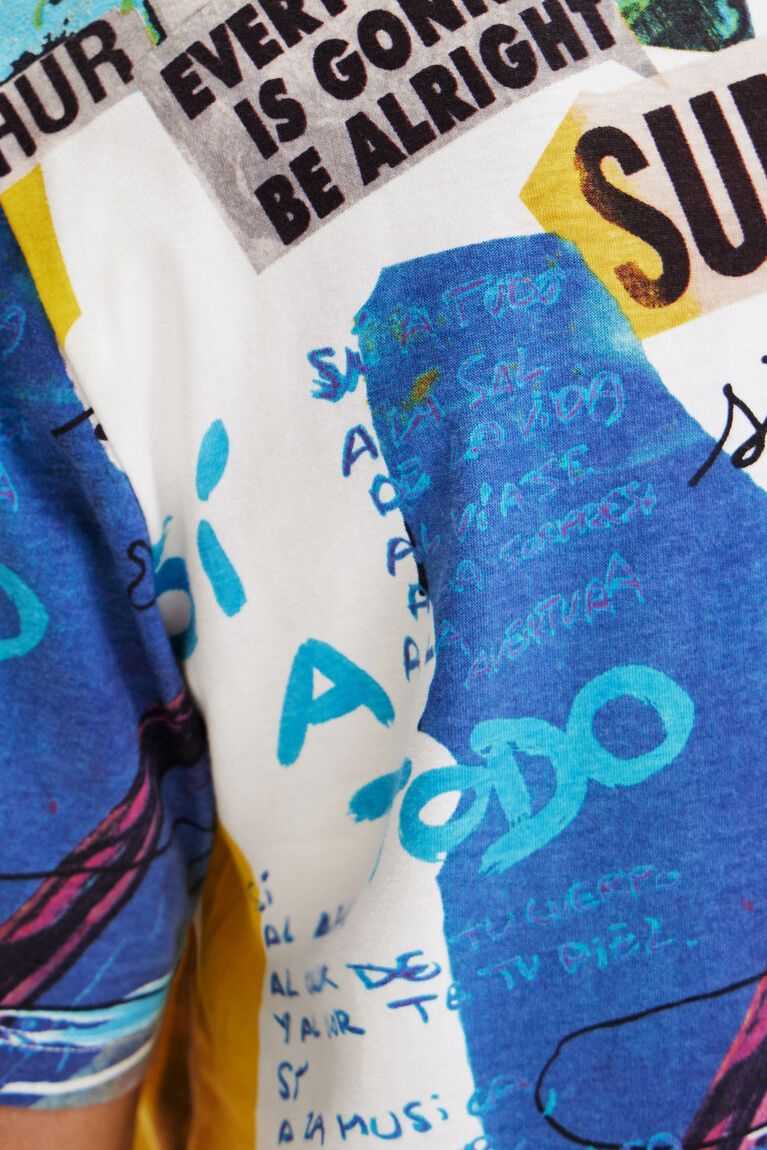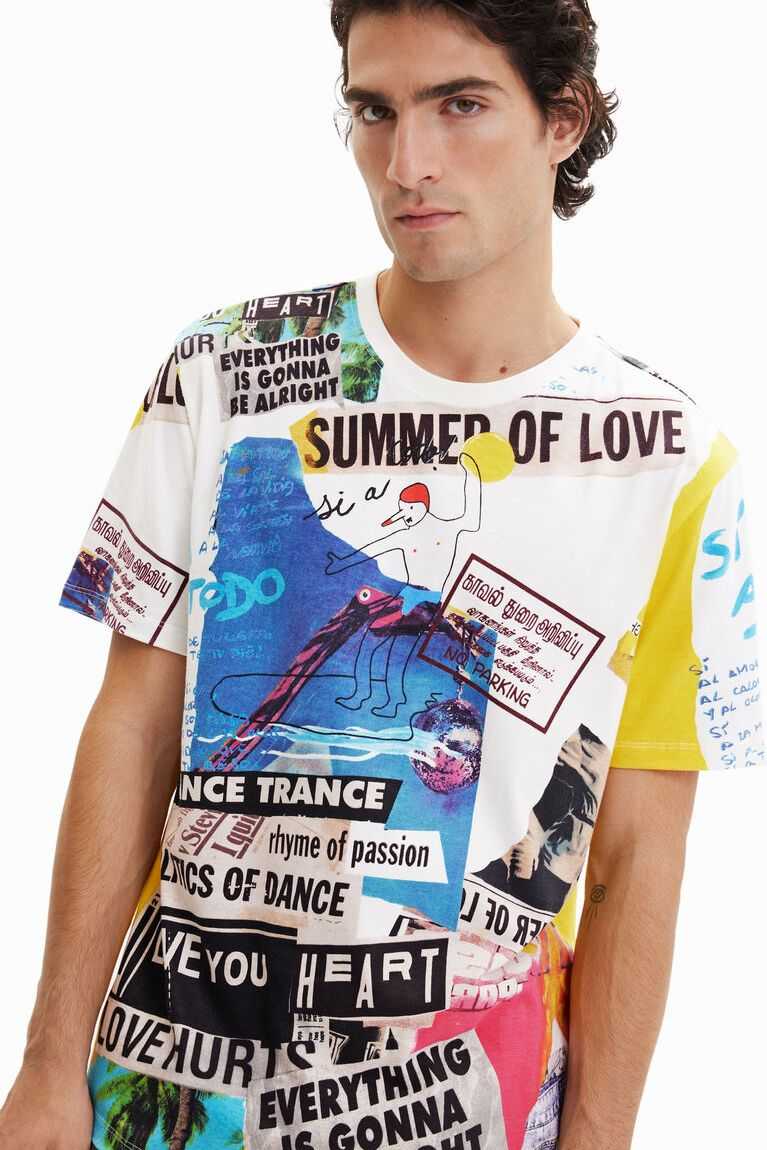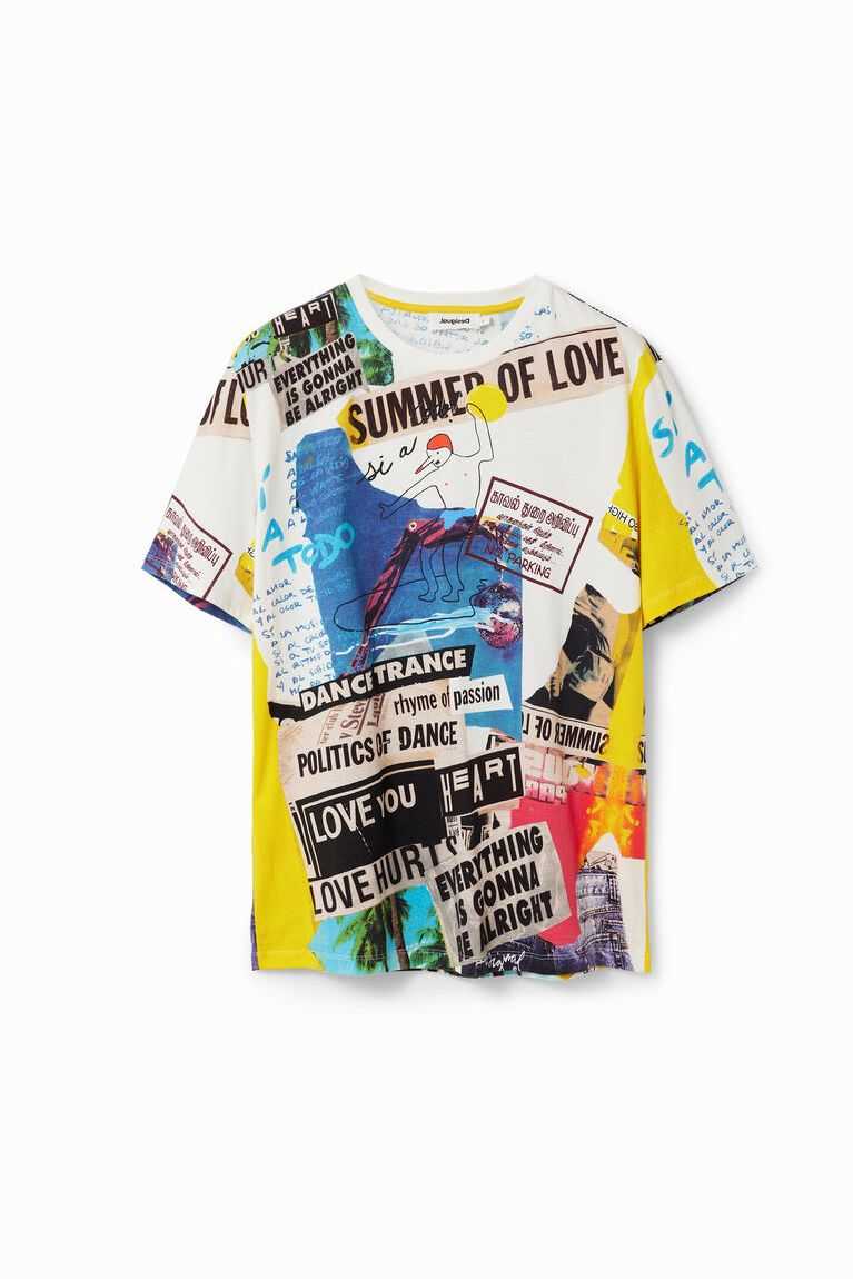 A short-sleeve T-shirt with a newspaper collage print and positive messages.