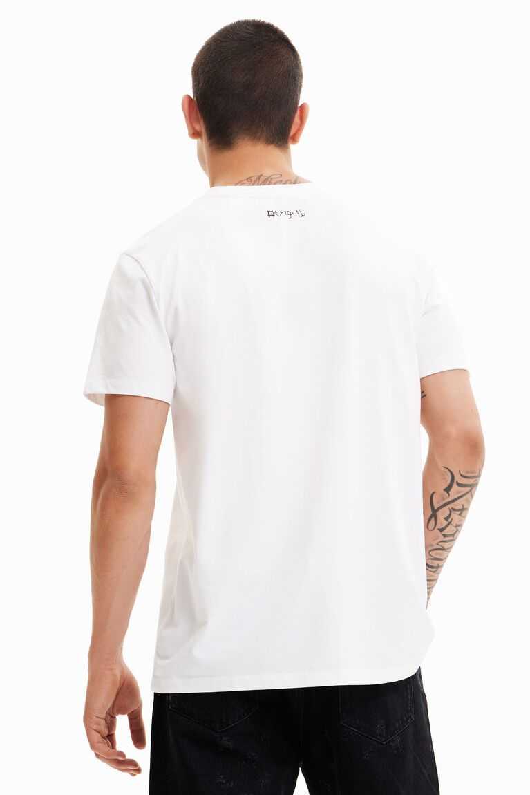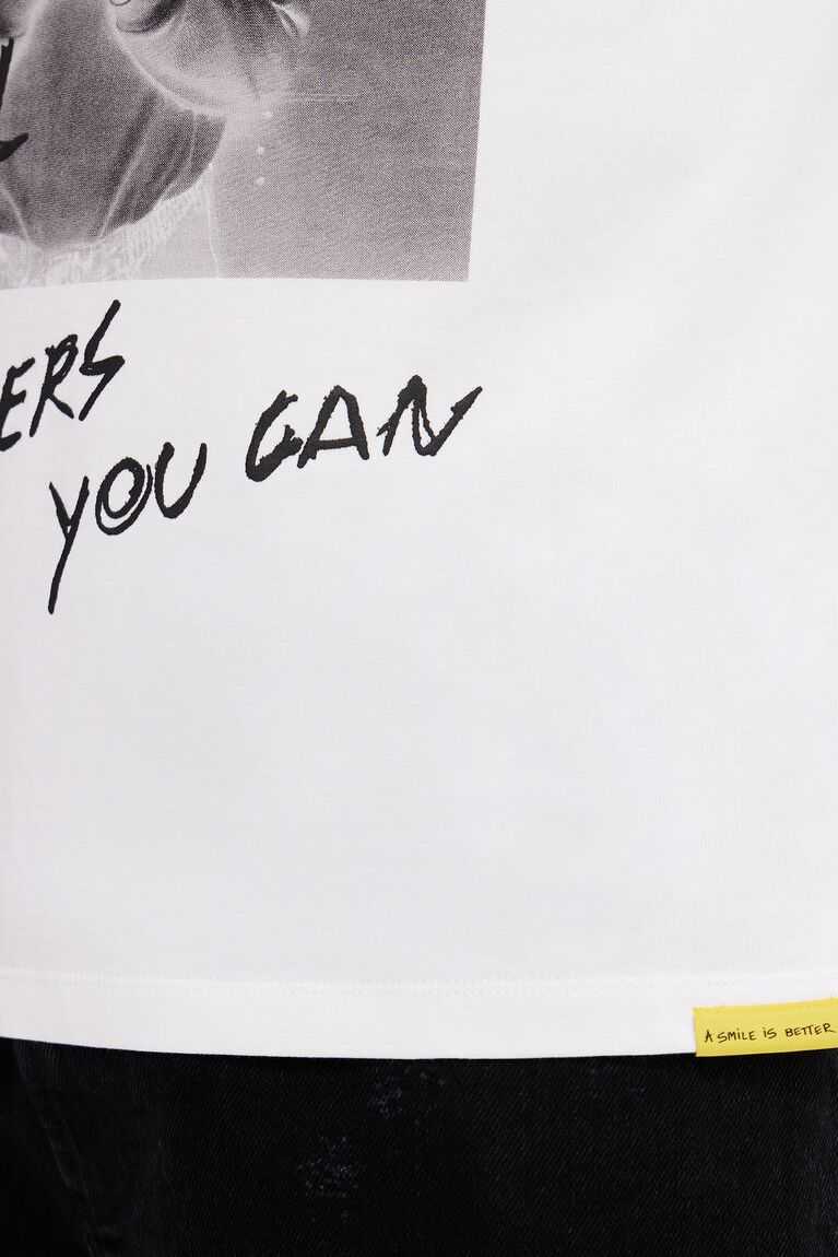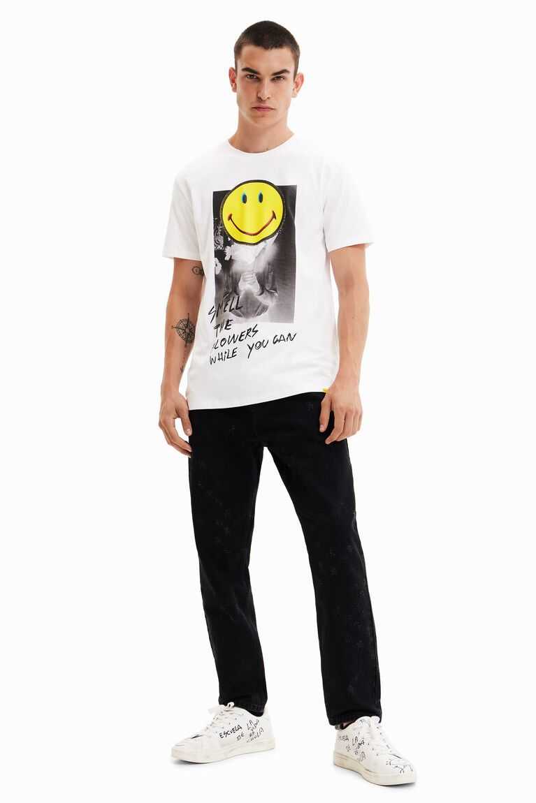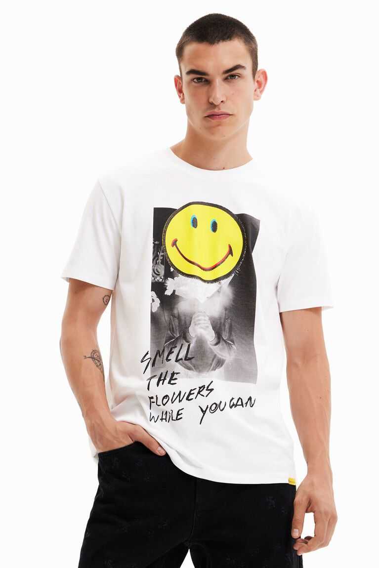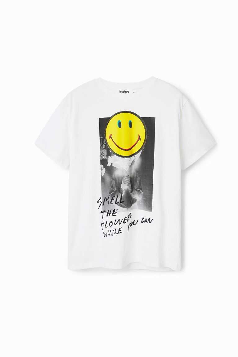 A short-sleeve, regular-fit T-shirt with a print of a large Smiley? on a vintage photo with messages.