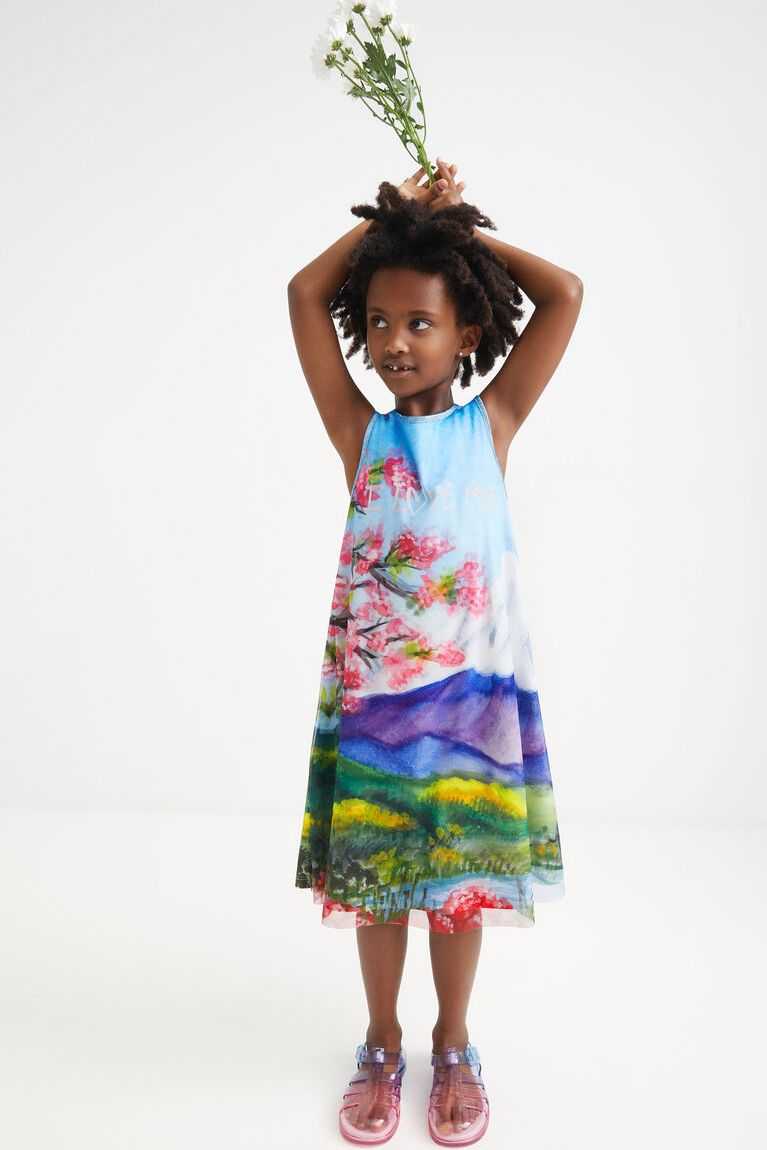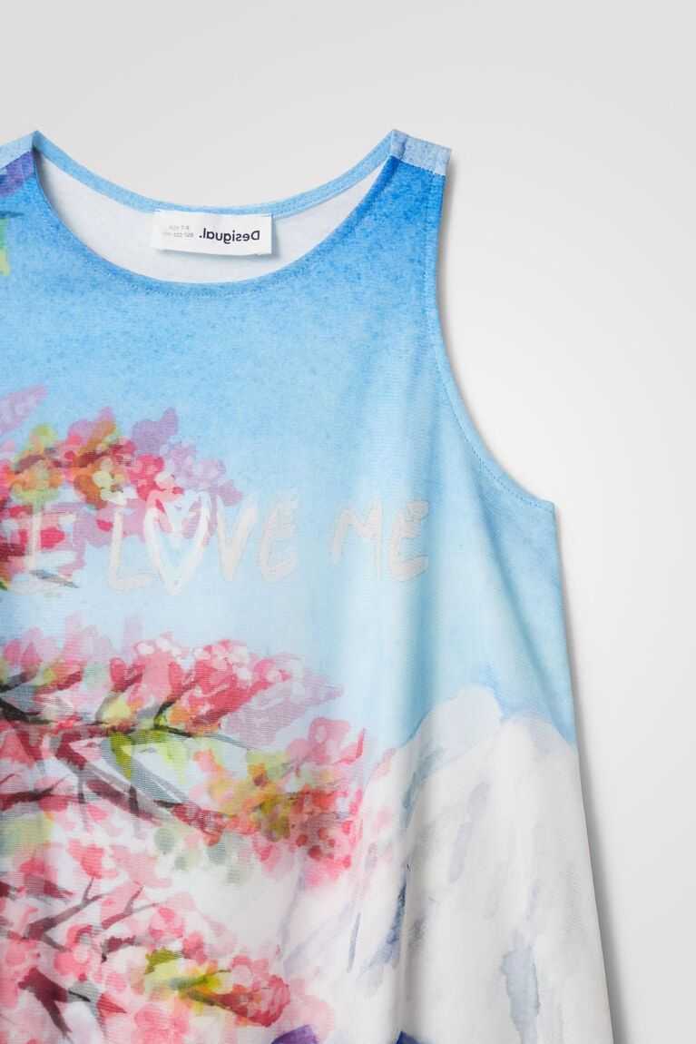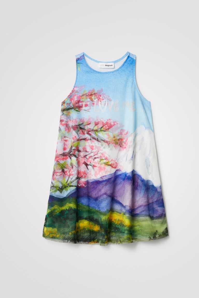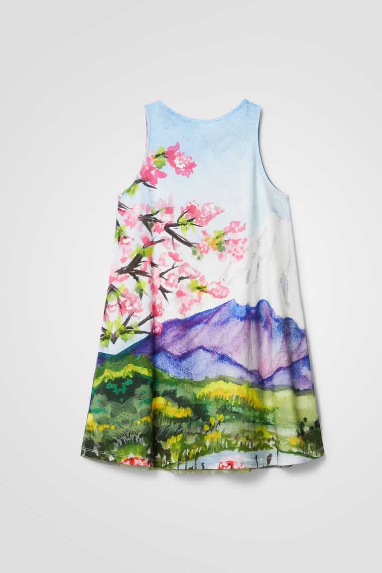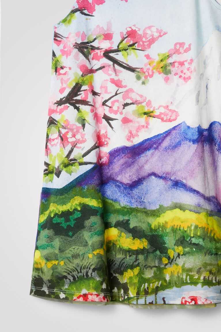 A-line sleeveless dress featuring a Japanese-inspired landscape with cherry blossoms. Made from BCI cotton.