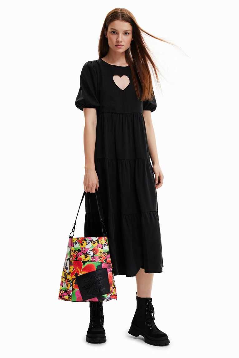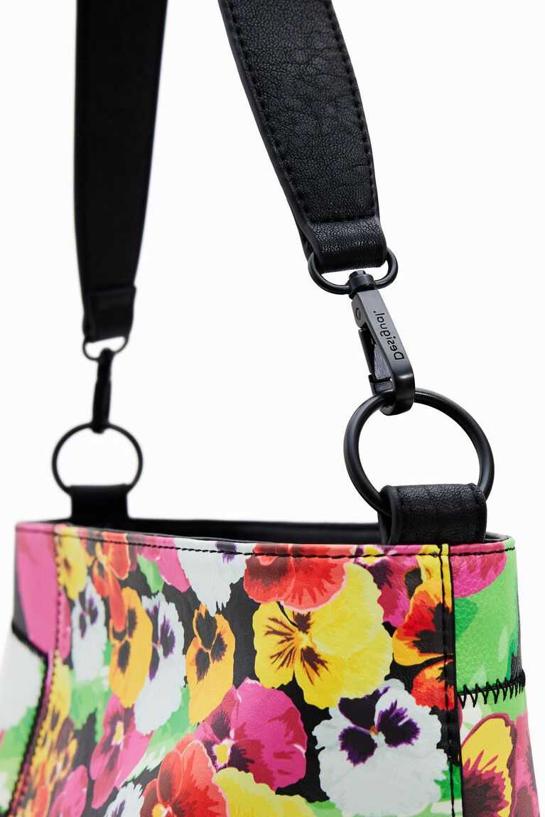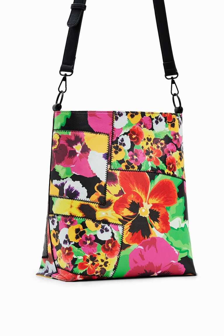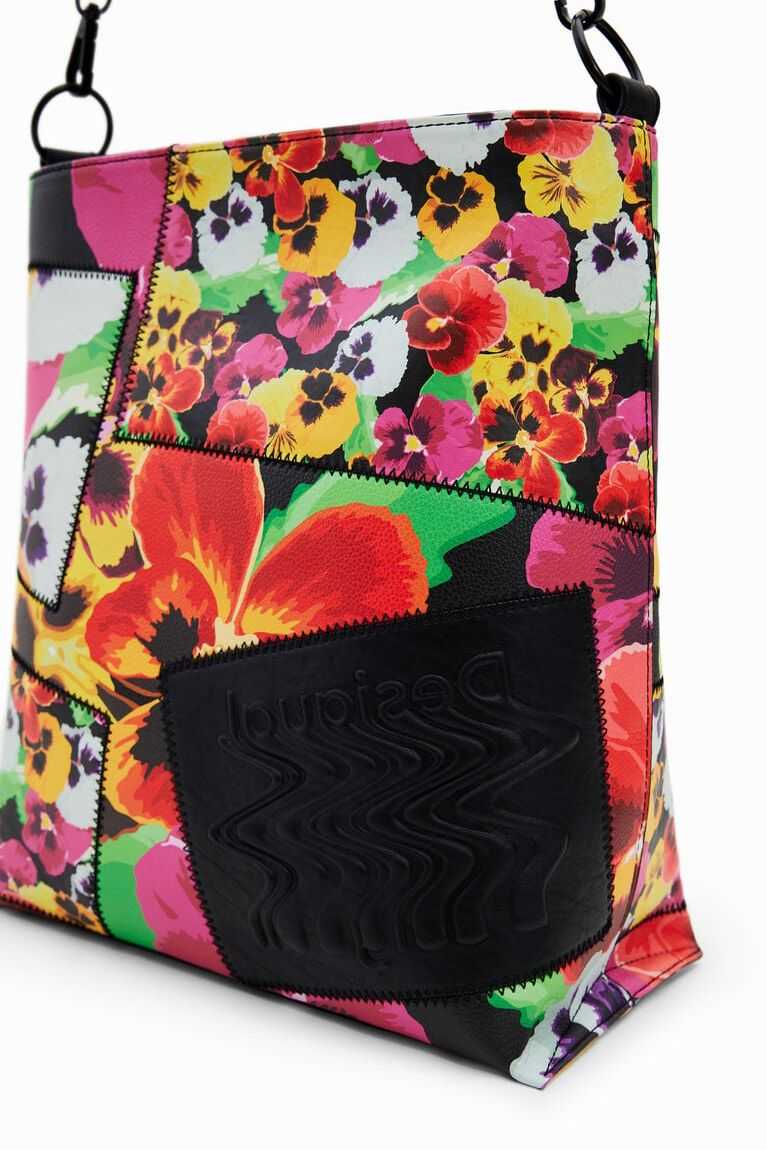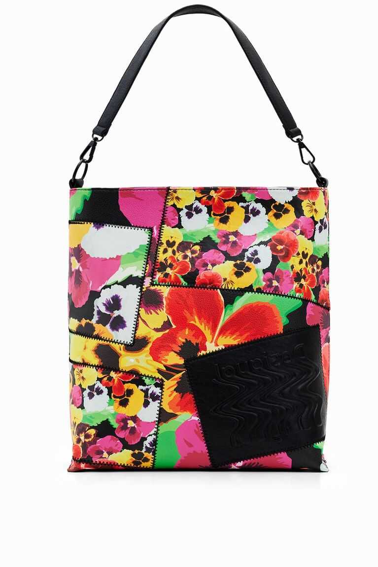 A spacious shoulder bag with a patchwork of textured faux leather with flowers in various sizes. Very versatile and lightweight, includes two straps.