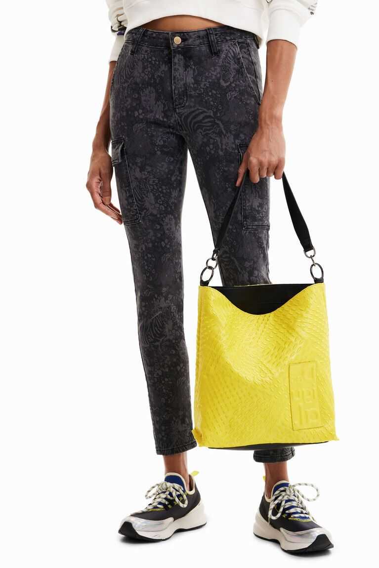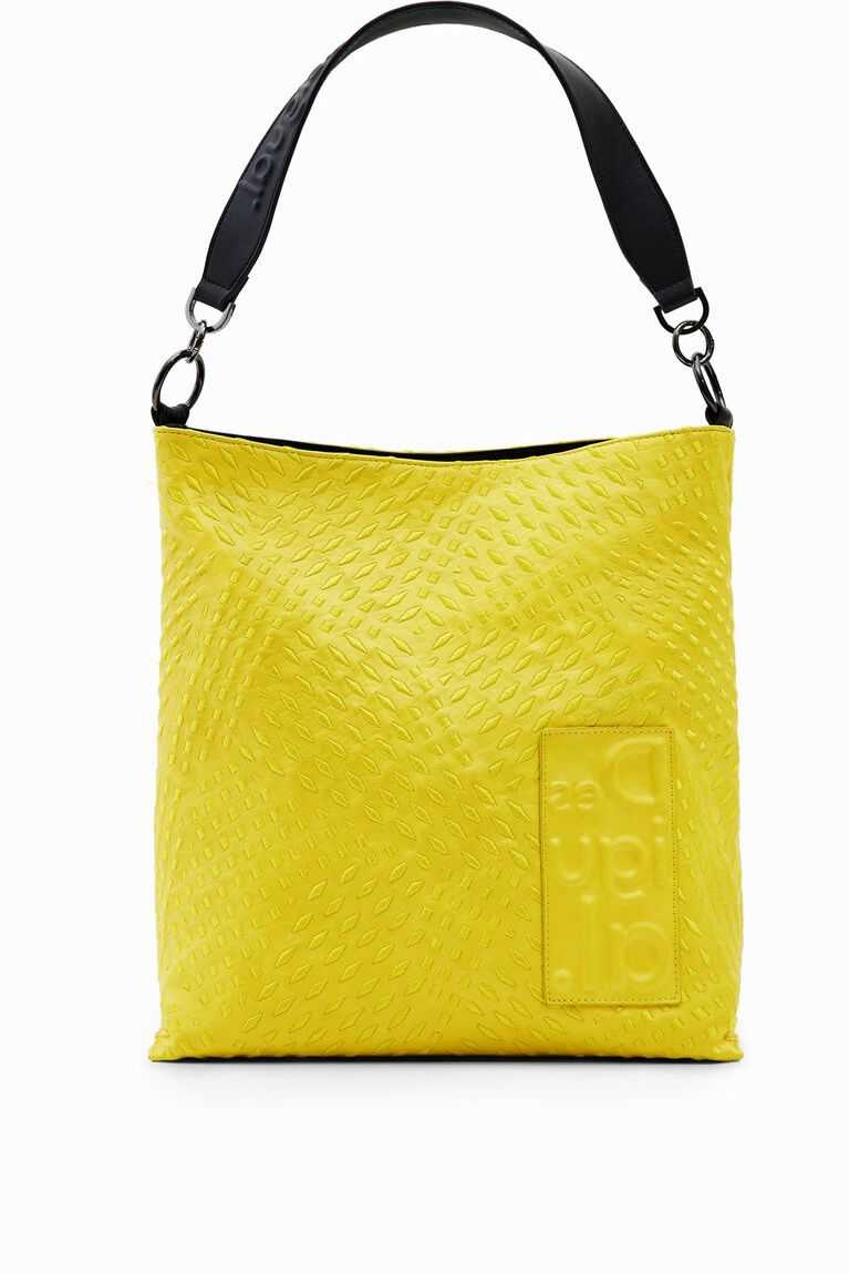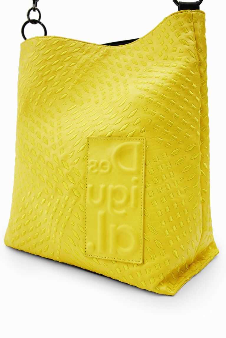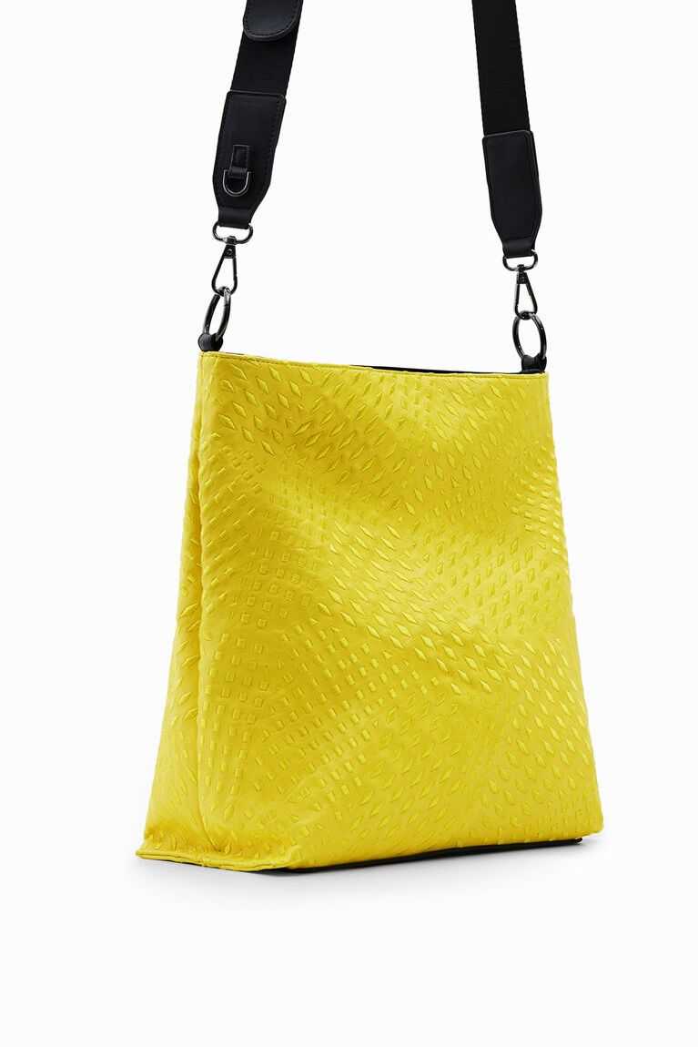 A spacious shoulder bag whose faux-leather exterior is covered with a tone-on-tone geometric die-cut. Featuring three straps for versatility.