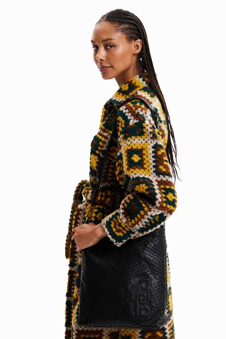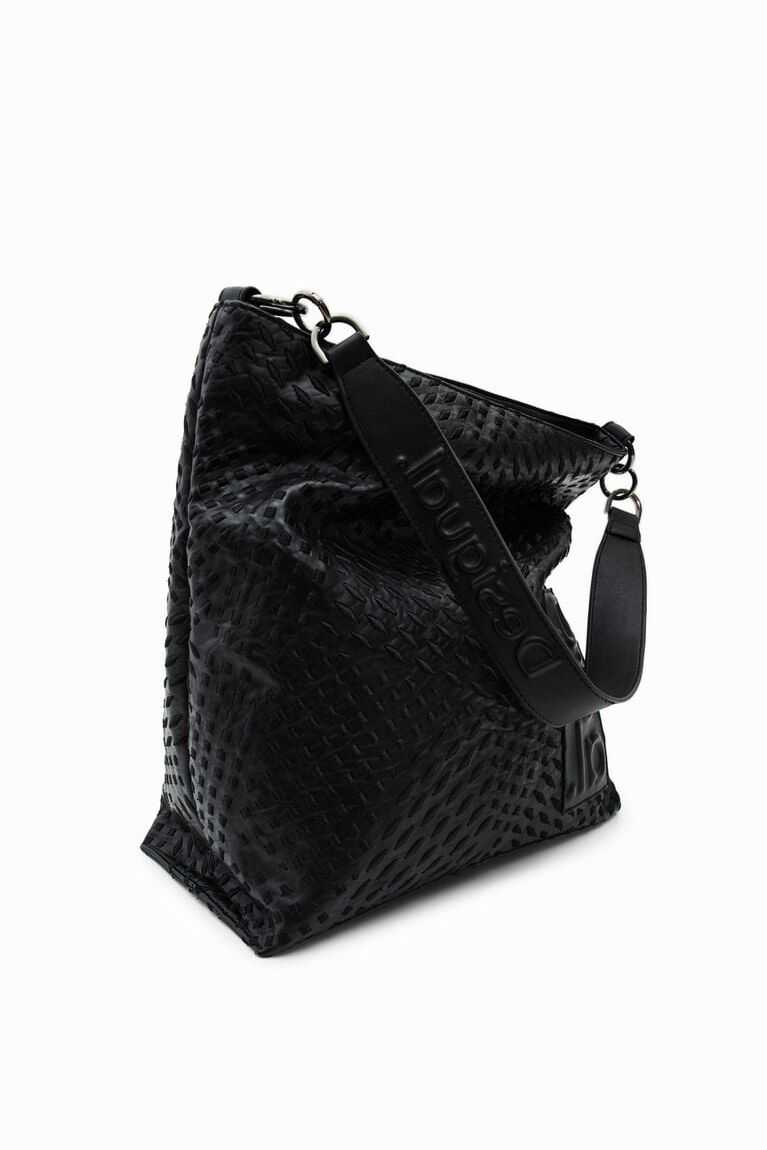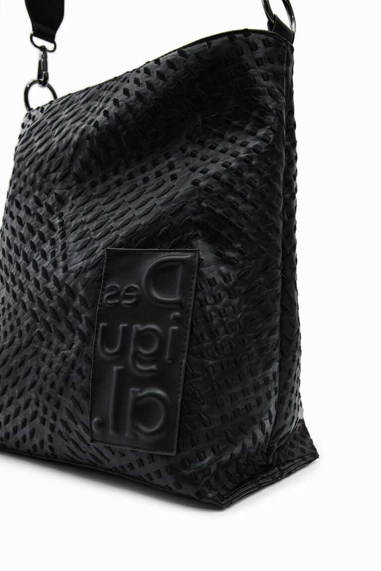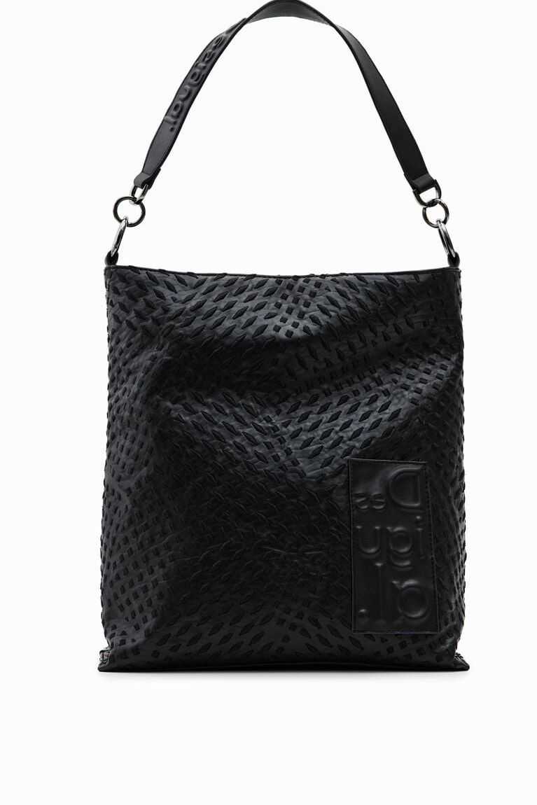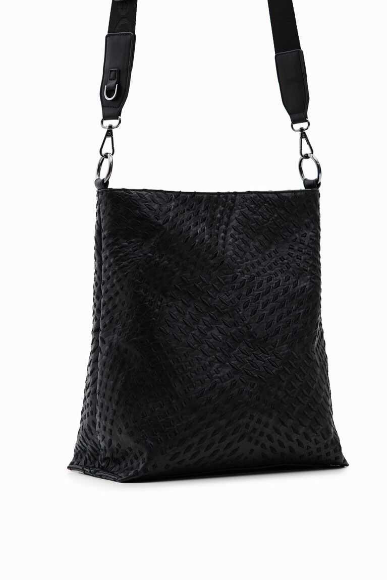 A spacious shoulder bag whose faux-leather exterior is covered with a tone-on-tone geometric die-cut. Featuring three straps for versatility.