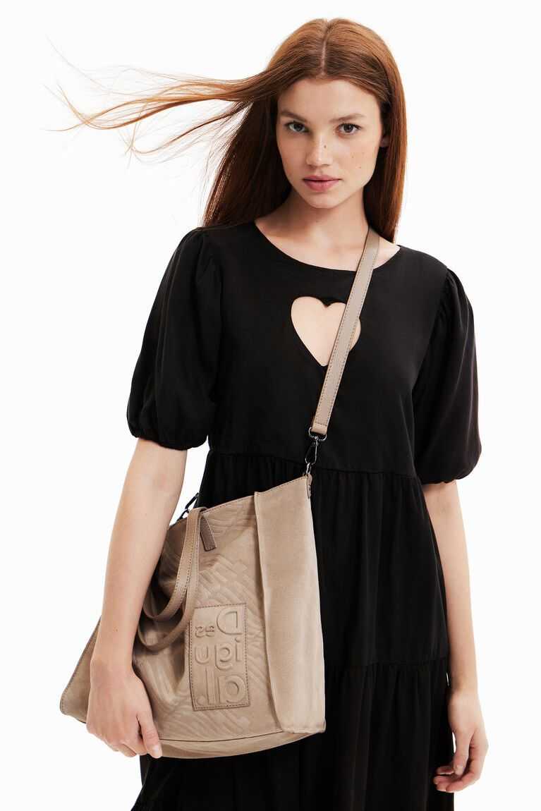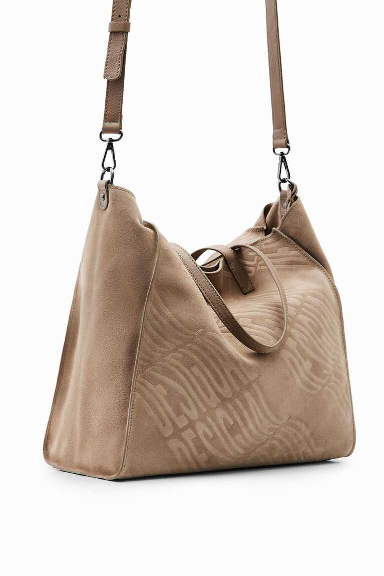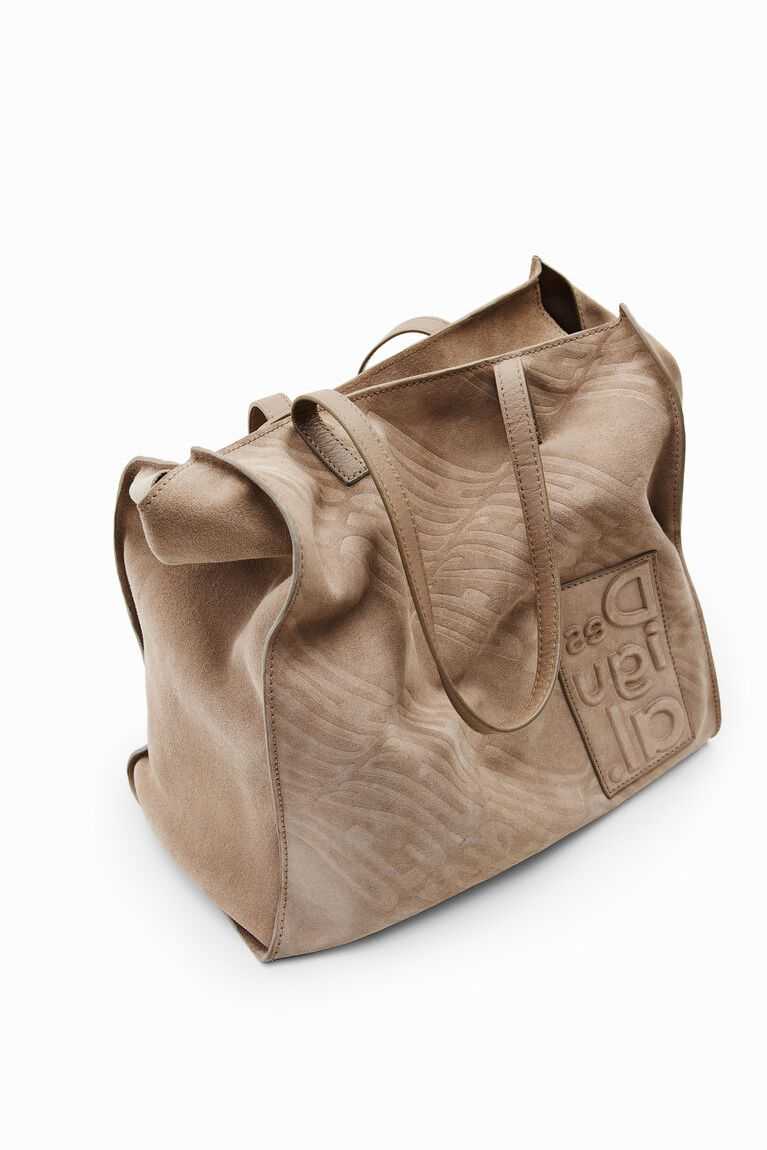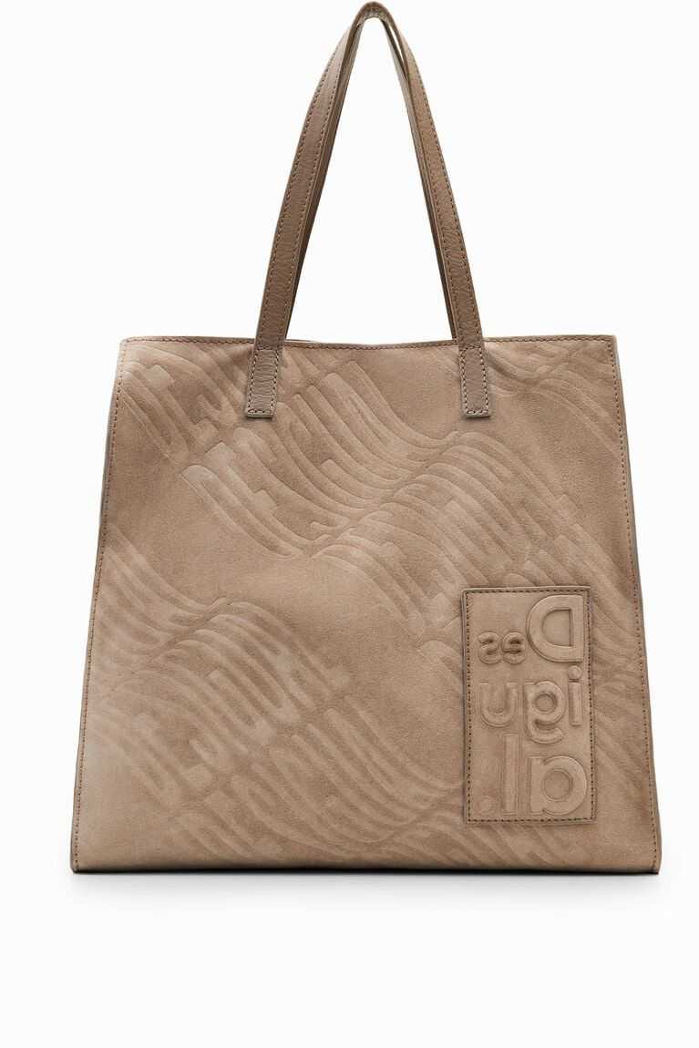 A large-capacity square shopper bag made from certified leather with a psychedelic logos. Features a toiletry-style inner bag.