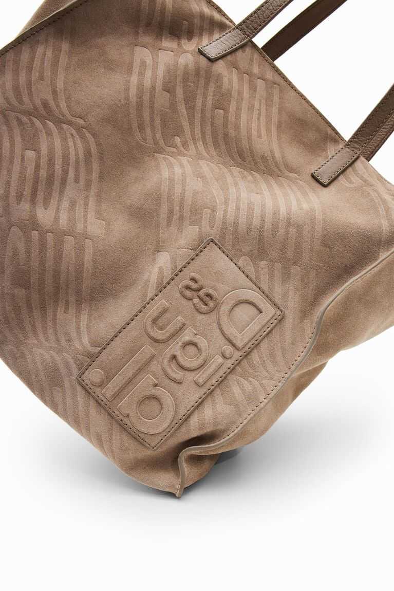 A large-capacity square shopper bag made from certified leather with a psychedelic logos. Features a toiletry-style inner bag.