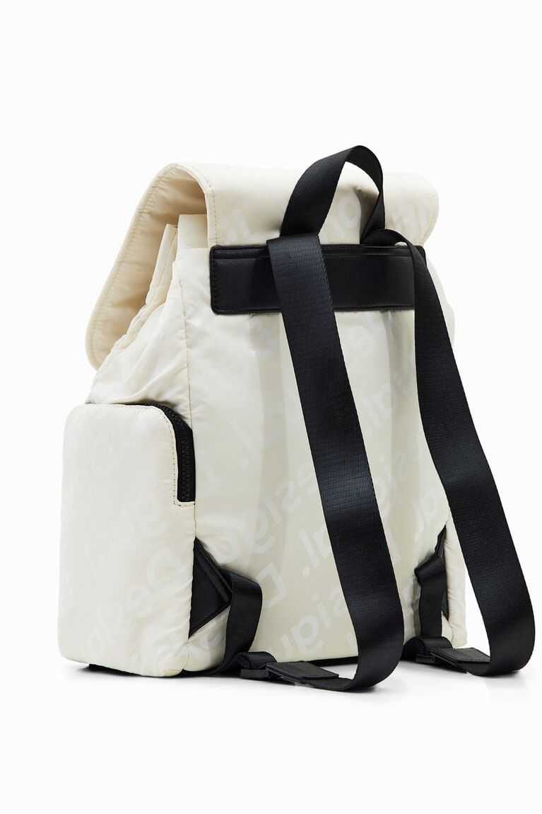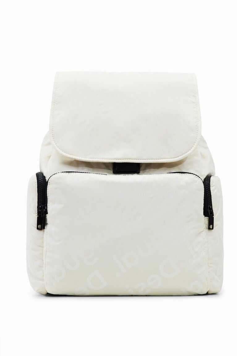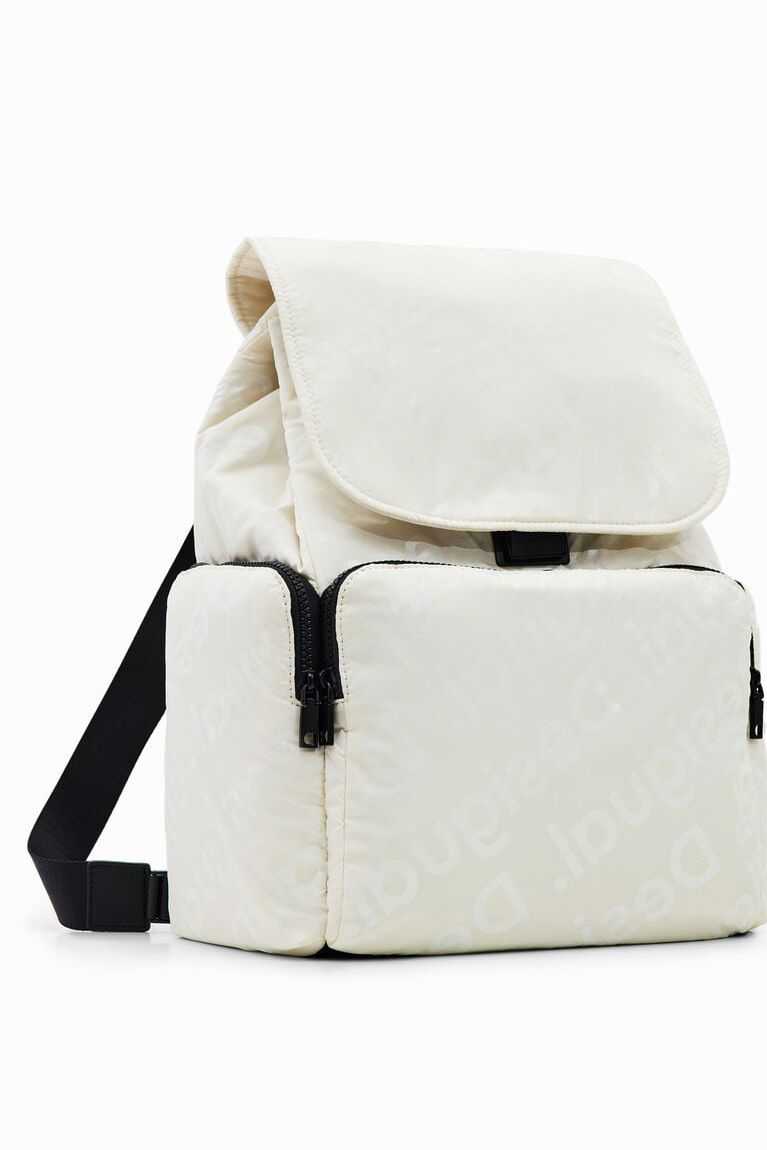 Large backpack with three outside pockets and a spacious interior. Covered in large iridescent logos. Very light and flexible.