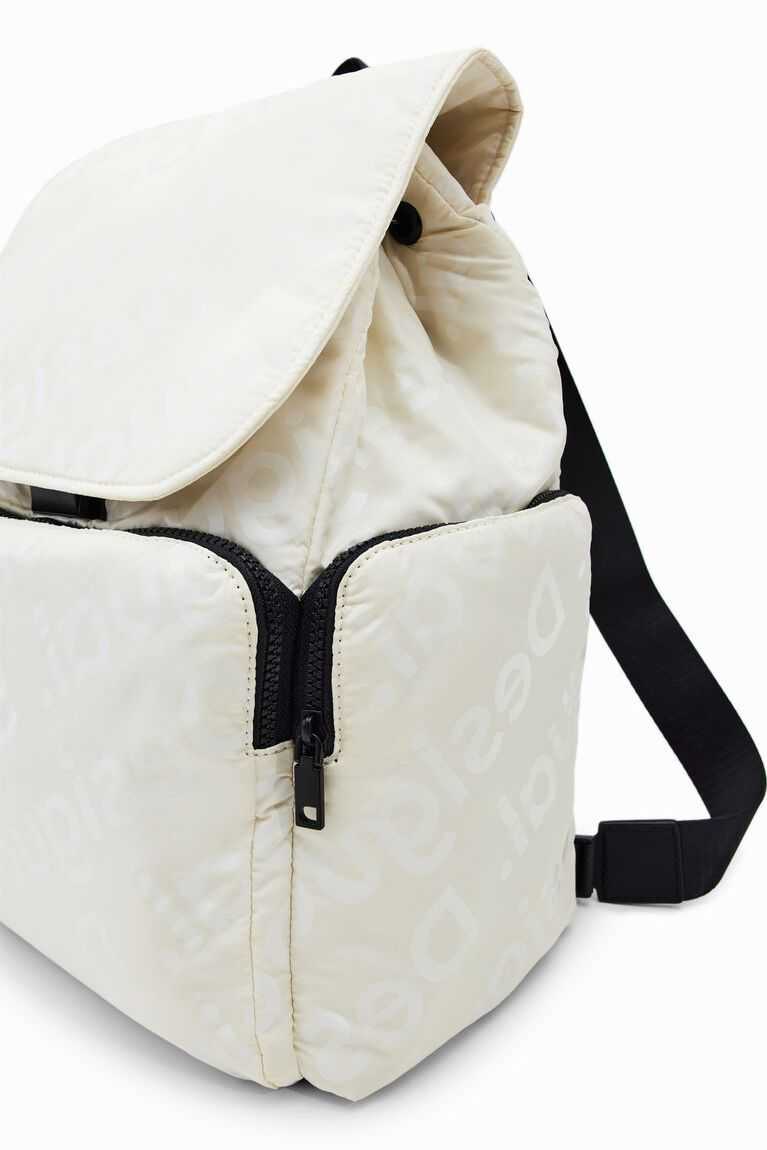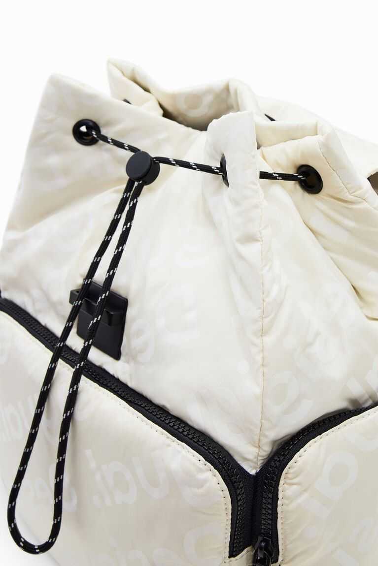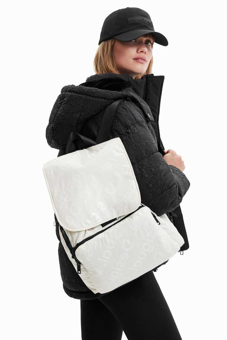 Large backpack with three outside pockets and a spacious interior. Covered in large iridescent logos. Very light and flexible.