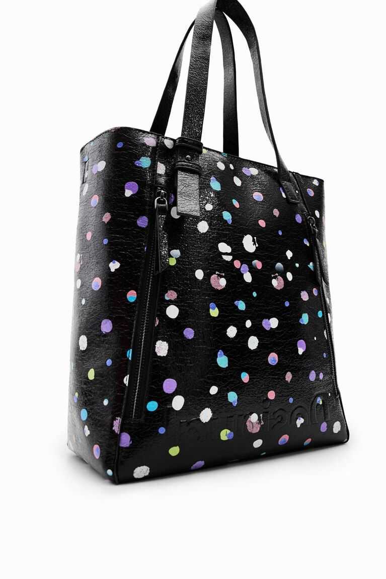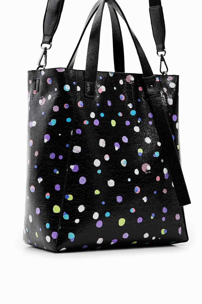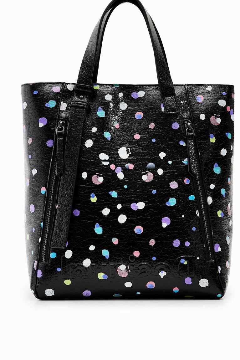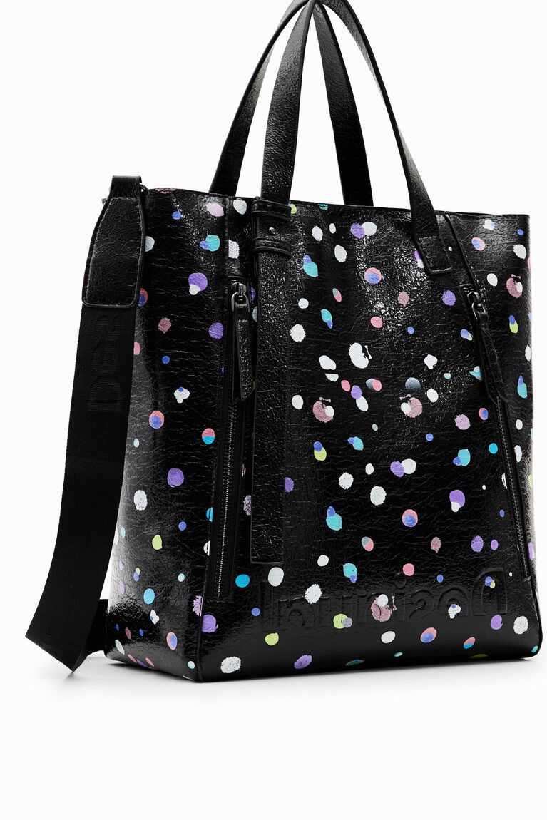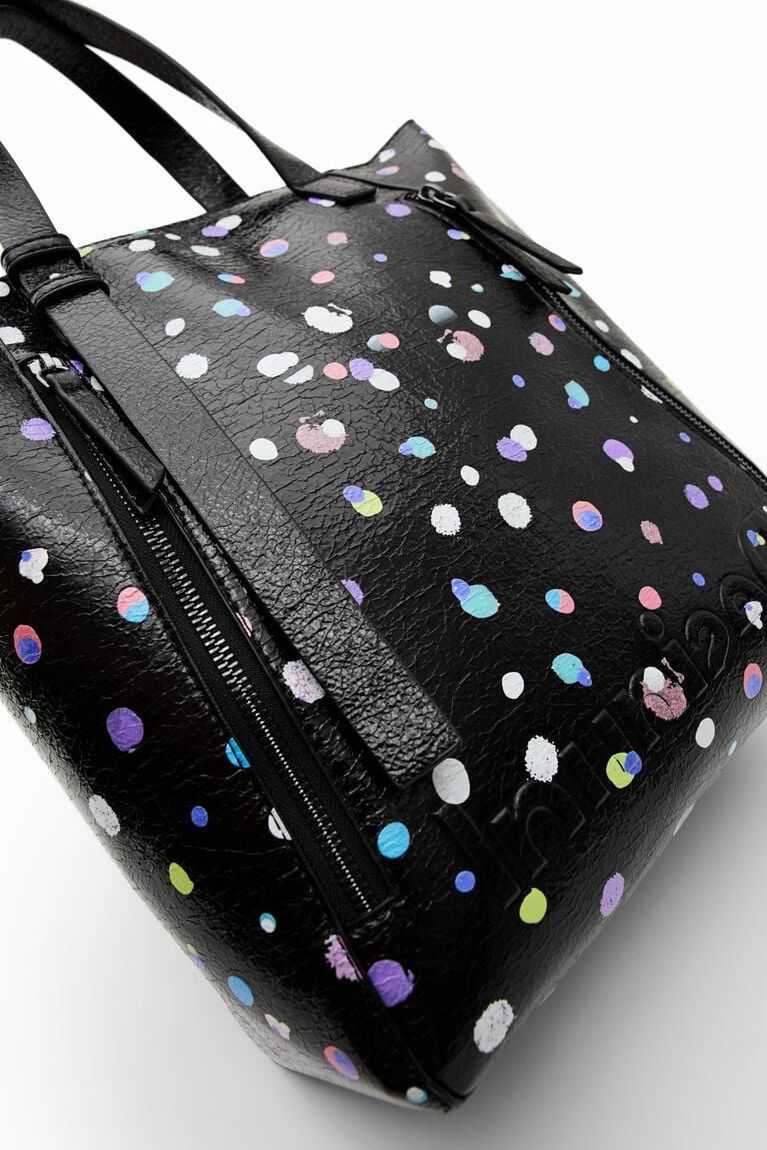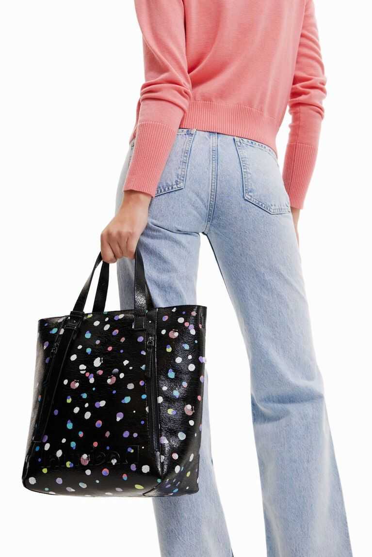 A shopper bag in black with a very arty and colourful polka dot print on the outside. Featuring multiple pockets, this bag is very light and soft to the touch.