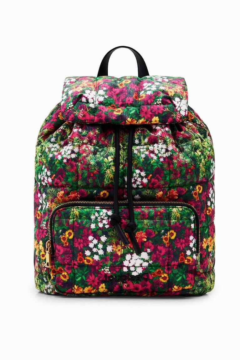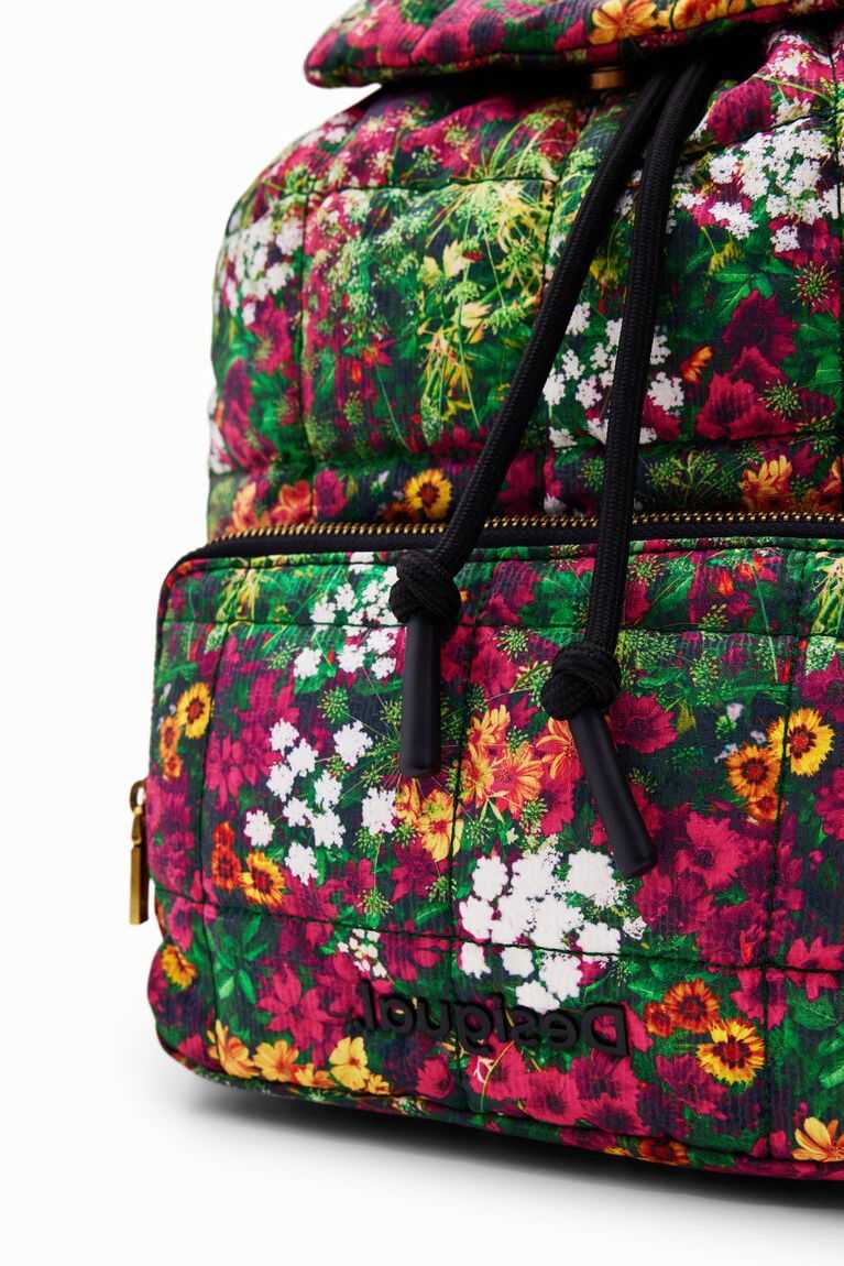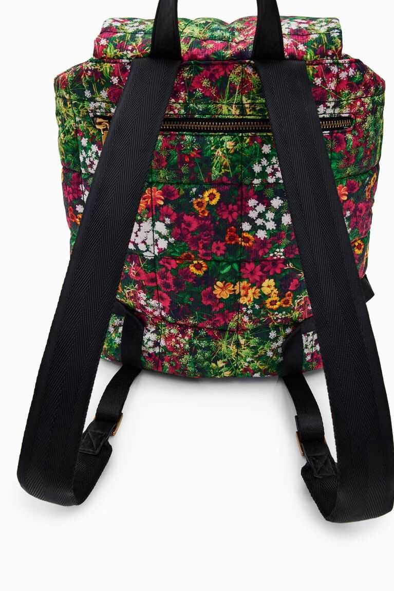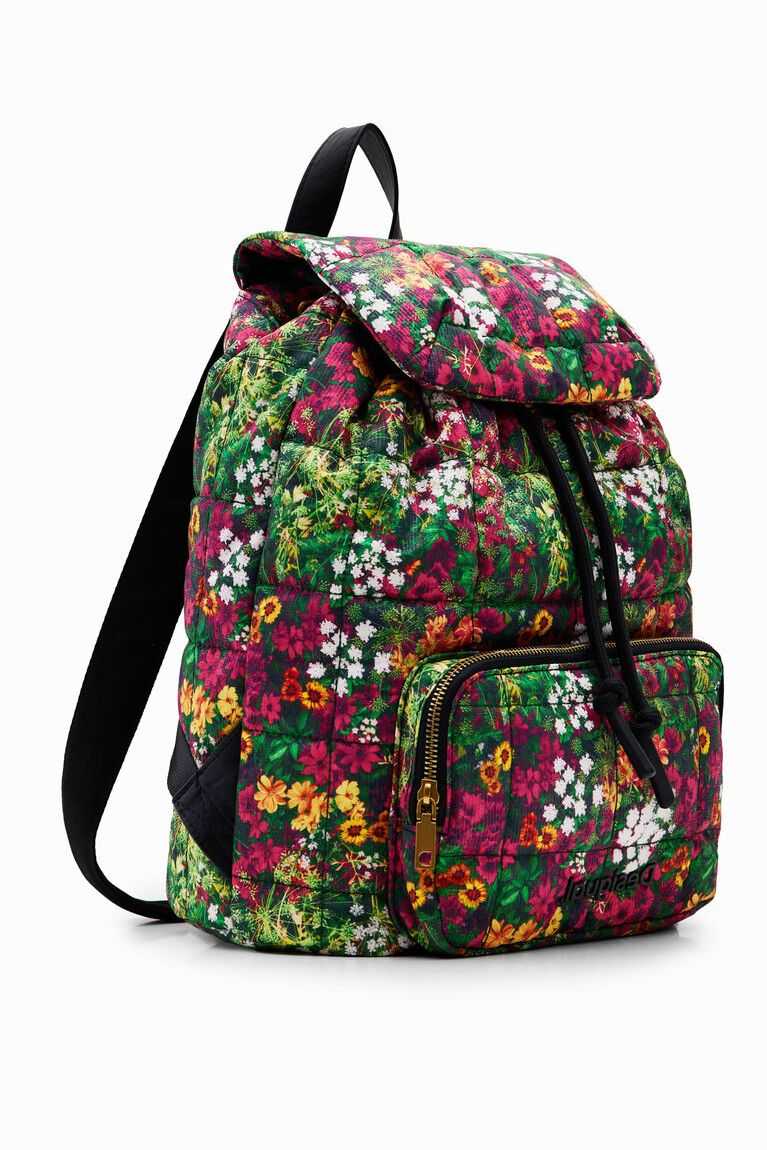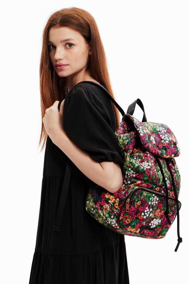 A large backpack made from recycled polyester with a large capacity and incredible lightness. With a print of small flowers and a drawstring and flap closure.