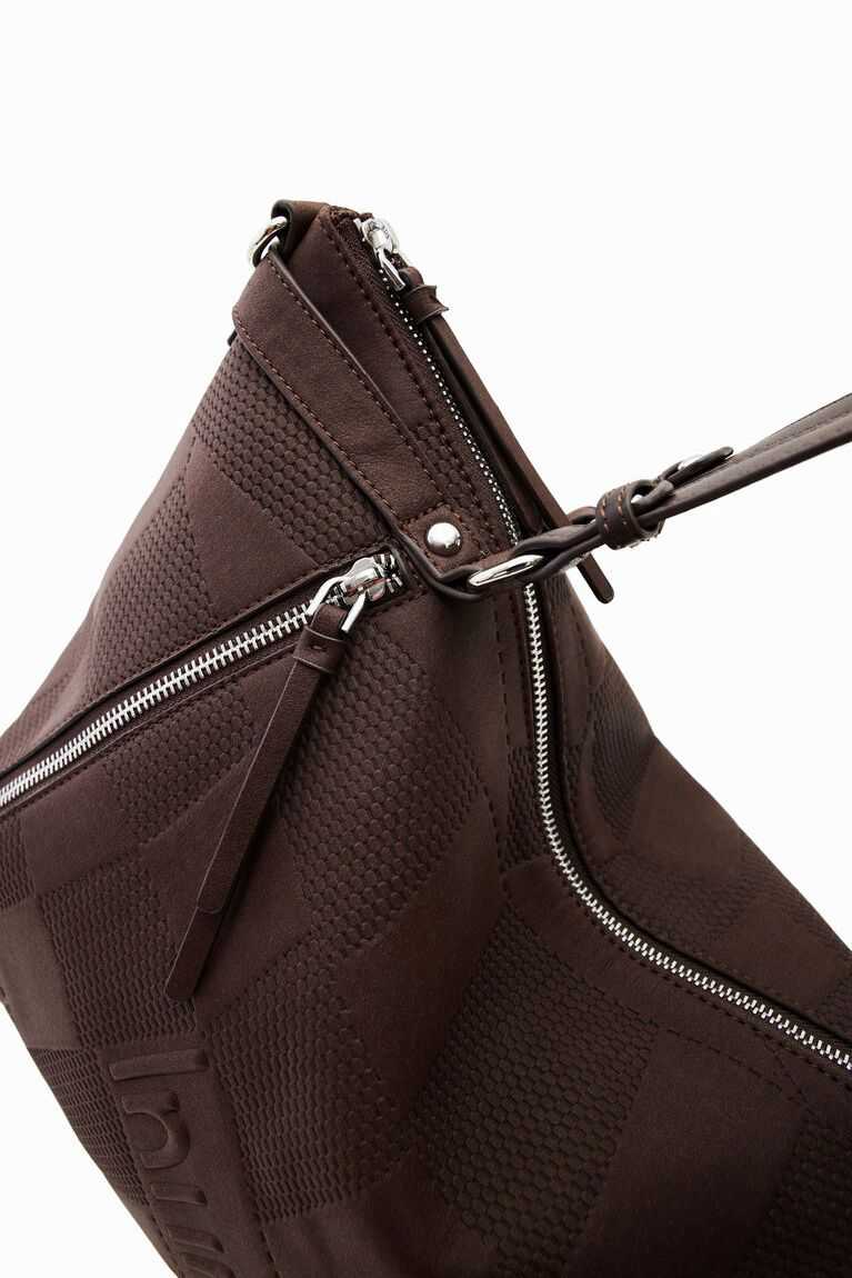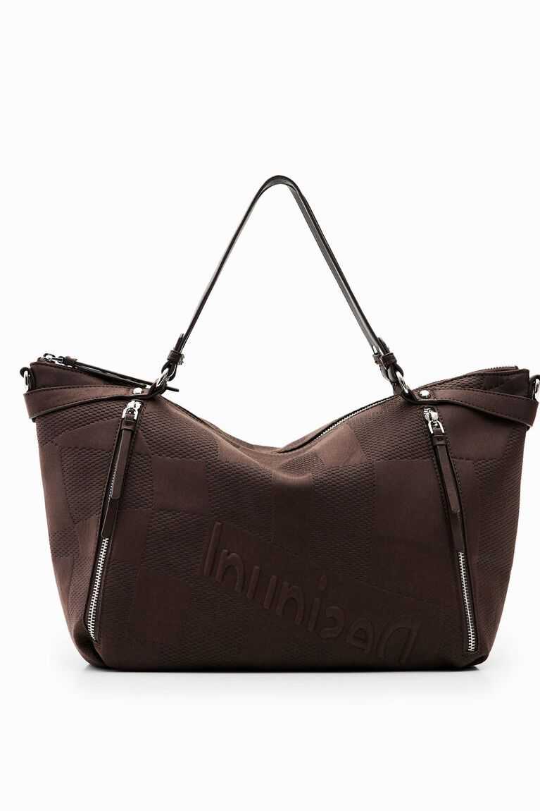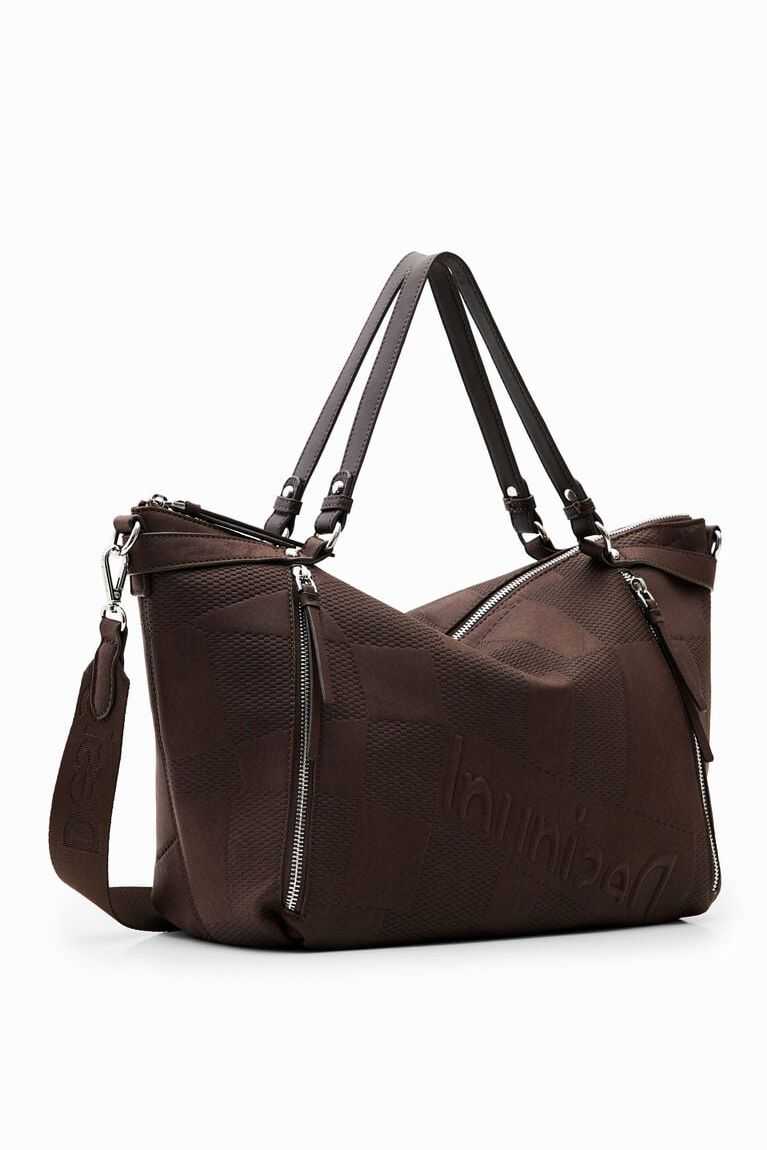A large handbag with multiple handles for better versatility. The exterior is made from faux leather with patch and logo textures.