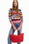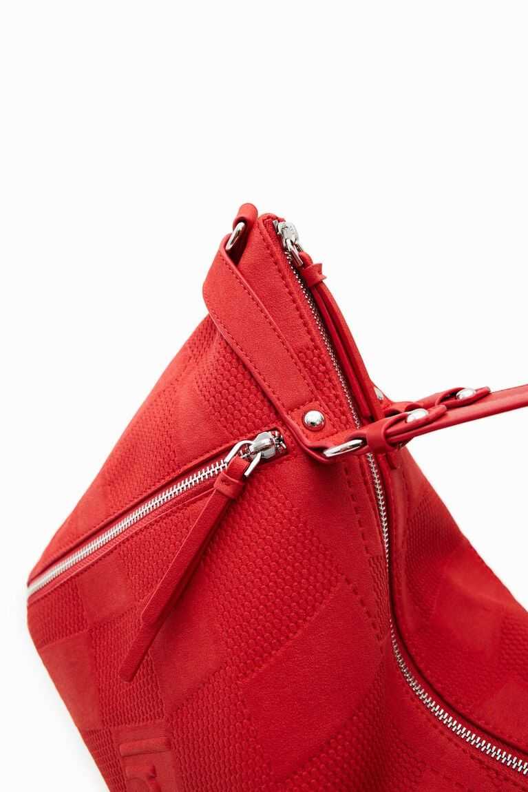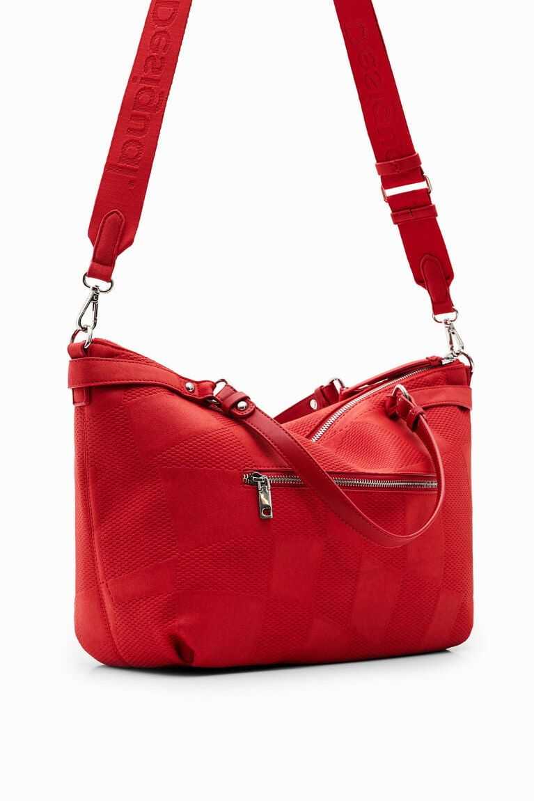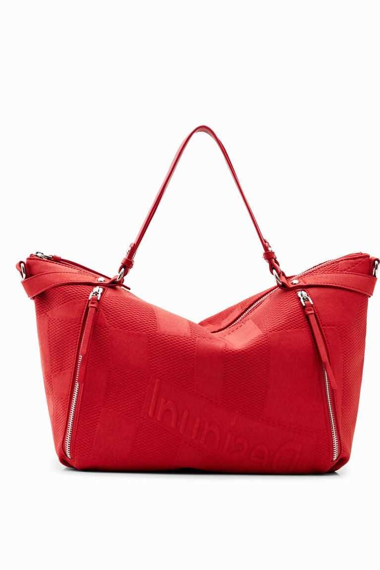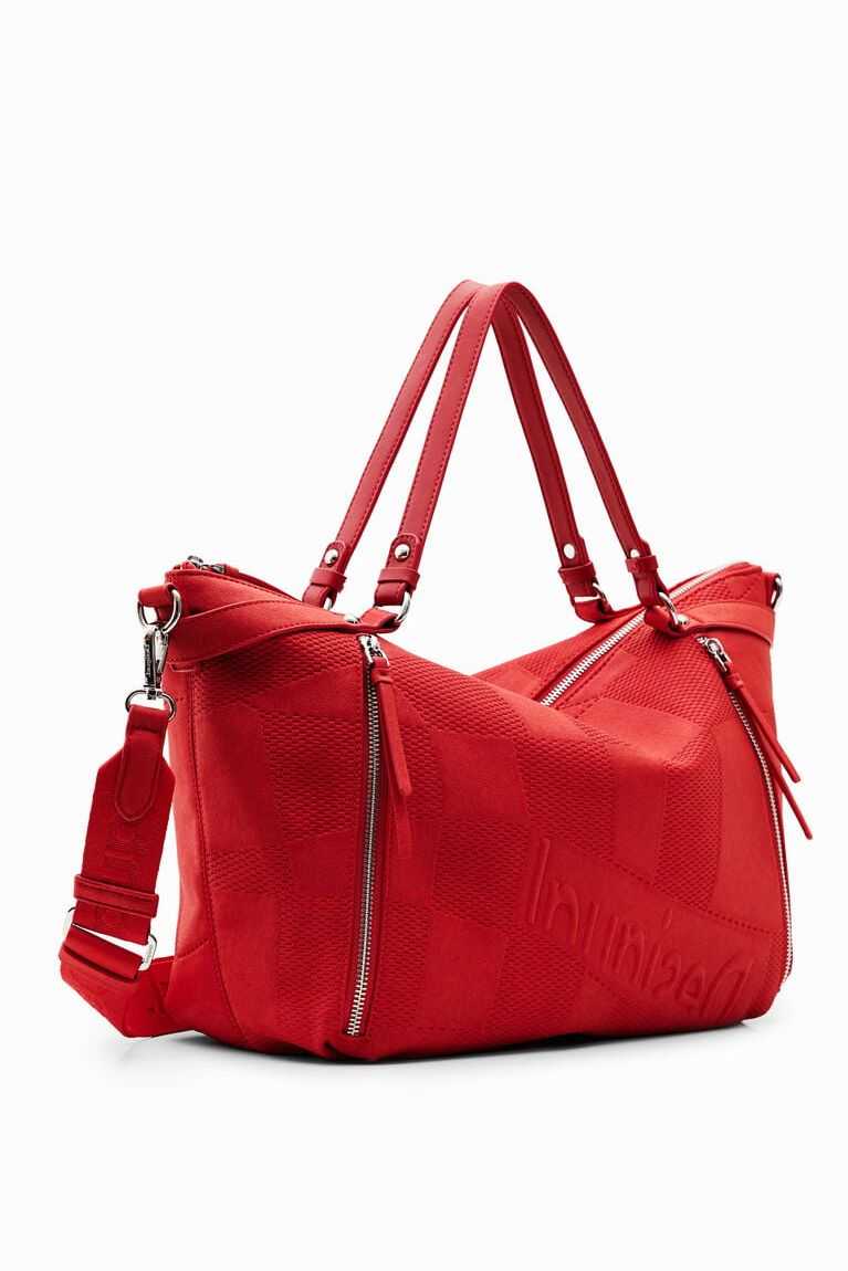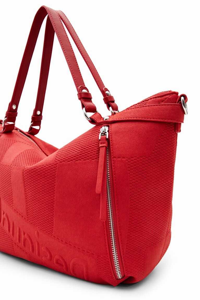 A large handbag with multiple handles for better versatility. The exterior is made from faux leather with patch and logo textures.