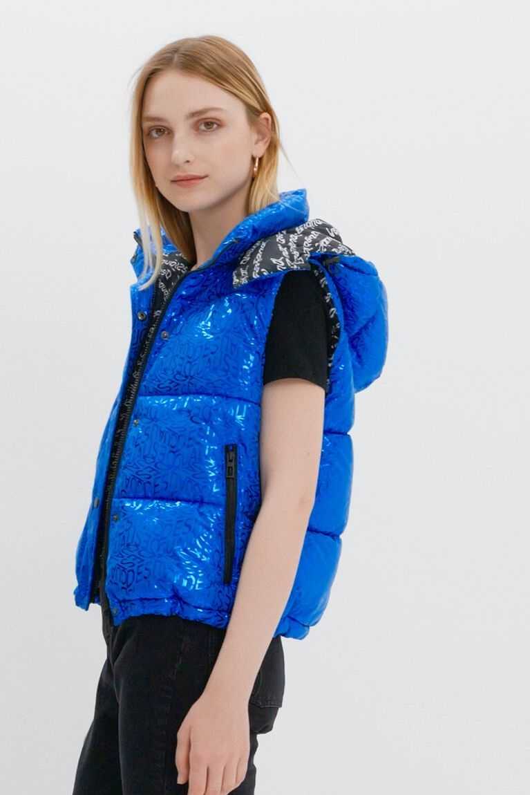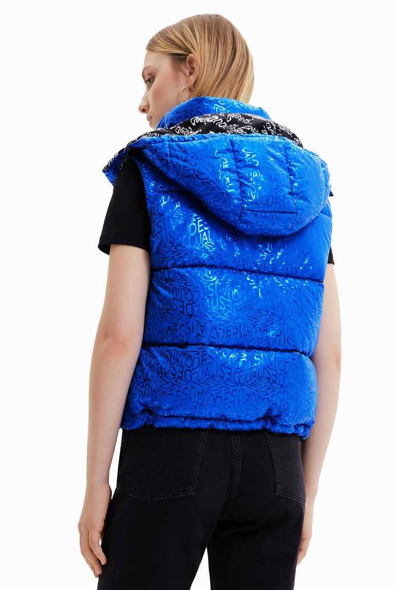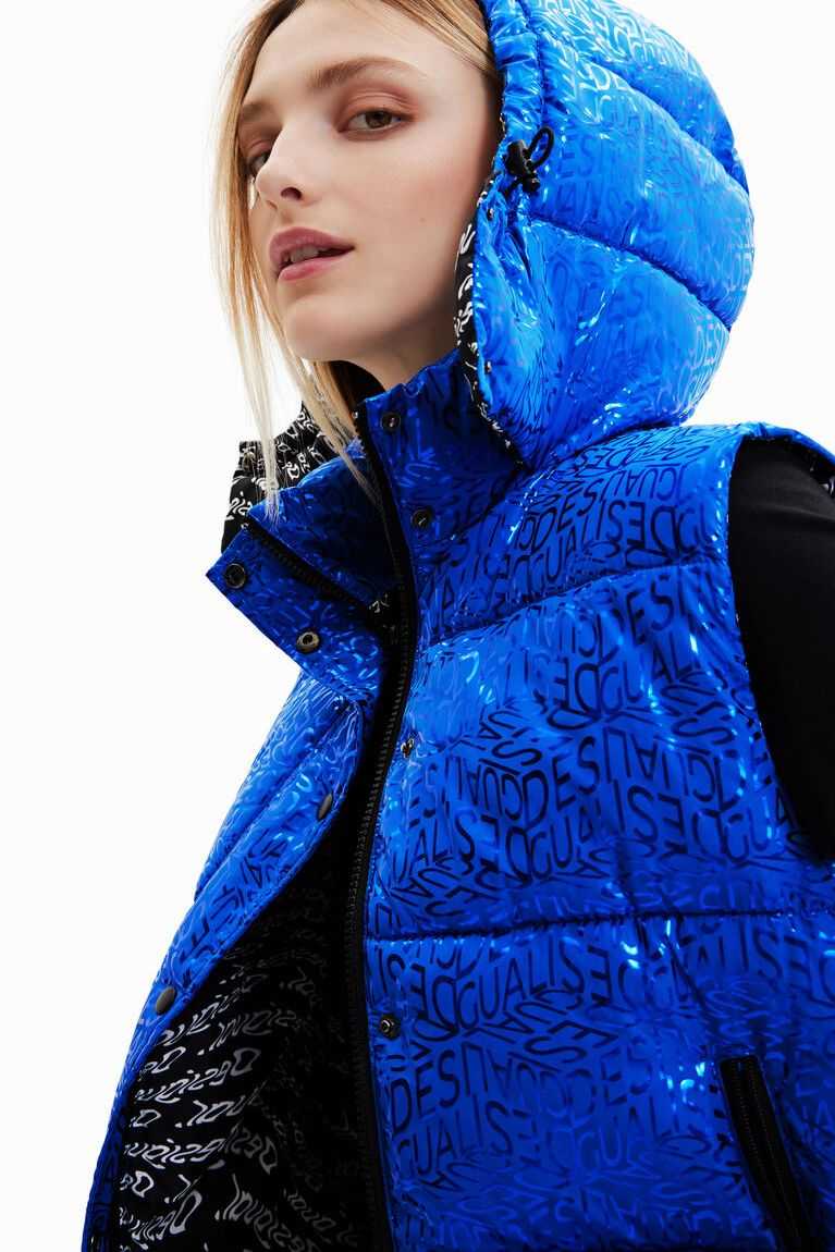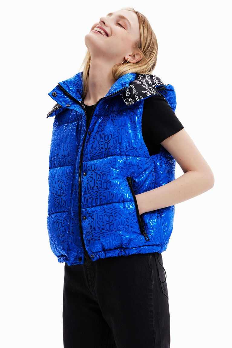 This short quilted gilet is a very special garment thanks to its shiny logo print, hooded collar and cold-proof recycled padded fabric.