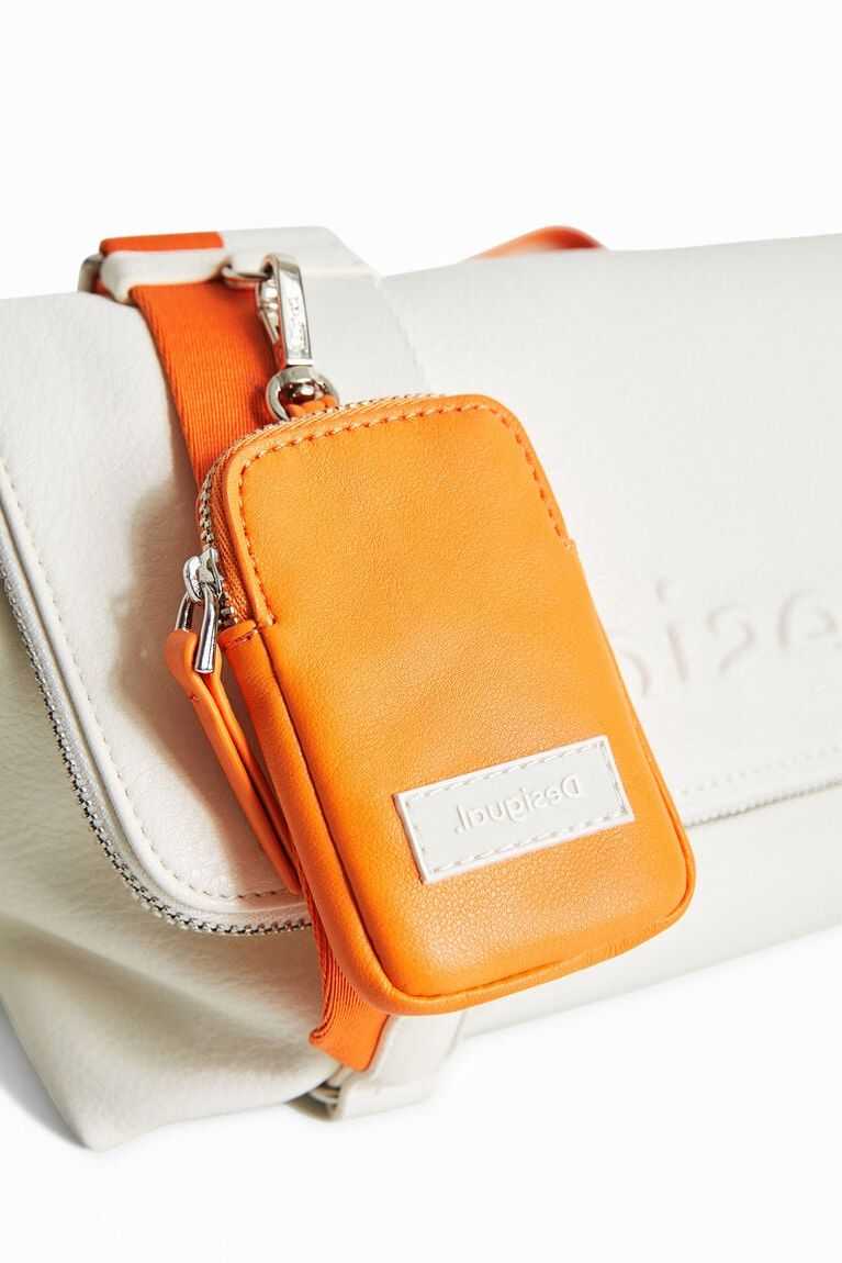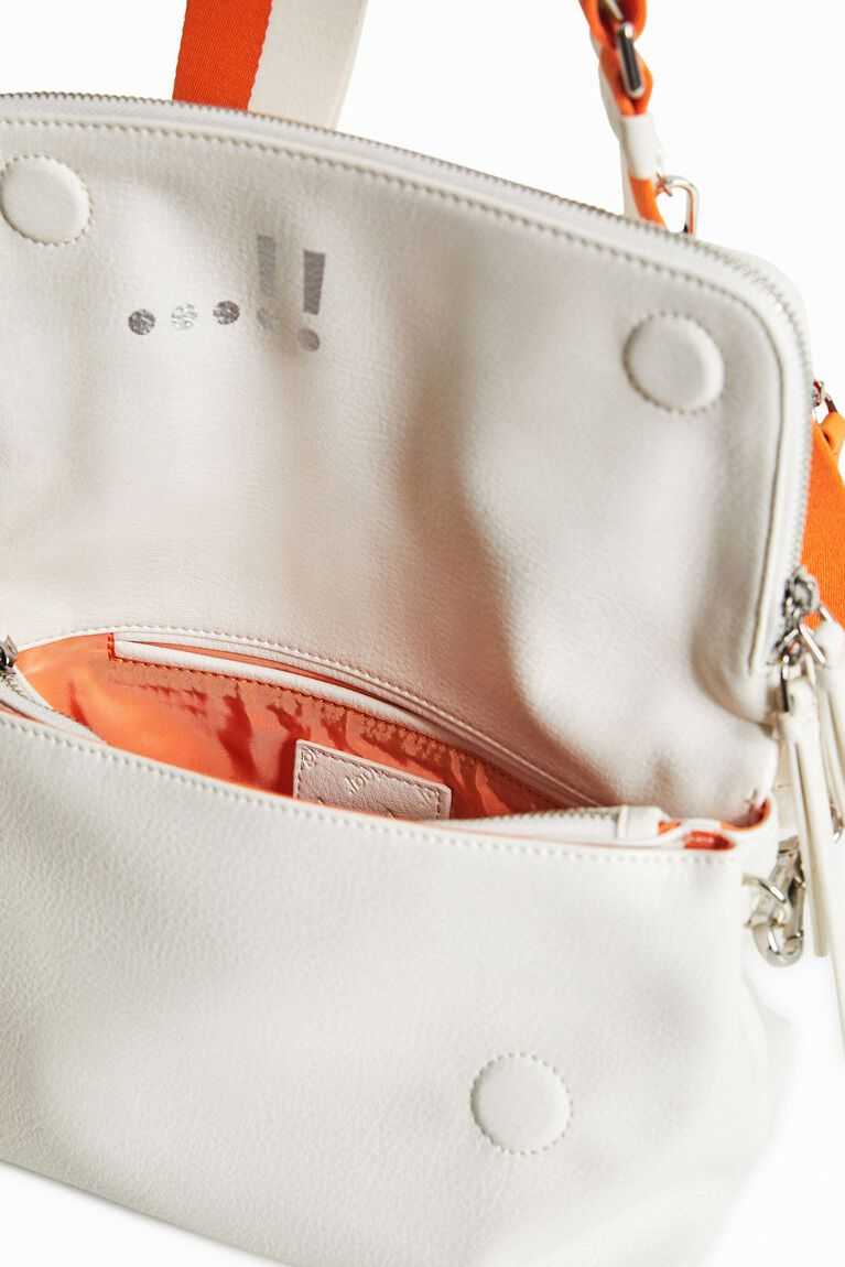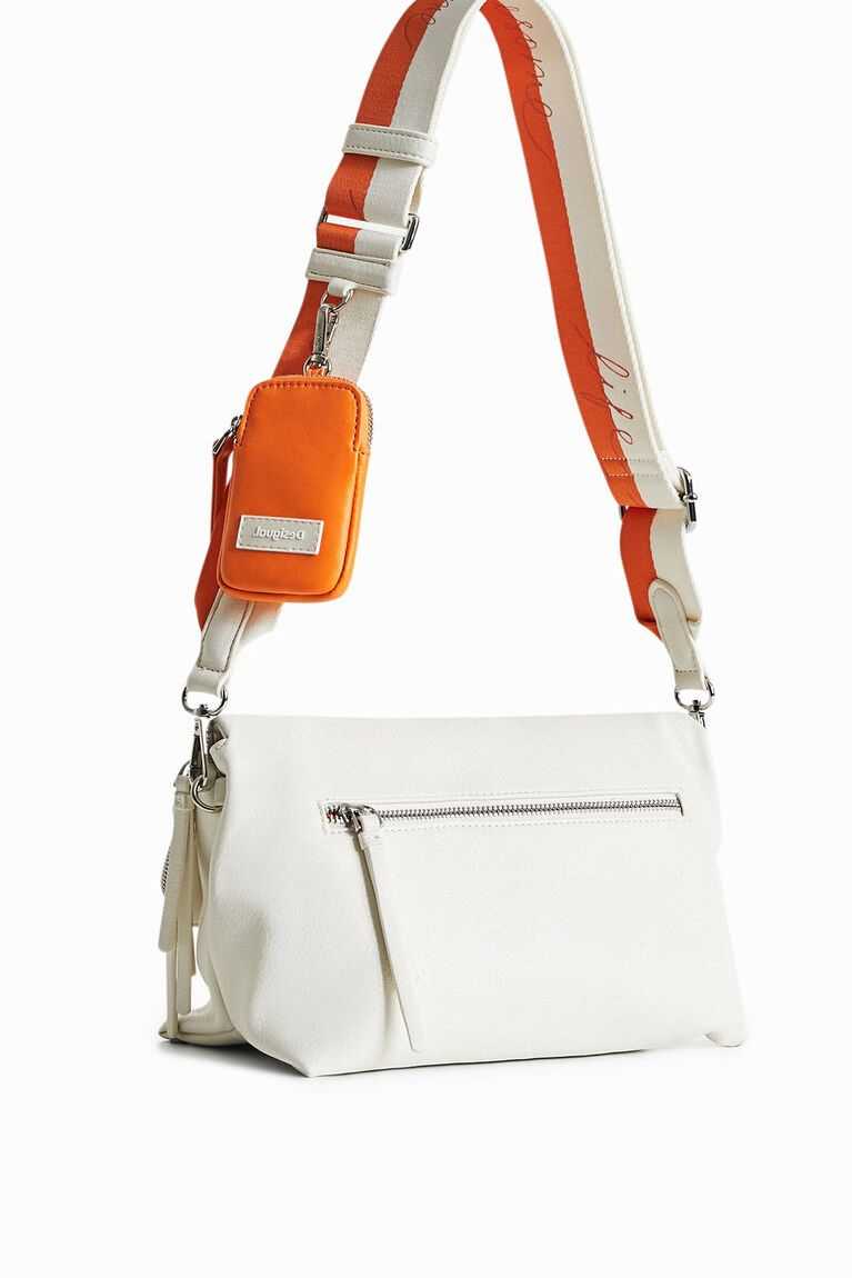An embossed logo and very comfortable fabric on a white multi-pocket sling with various straps.