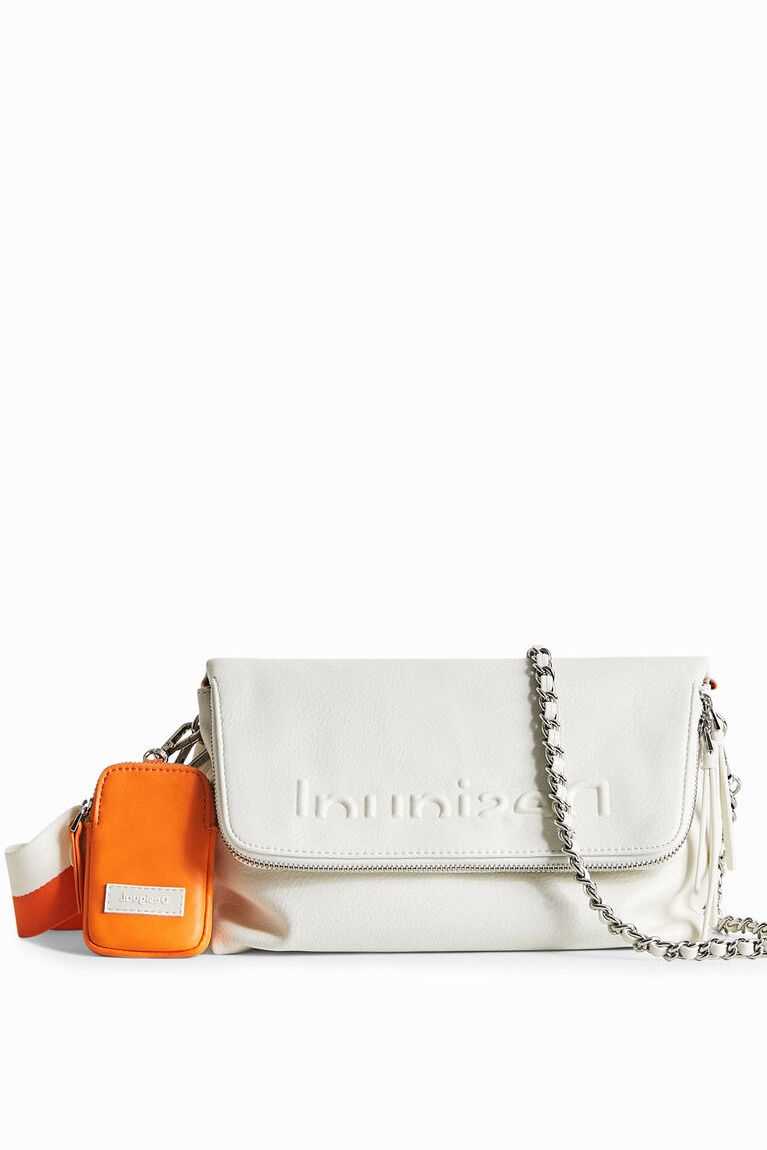 An embossed logo and very comfortable fabric on a white multi-pocket sling with various straps.