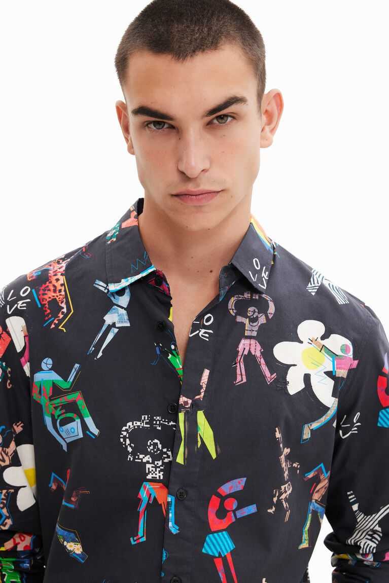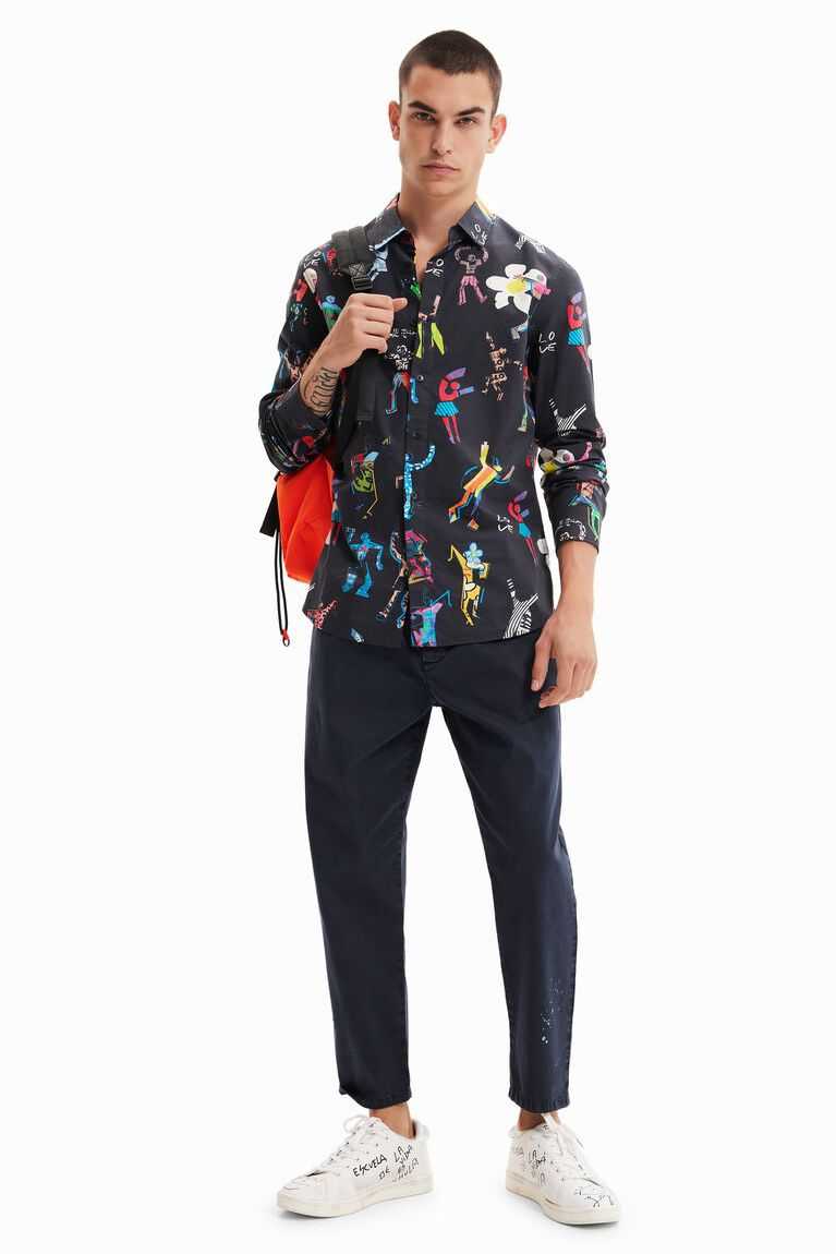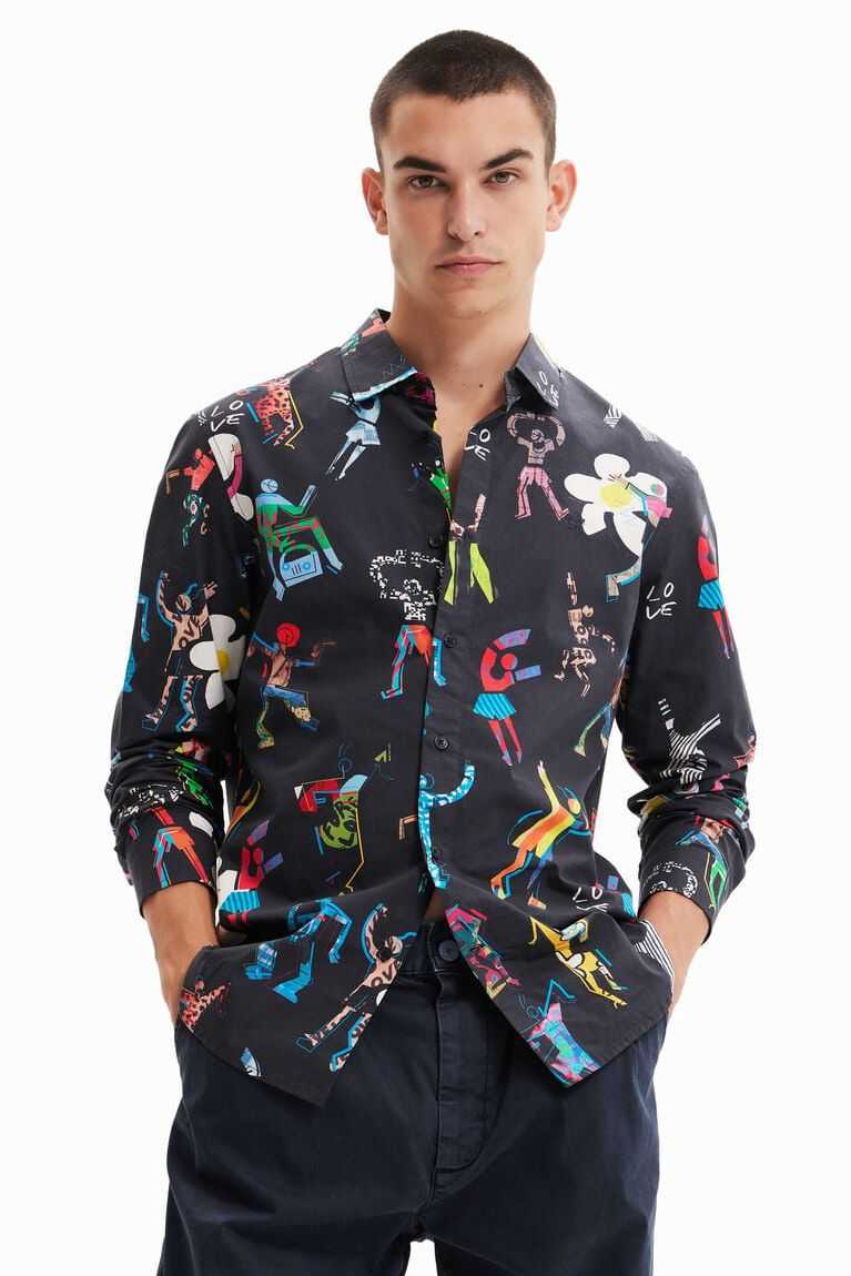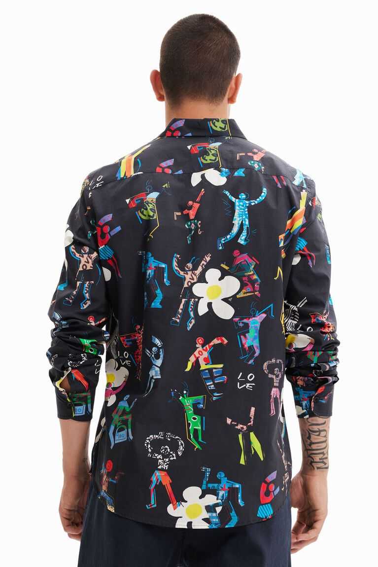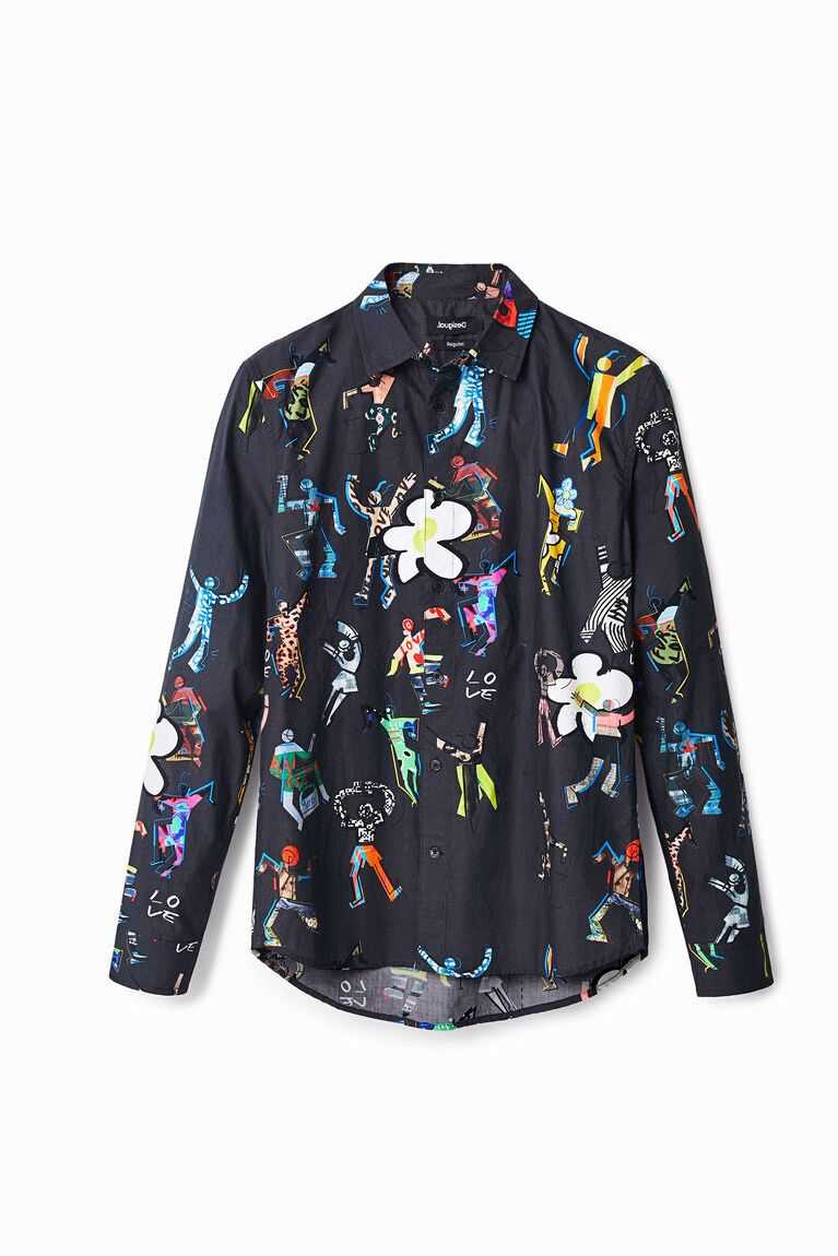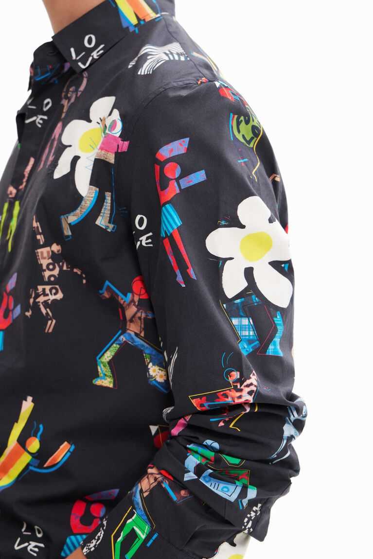 A long-sleeve shirt, made from cotton, with an all-over print of dancing figures in full colour mixed with daisies.